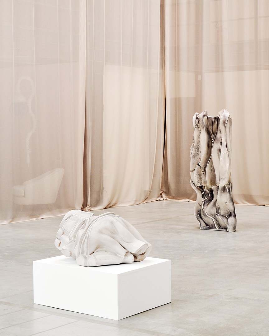 Among the exhibited works is a precious vase-sculpture characterized by an abstract decoration that dates to the 1950s and involves a quick stroke application of a glaze (done by soaking a rag and splashing it on the work in an action sculpture technique). This work belongs to the first but already fruitful period of Zauli’s career during which he won numerous international awards. In fact, it was in this decade that Zauli went beyond ceramics and researched techniques for working with stoneware fired at 1,200 degrees with white glazes and which became the precursors of the famous ‘Bianchi di Zauli.’ Most of the works chosen by Nilufar for the exhibit date to the 1960s, when Zauli moved away from the tradition of Faenza majolica and dedicated himself to artistic sculpture.