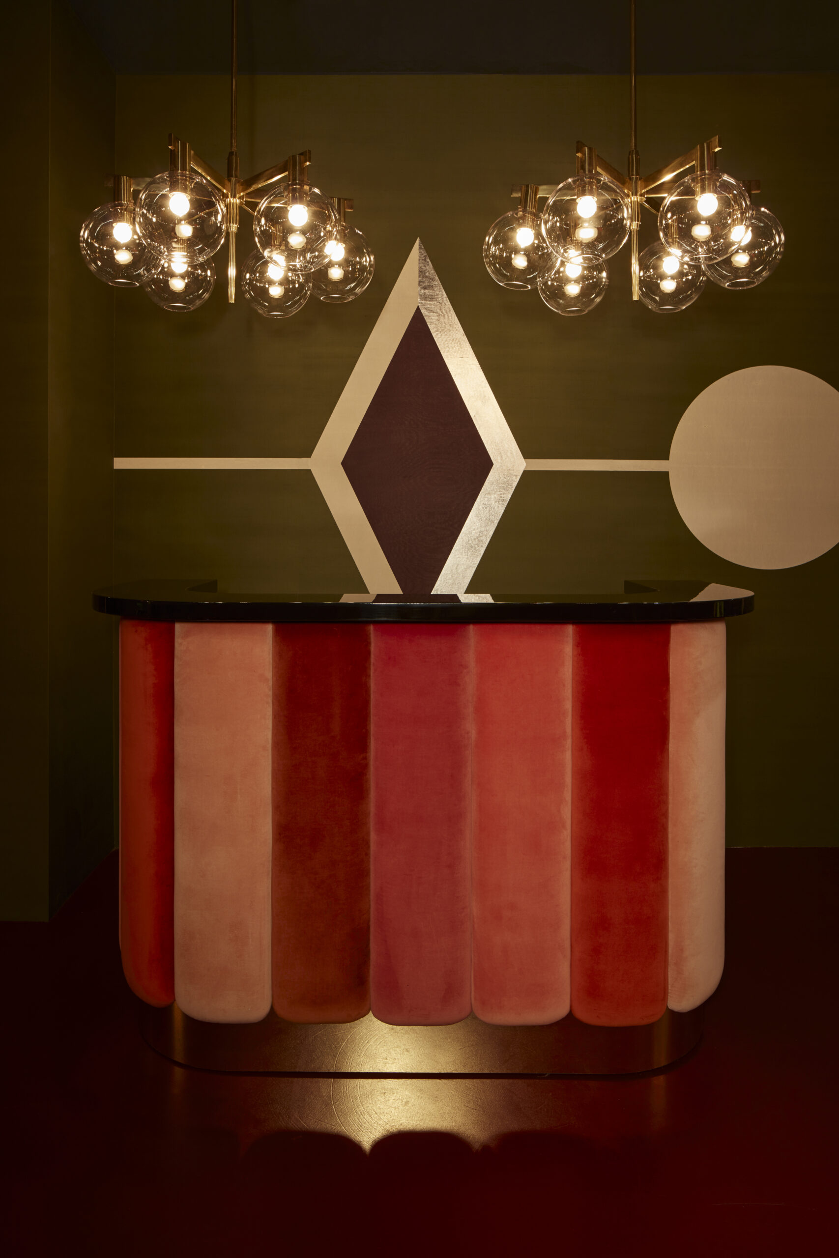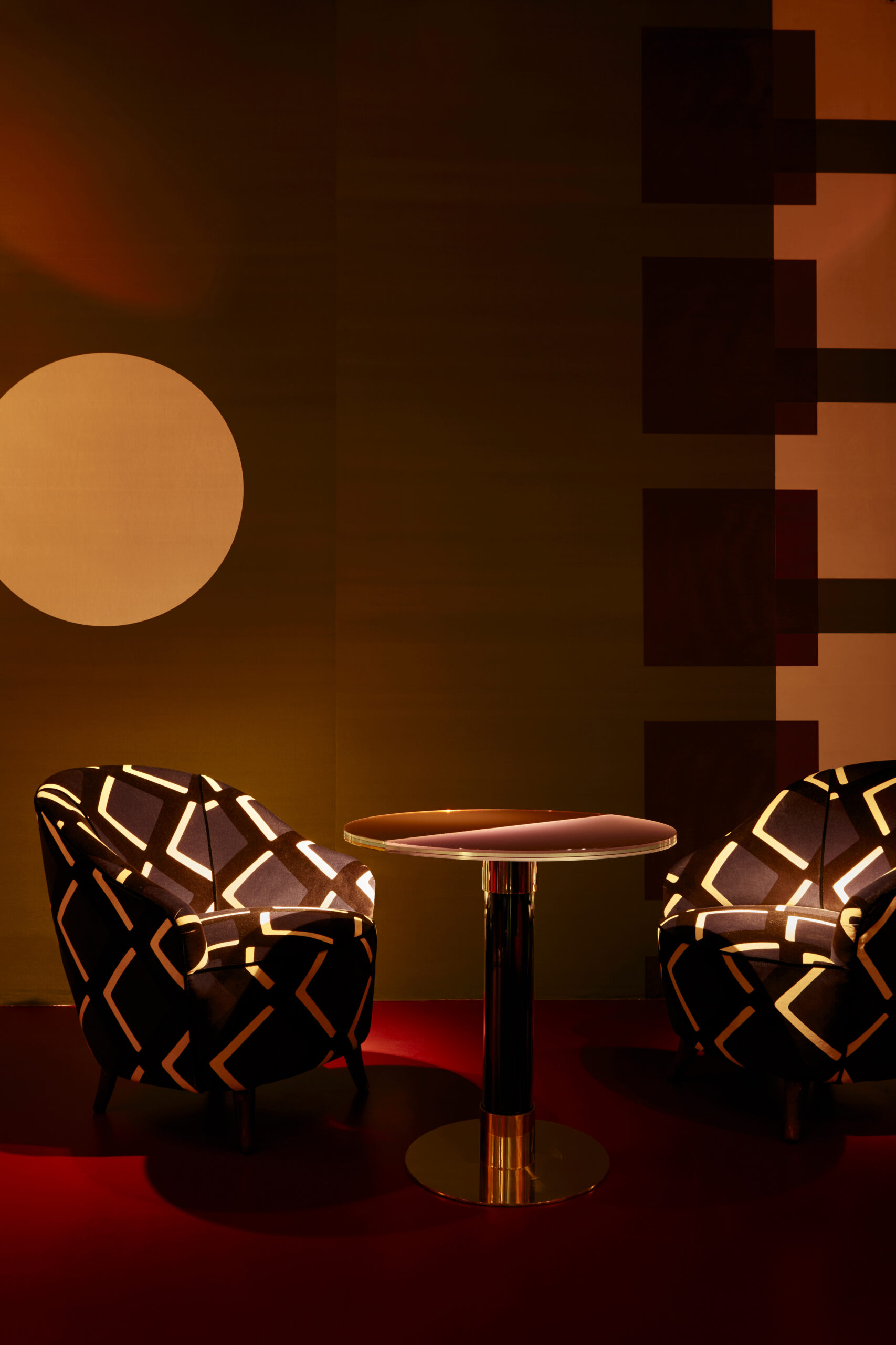 An intimate atmosphere where rigorous geometries meet feminine, sinuous shapes: backrests recalling the iconic Charlotte armchair design are accompanied by soft-shaped tables, while precious upholstery fabrics from India Mahdavi’s True Velvet collection for Pierre Frey stand out, along with silk tapestries created by the designer for de Gournay.