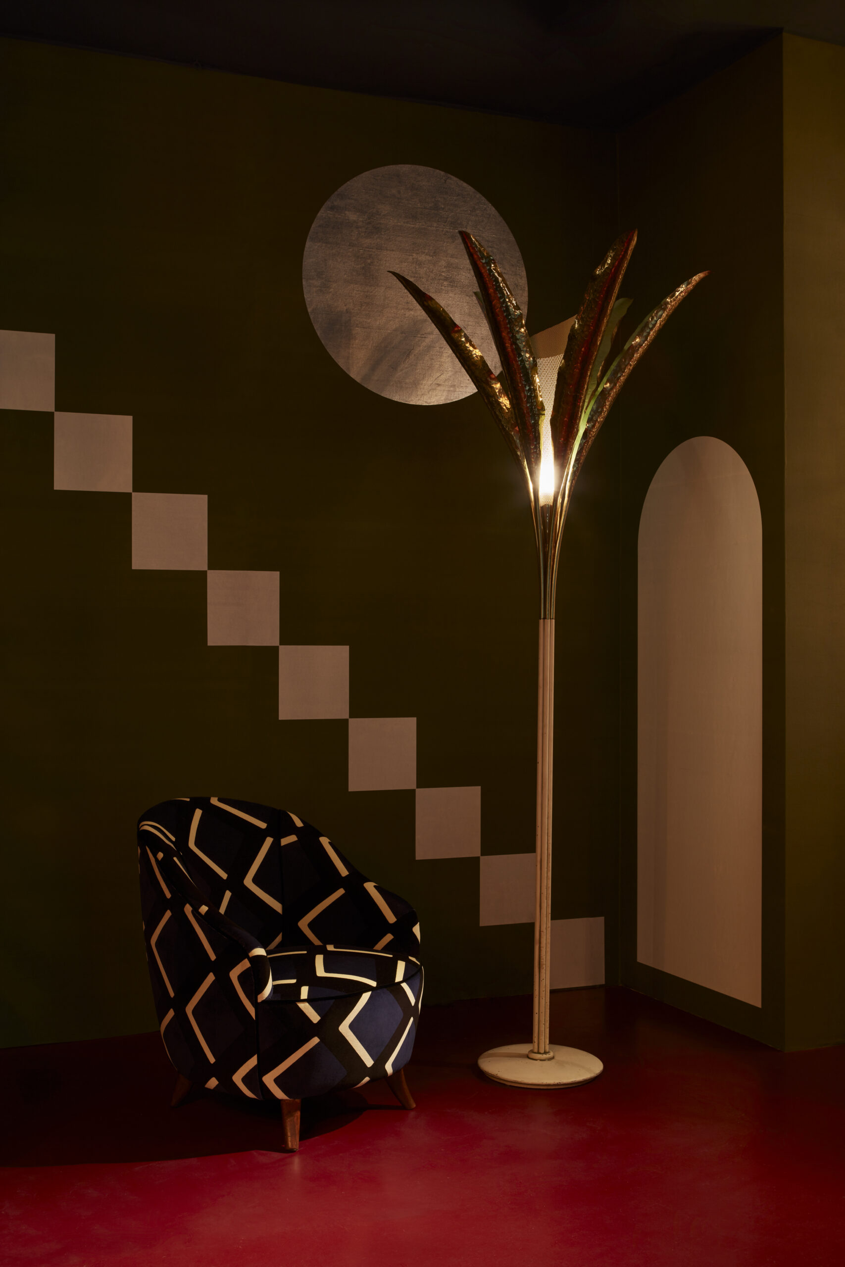 An exclusive assortment of lamps and furniture from Nina’s collection adds a touch of elegance: vintage pieces include a rare lamp by Angelo Lelii, Hans Agne Jakobsson pendants, four “Casa e Giardino” armchairs by Gio Ponti, and a fine Joaquim Tenreiro table; contemporary pieces range from a scenic room divider to a selection of stools designed by Martino Gamper, and a colourful lamp by Vibeke Fonnesberg Schmidt.