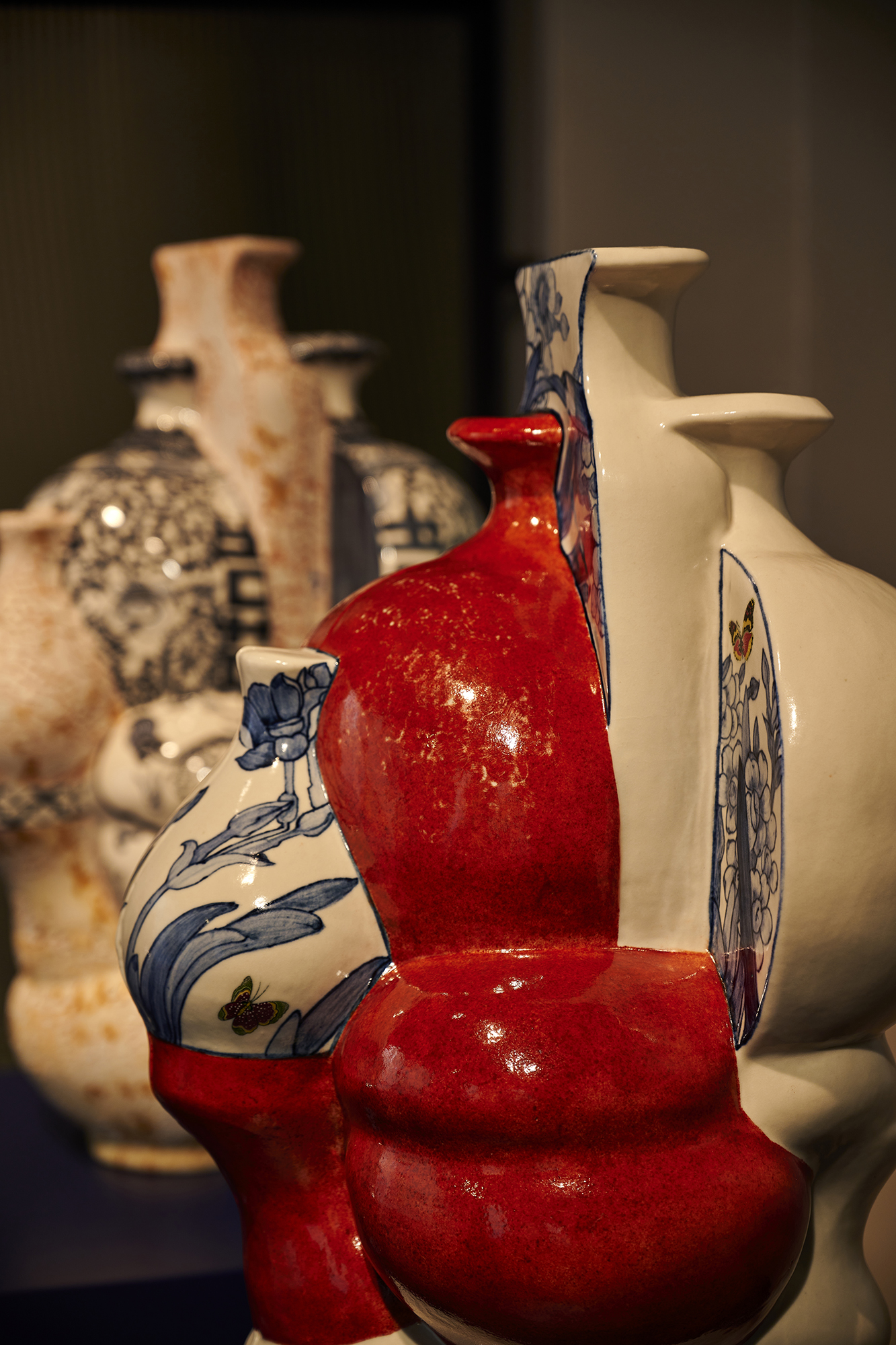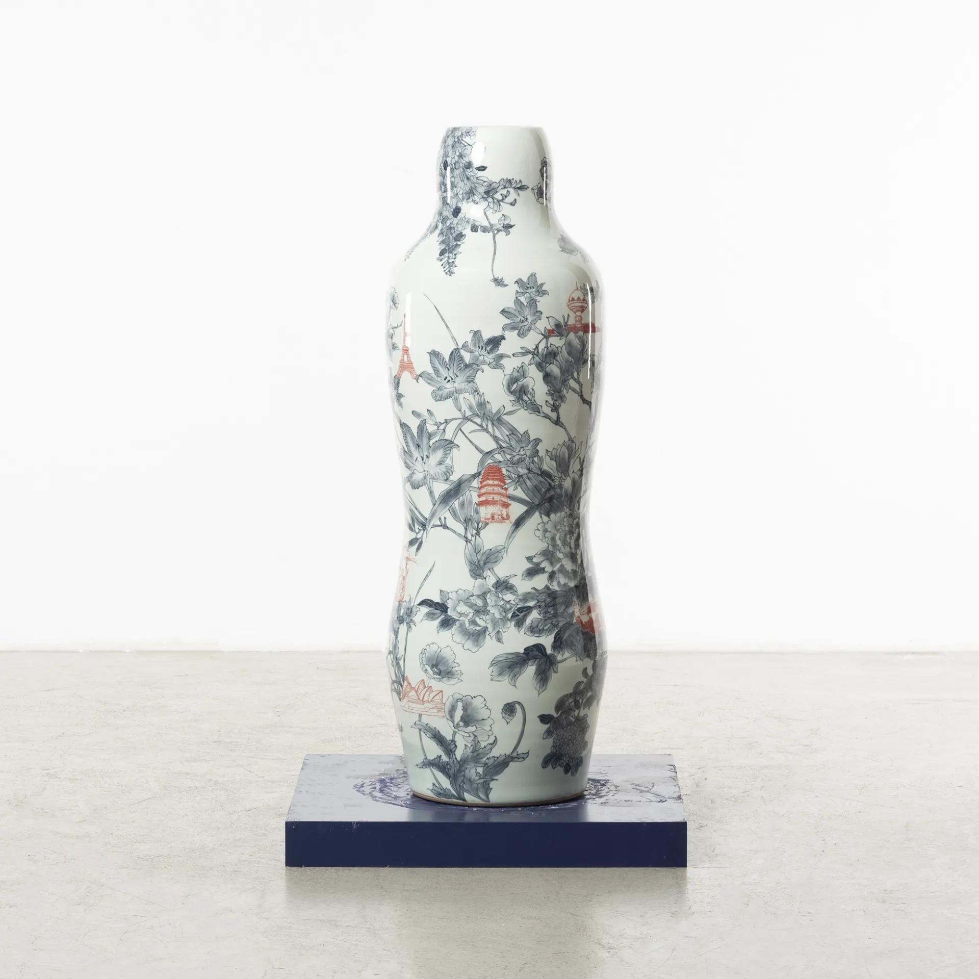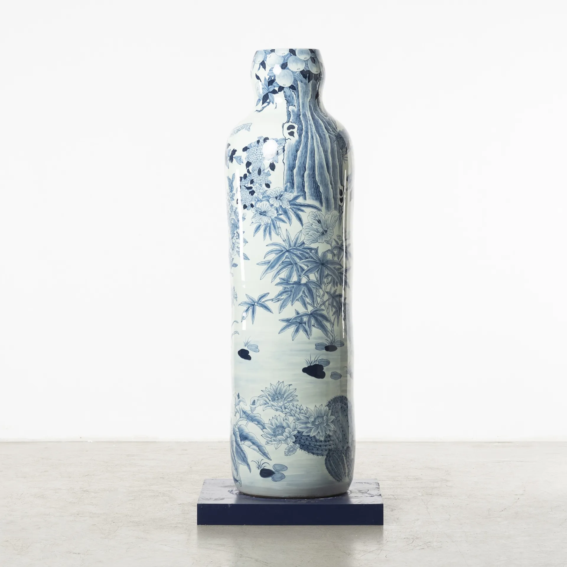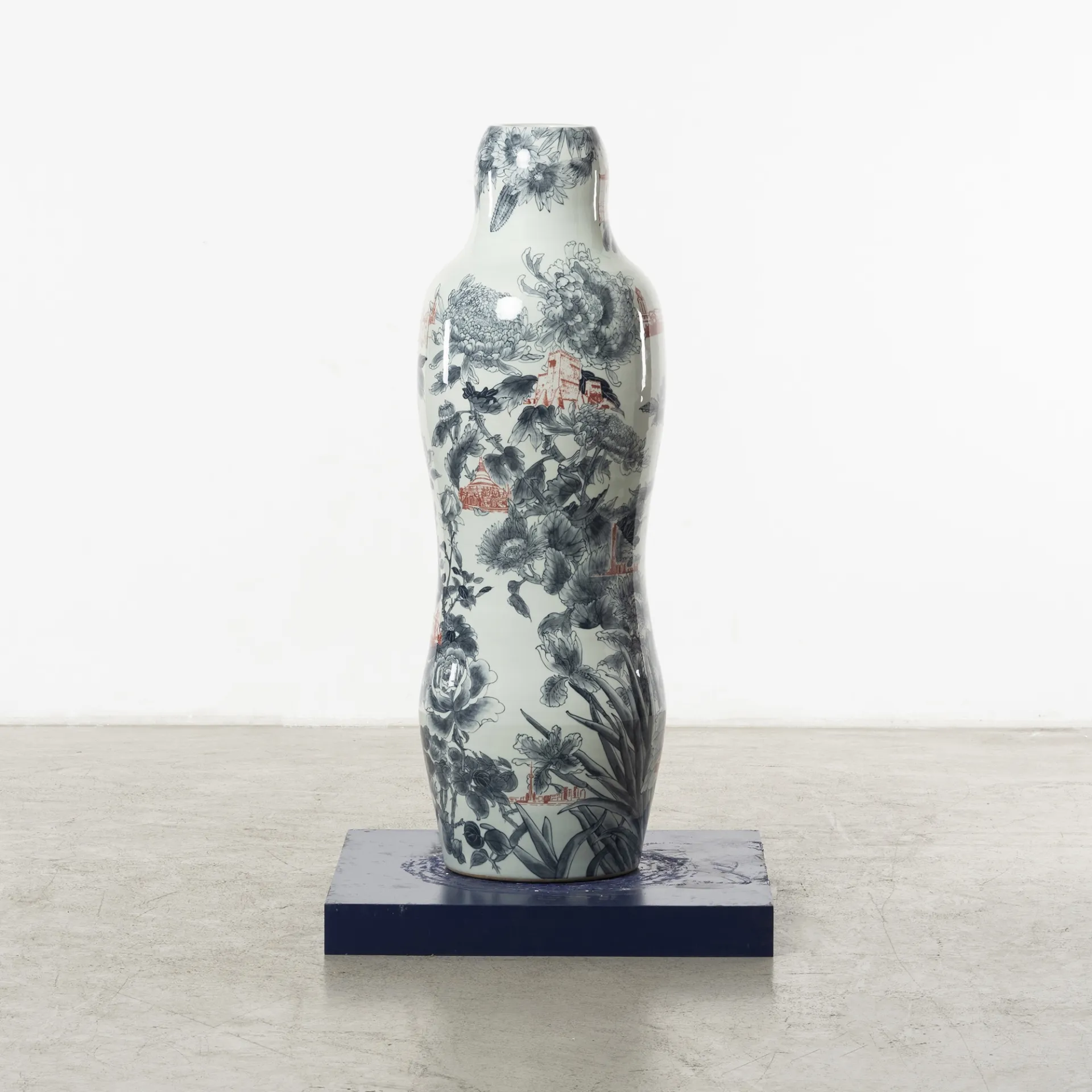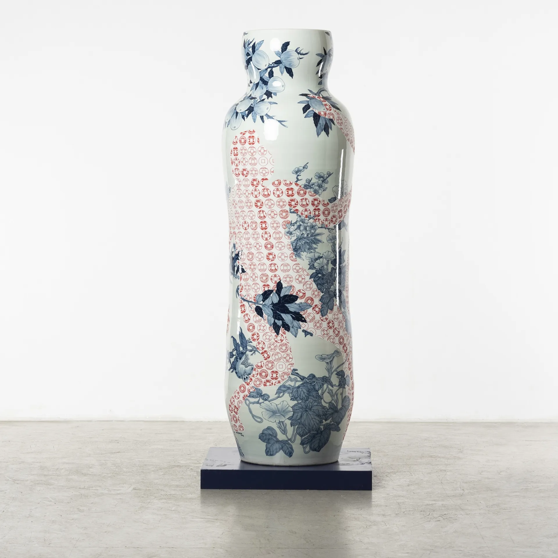 In her series ‘Garden of Eden’, Ho challenges her physical boundaries to create a group of monumental vessels, six to seven feet tall. These artworks’ shape is once again inspired by the silhouette of the human figure, referencing the Renaissance paintings of Garden of Eden and Adam and Eve as the core composition, surrounded by hand-painted cobalt underglaze of hundreds of flowers and combined with digital transfer-printed images. Universal human nature and traits, such as greed and other materialistic desires, the impact of marketing, hopes and technological transformations are intrinsic to the concept of these architectural vessels situated in a garden, thus evoking the collisions of 21st century globalisation.