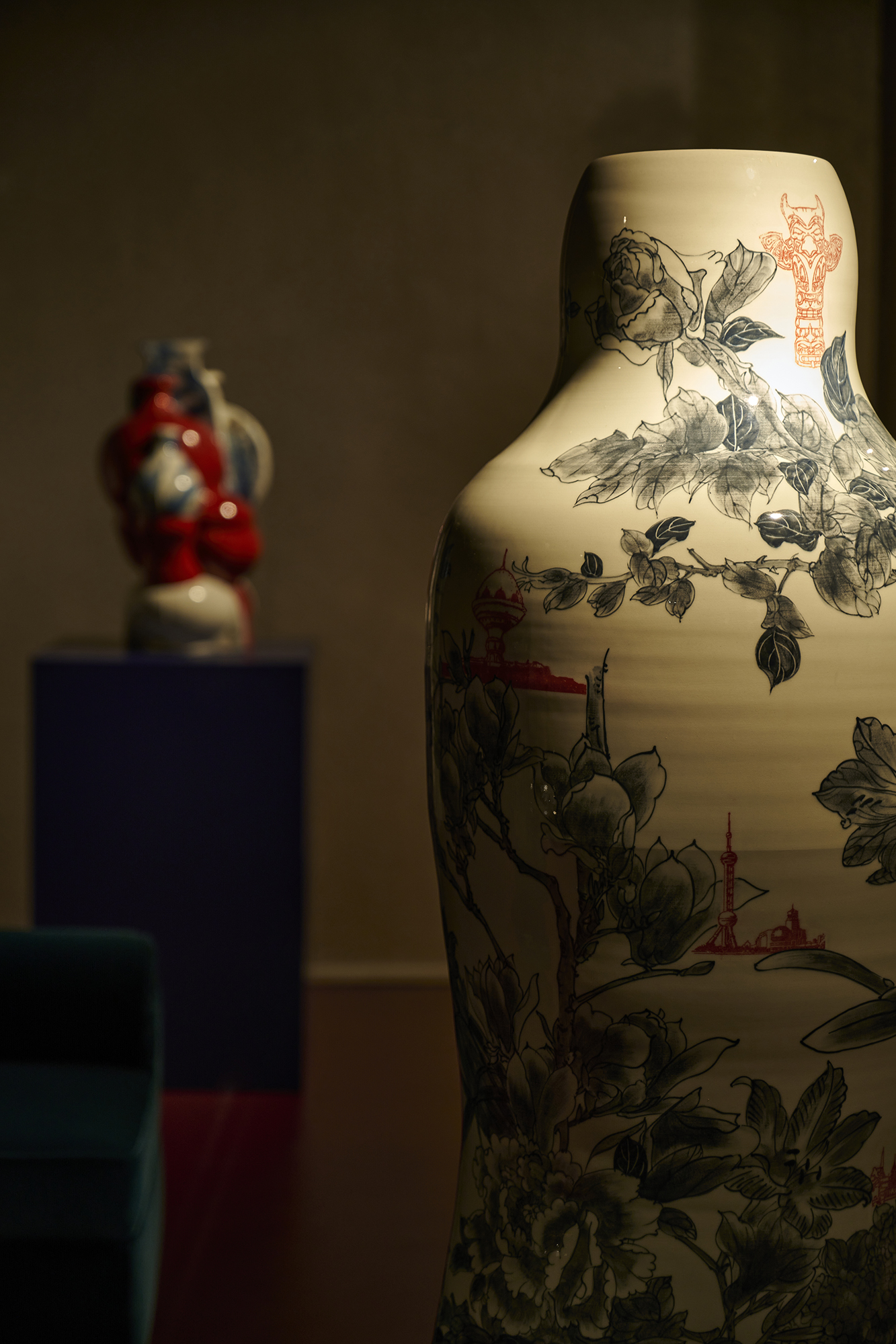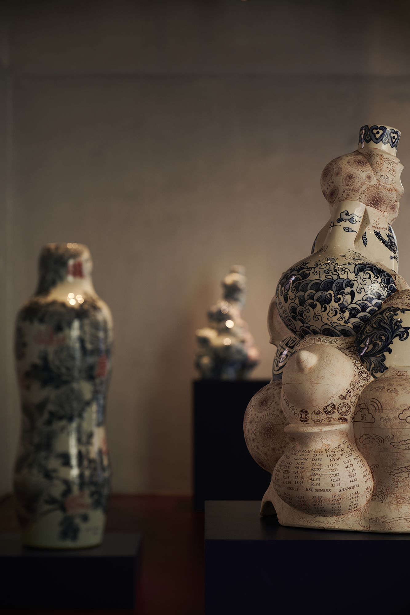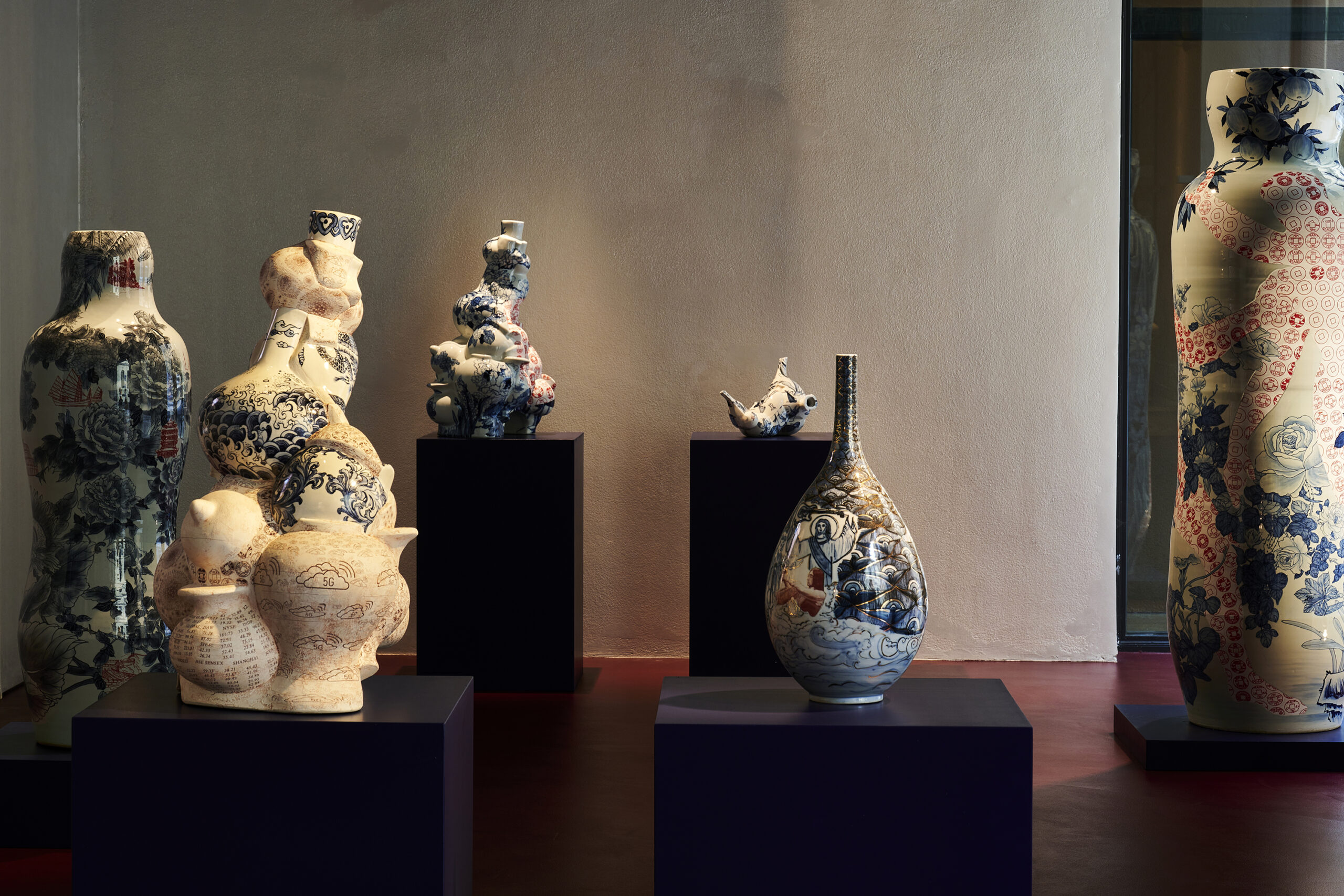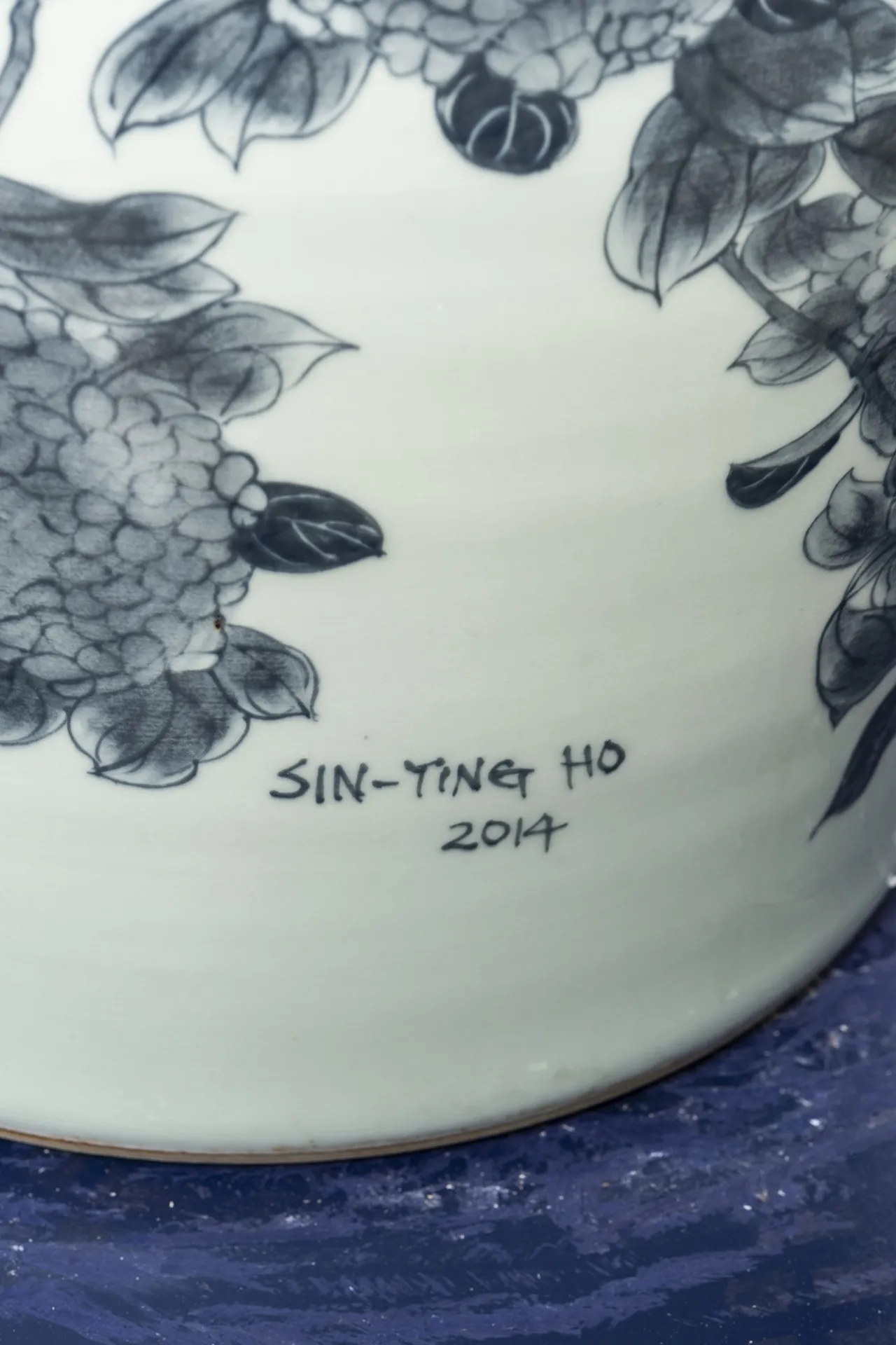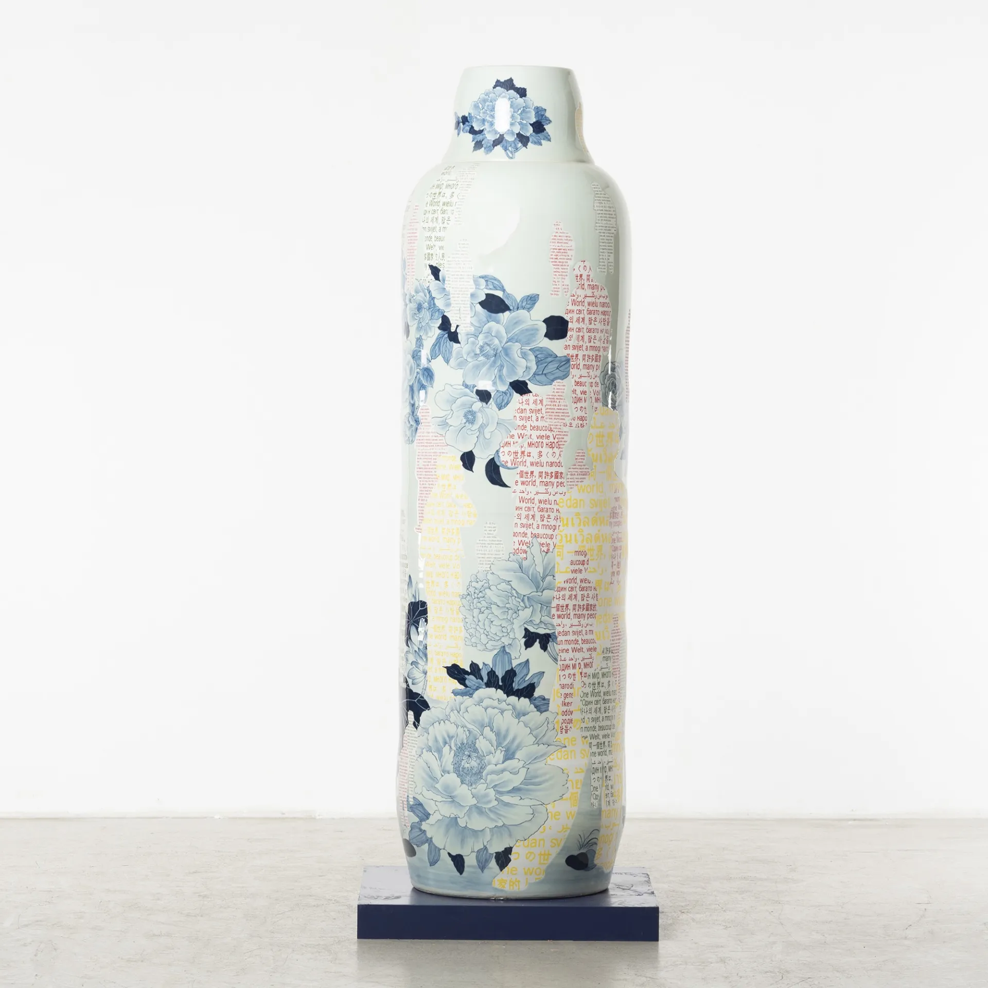 In her series ‘Garden of Eden’, Ho challenges her physical boundaries to create a group of monumental vessels, six to seven feet tall. These artworks’ shape is once again inspired by the silhouette of the human figure, referencing the Renaissance paintings of Garden of Eden and Adam and Eve as the core composition, surrounded by hand-painted cobalt underglaze of hundreds of flowers and combined with digital transfer-printed images. Universal human nature and traits, such as greed and other materialistic desires, the impact of marketing, hopes and technological transformations are intrinsic to the concept of these architectural vessels situated in a garden, thus evoking the collisions of 21st century globalisation.