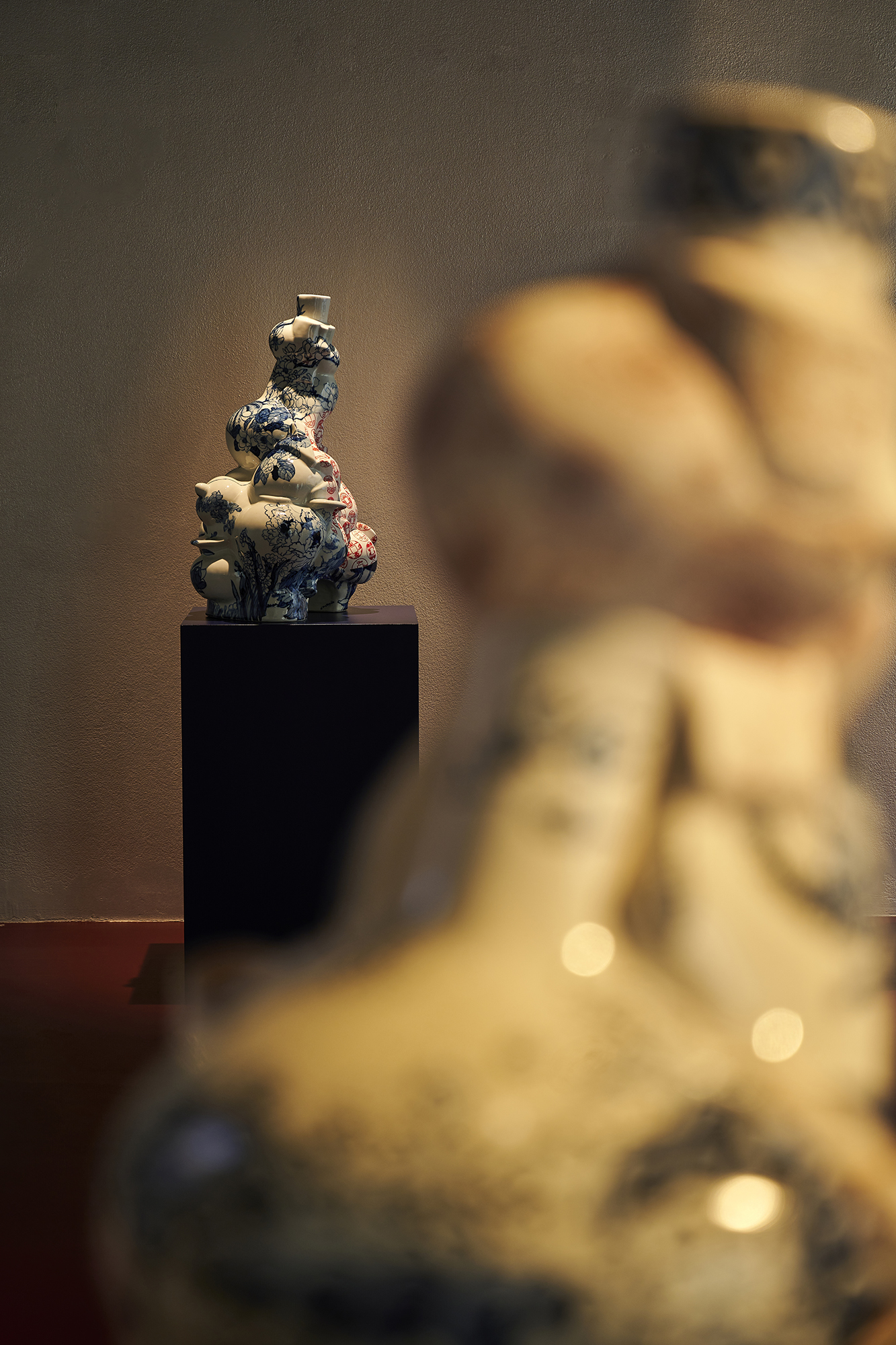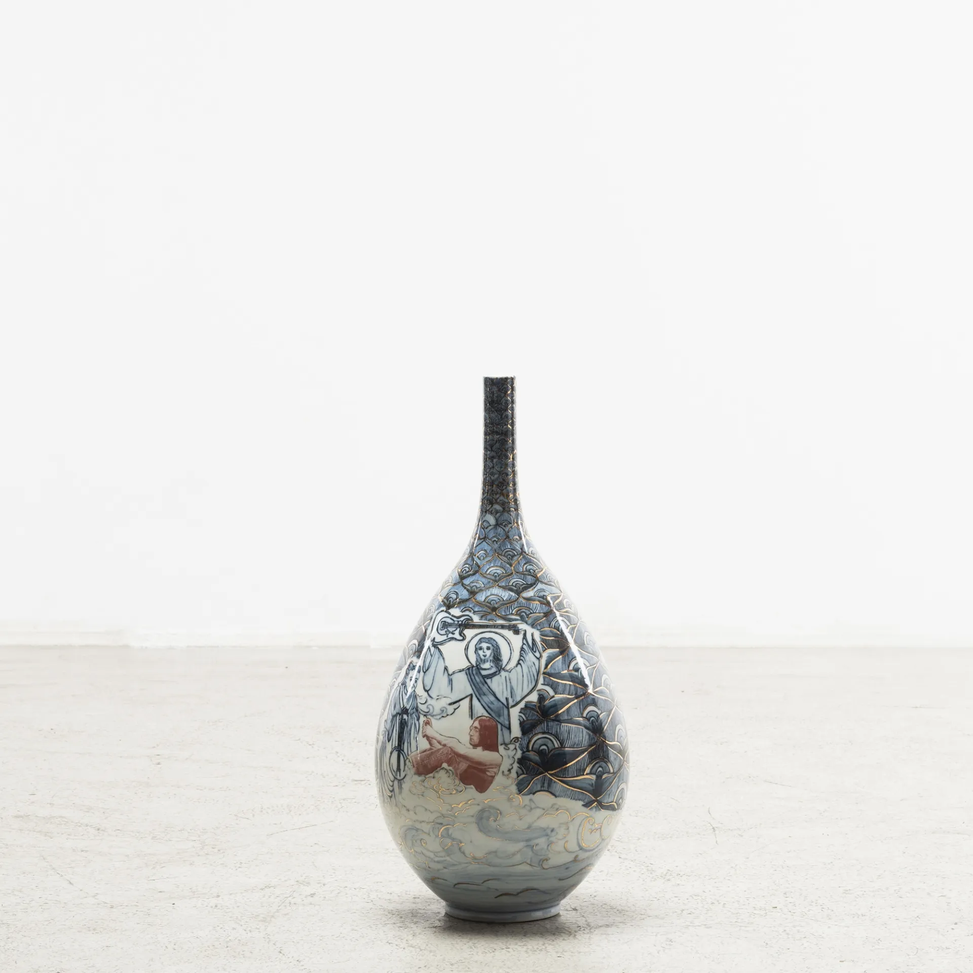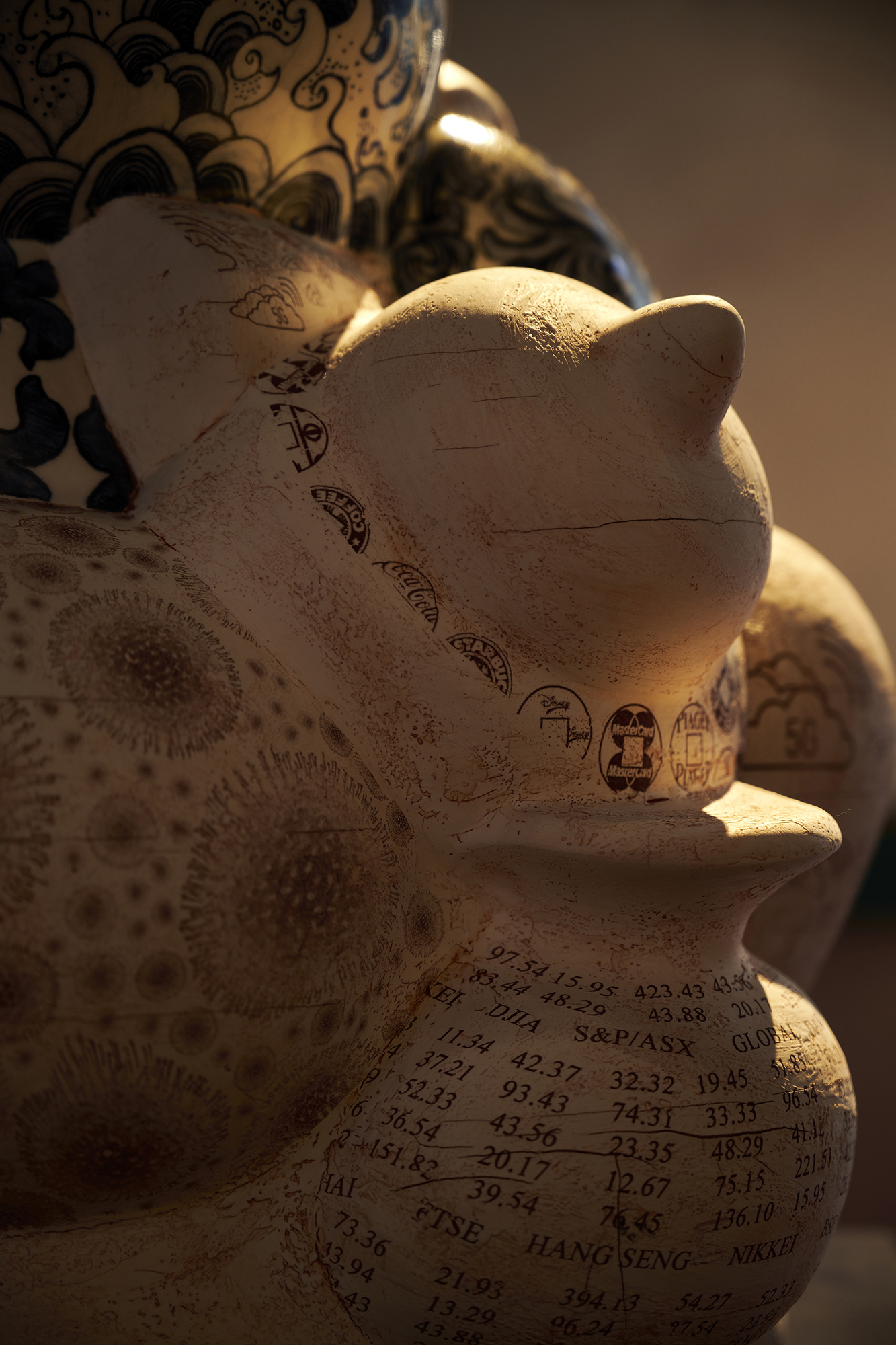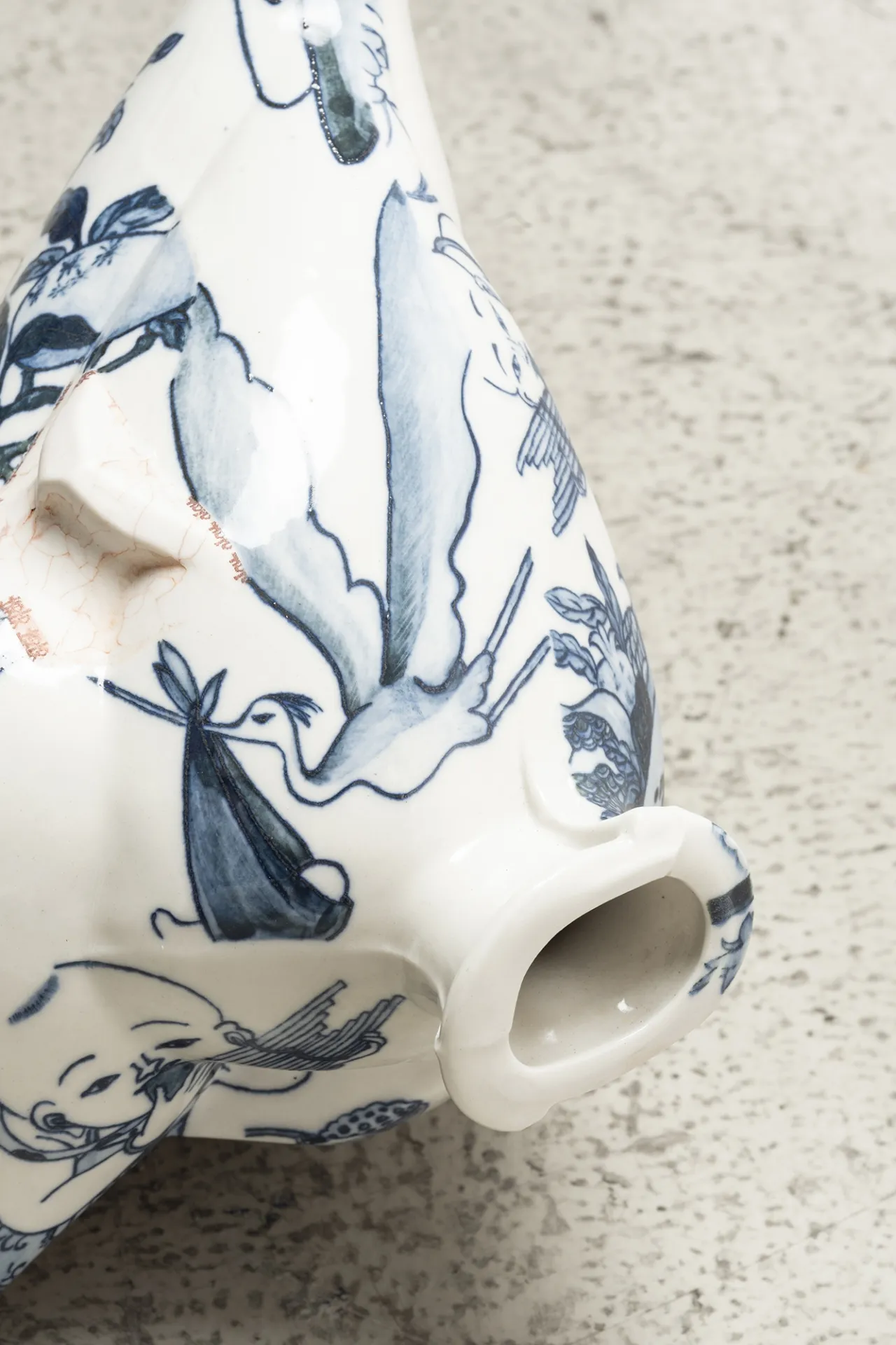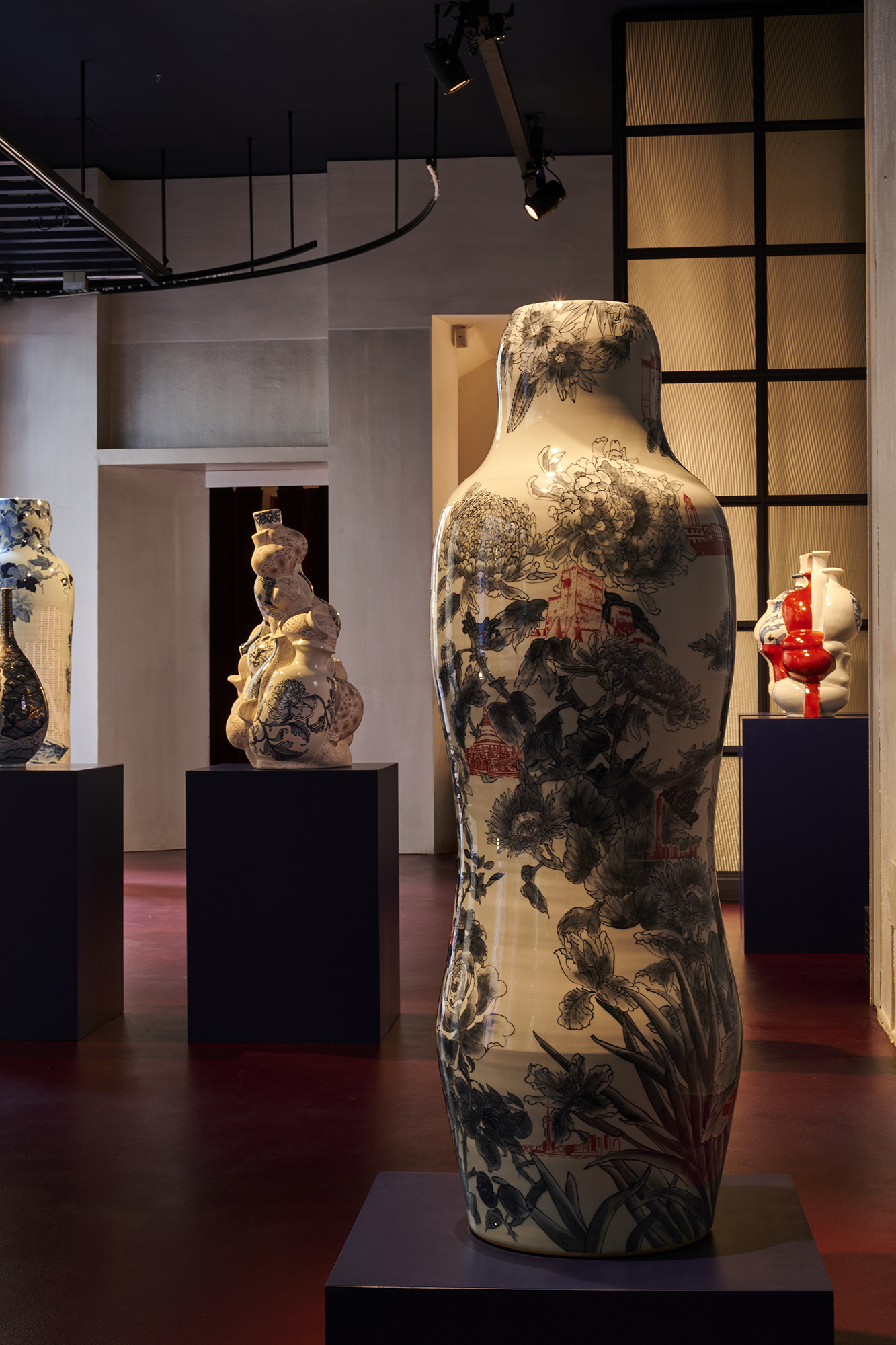 In her series ‘Garden of Eden’, Ho challenges her physical boundaries to create a group of monumental vessels, six to seven feet tall. These artworks’ shape is once again inspired by the silhouette of the human figure, referencing the Renaissance paintings of Garden of Eden and Adam and Eve as the core composition, surrounded by hand-painted cobalt underglaze of hundreds of flowers and combined with digital transfer-printed images. Universal human nature and traits, such as greed and other materialistic desires, the impact of marketing, hopes and technological transformations are intrinsic to the concept of these architectural vessels situated in a garden, thus evoking the collisions of 21st century globalisation.