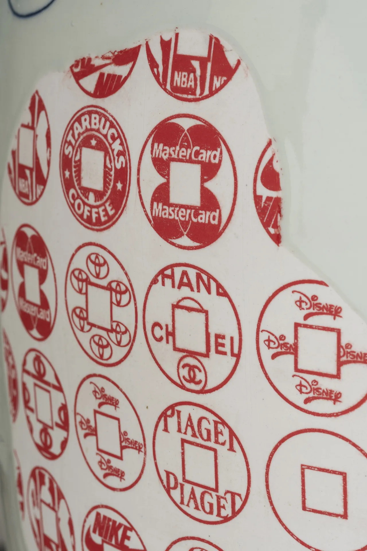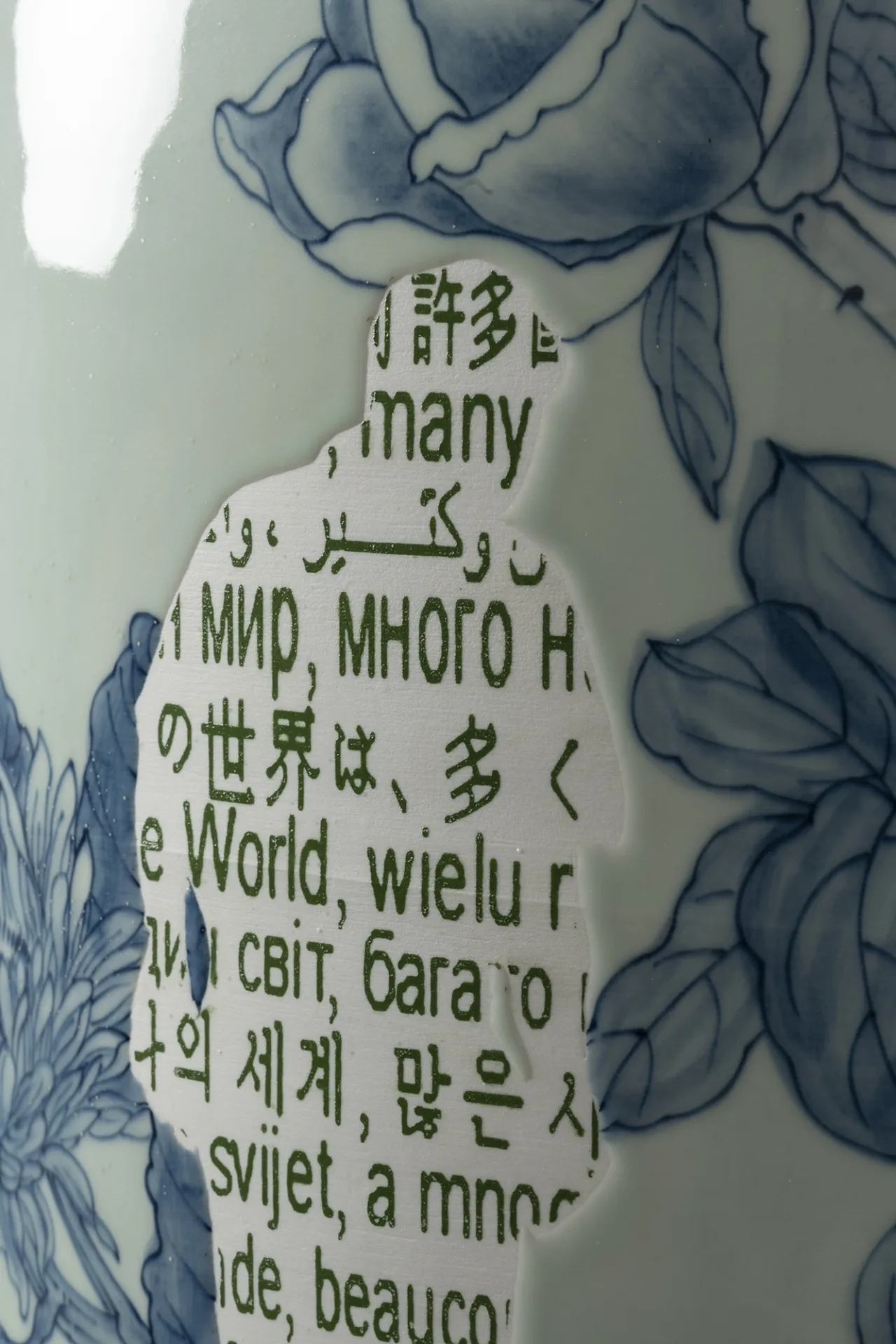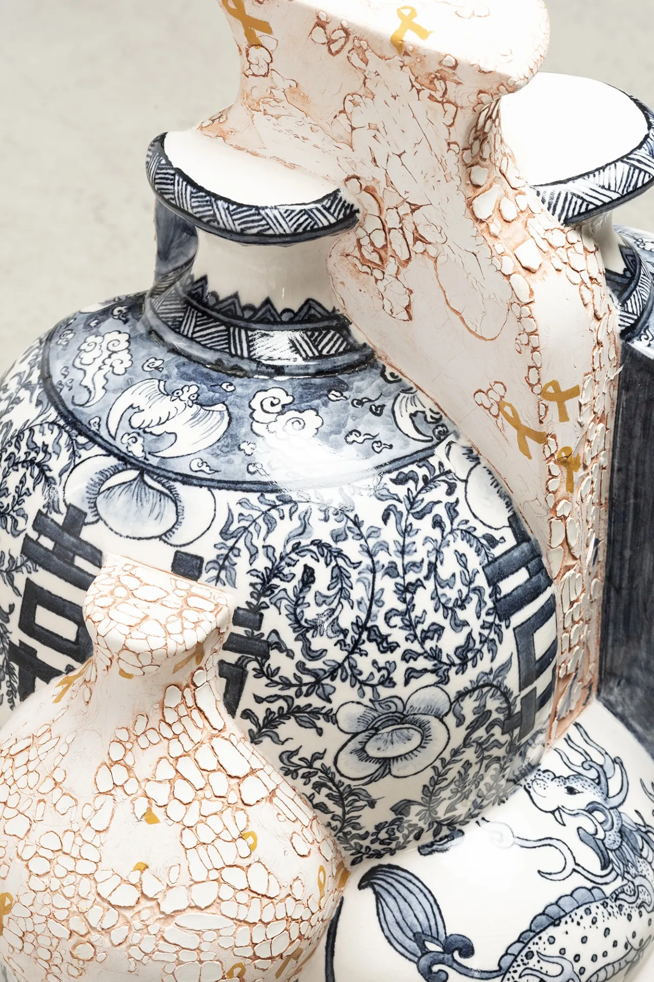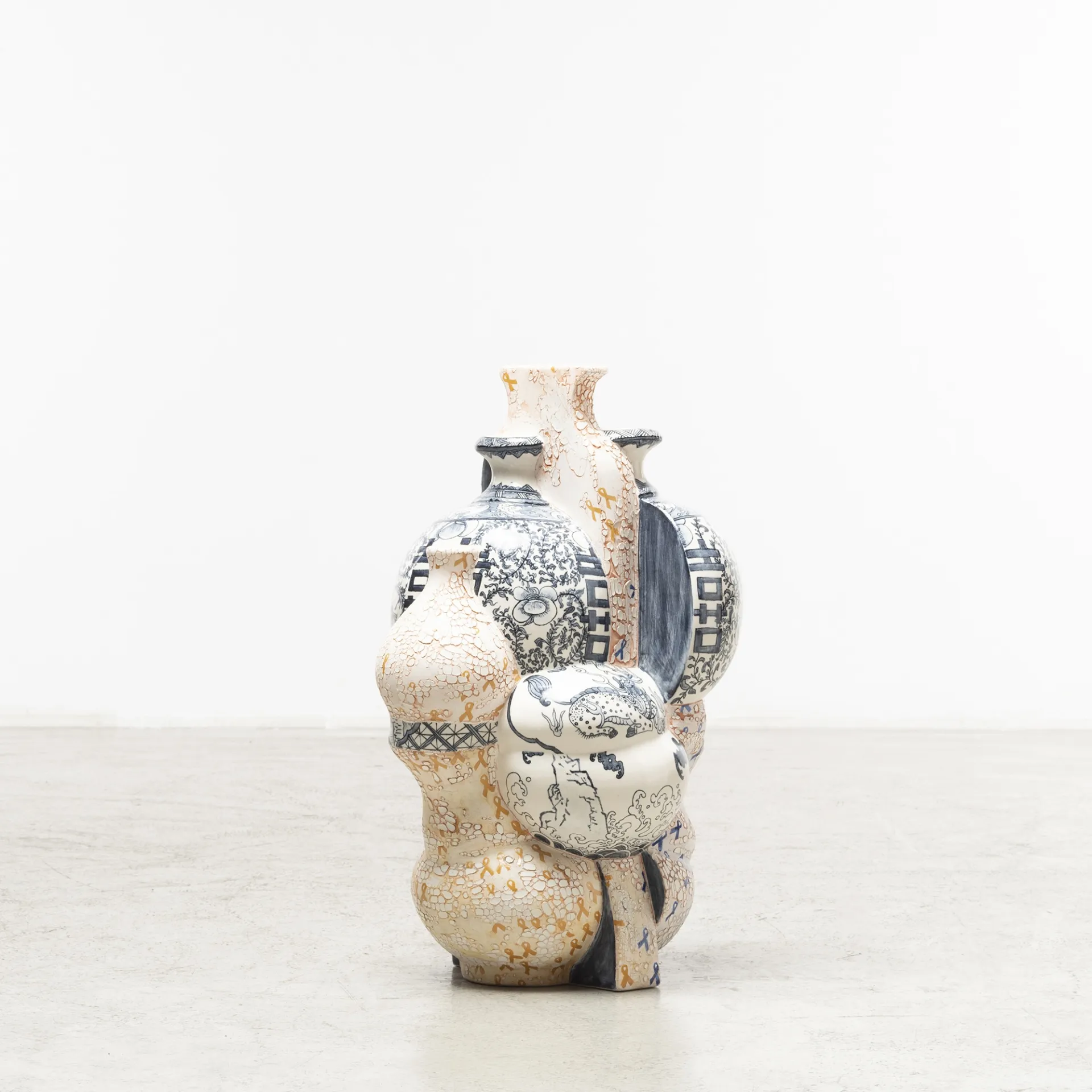 Her cut-and-paste technique creates recognizable and simultaneously unfamiliar silhouettes, with symbols from both East and West that are hand painted, digitally designed and then transferred onto the glazed surface. This mixture of digital and analogic, together with the fragmentation of her work, creates a visual distortion creating a shifting dimensionality that evokes cubism in a postmodern era. These multiple forms joined together represent her personal journey, deconstructed and reconstructed, from East to West and West to East, as well as narratives of social and global changes provoked by globalism, technology and the digital age.