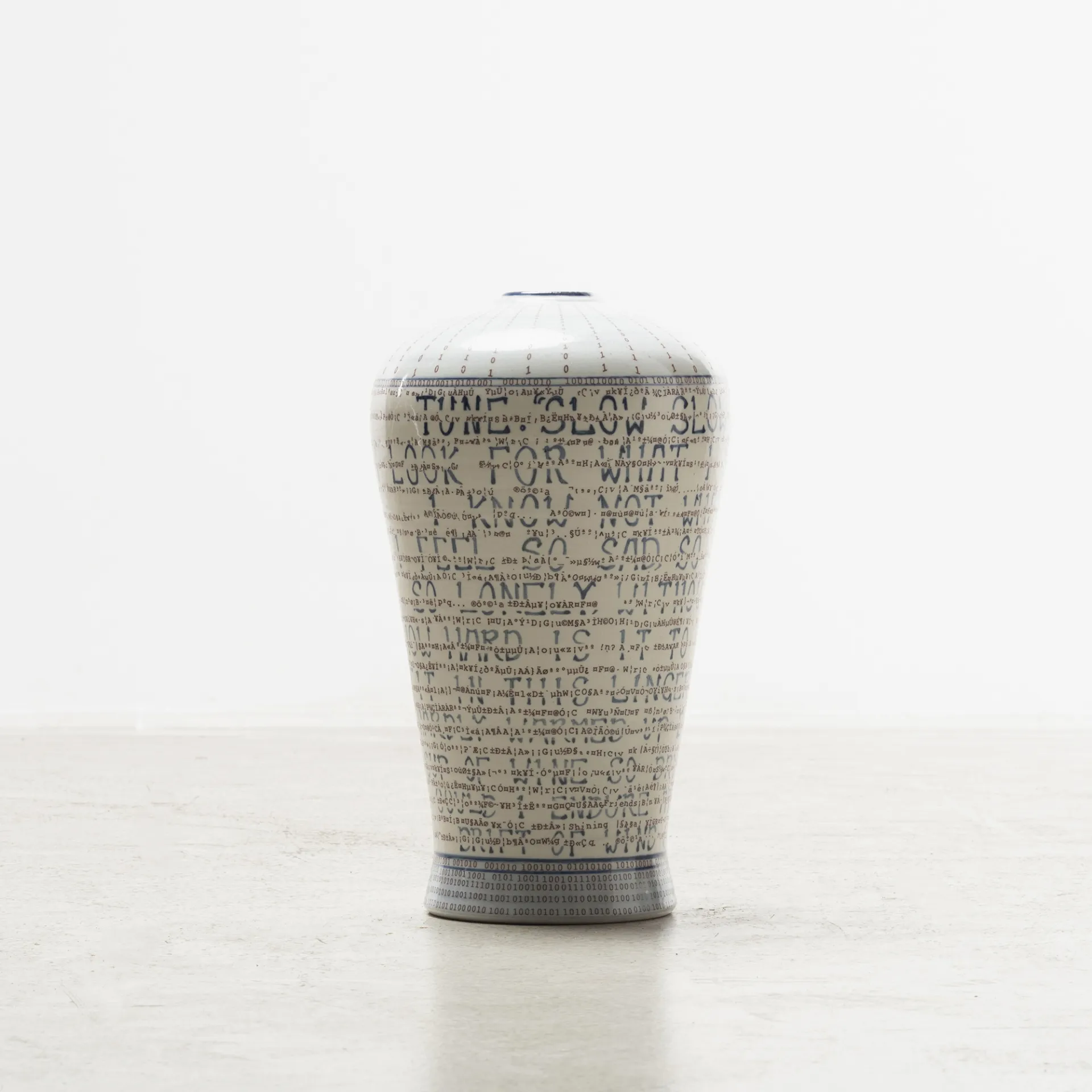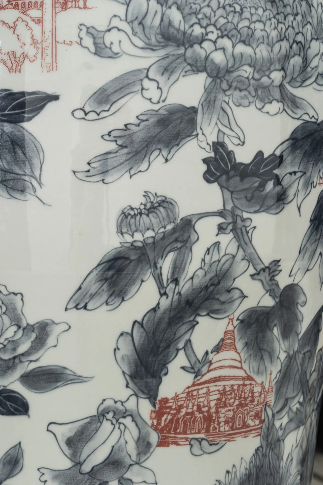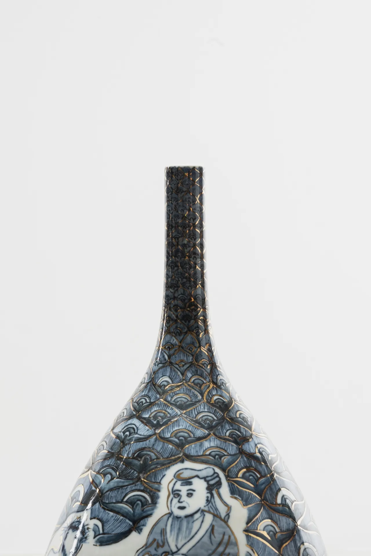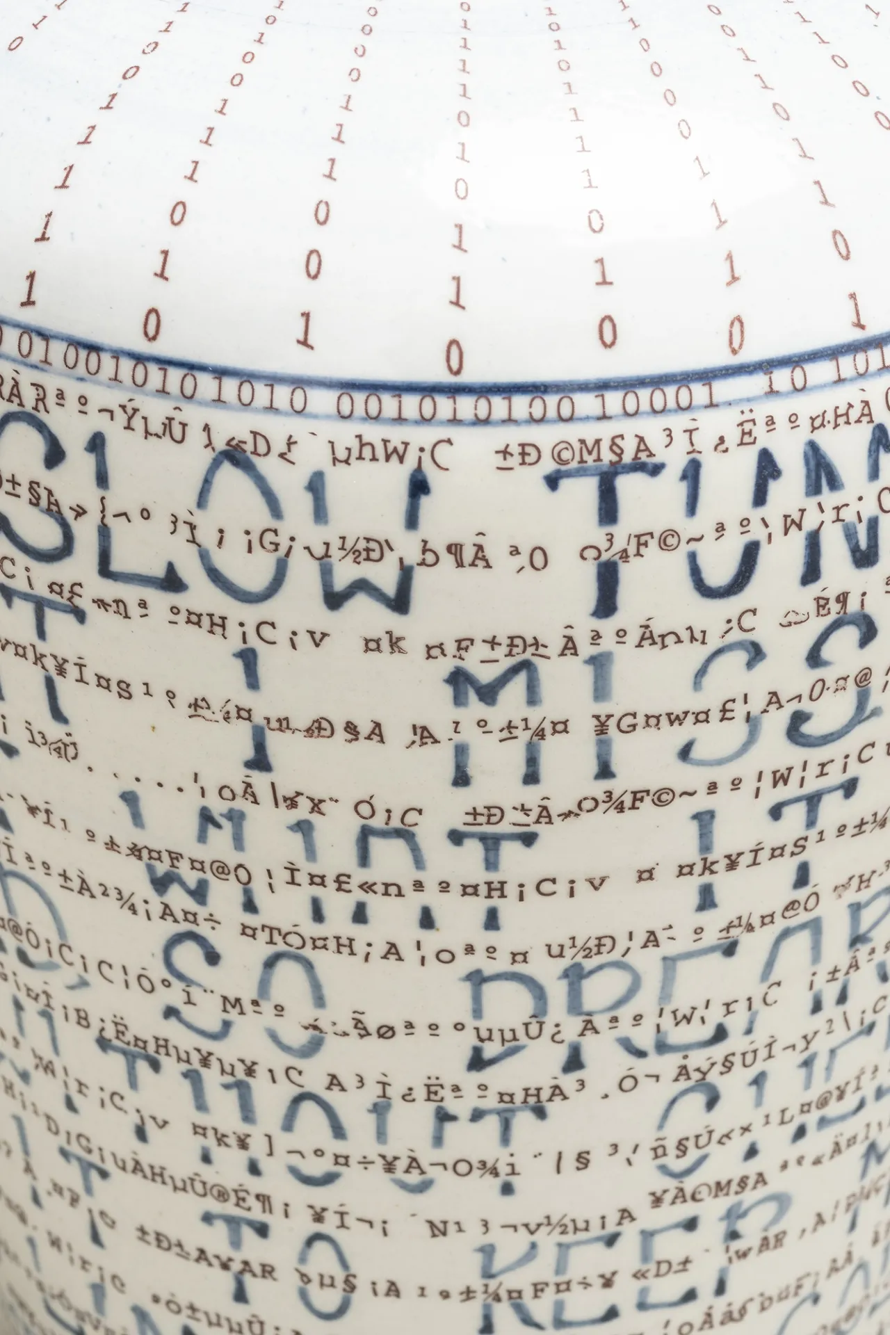 Her cut-and-paste technique creates recognizable and simultaneously unfamiliar silhouettes, with symbols from both East and West that are hand painted, digitally designed and then transferred onto the glazed surface. This mixture of digital and analogic, together with the fragmentation of her work, creates a visual distortion creating a shifting dimensionality that evokes cubism in a postmodern era. These multiple forms joined together represent her personal journey, deconstructed and reconstructed, from East to West and West to East, as well as narratives of social and global changes provoked by globalism, technology and the digital age.