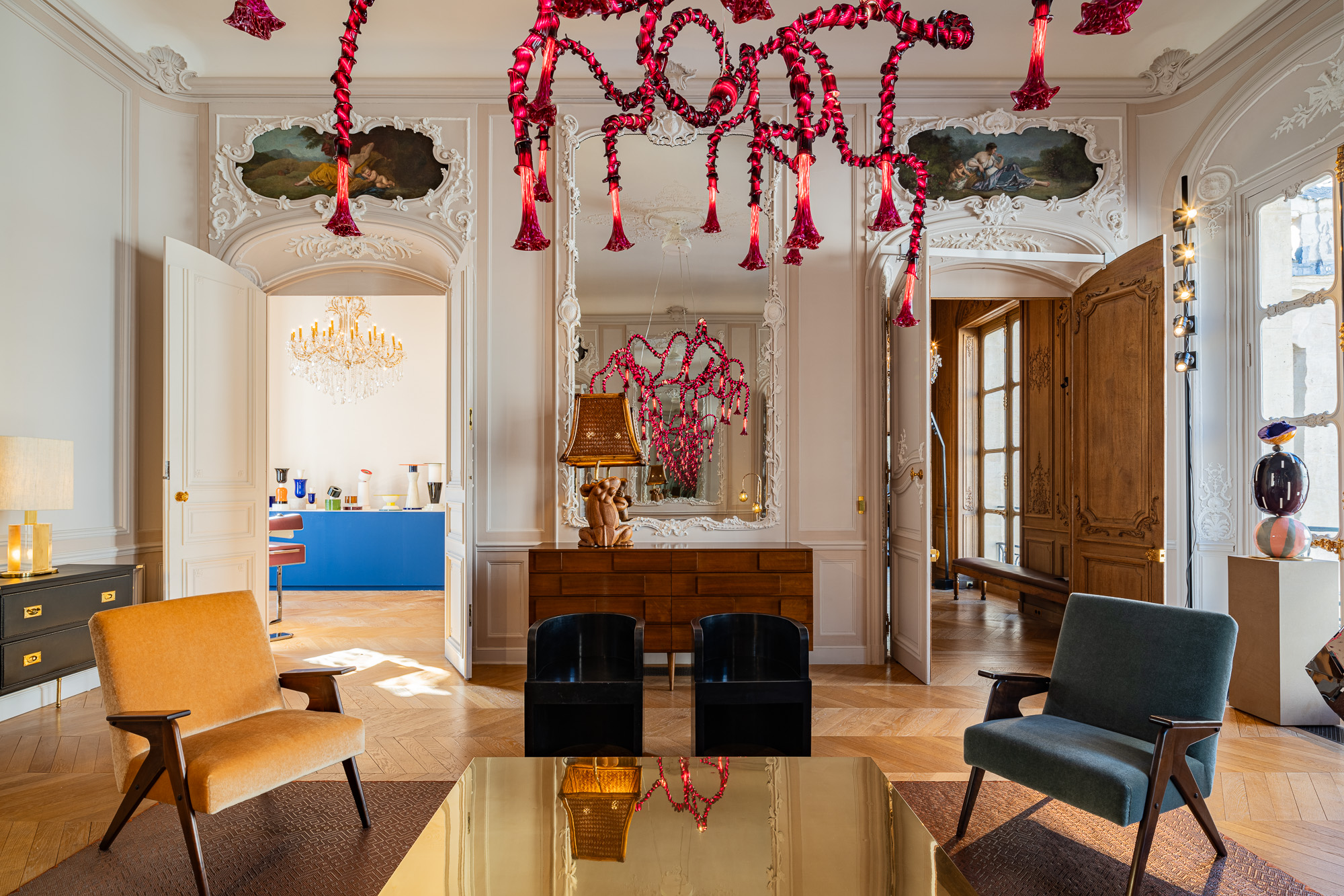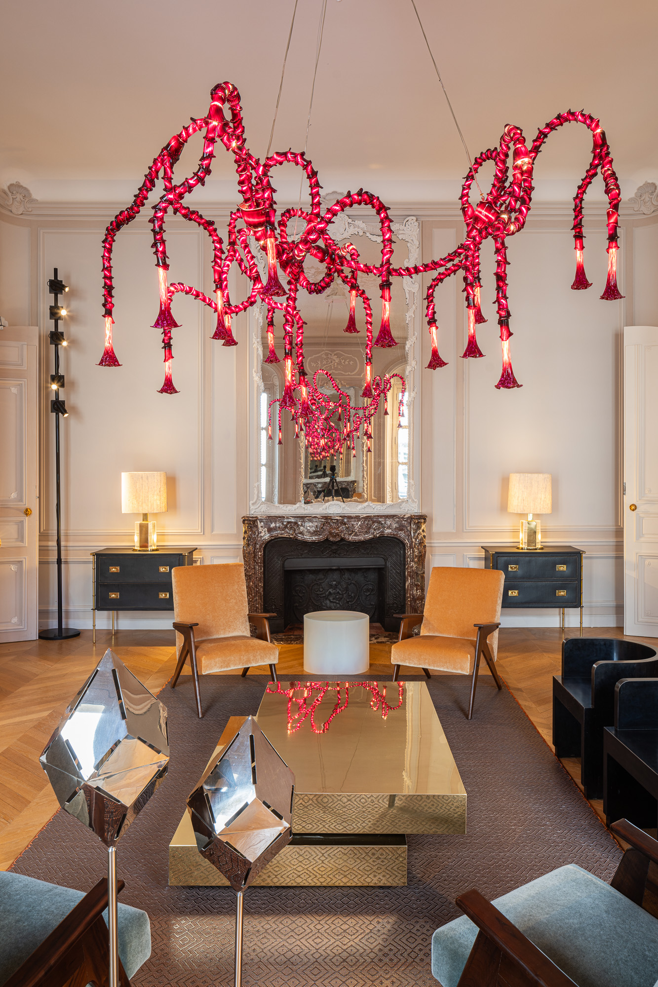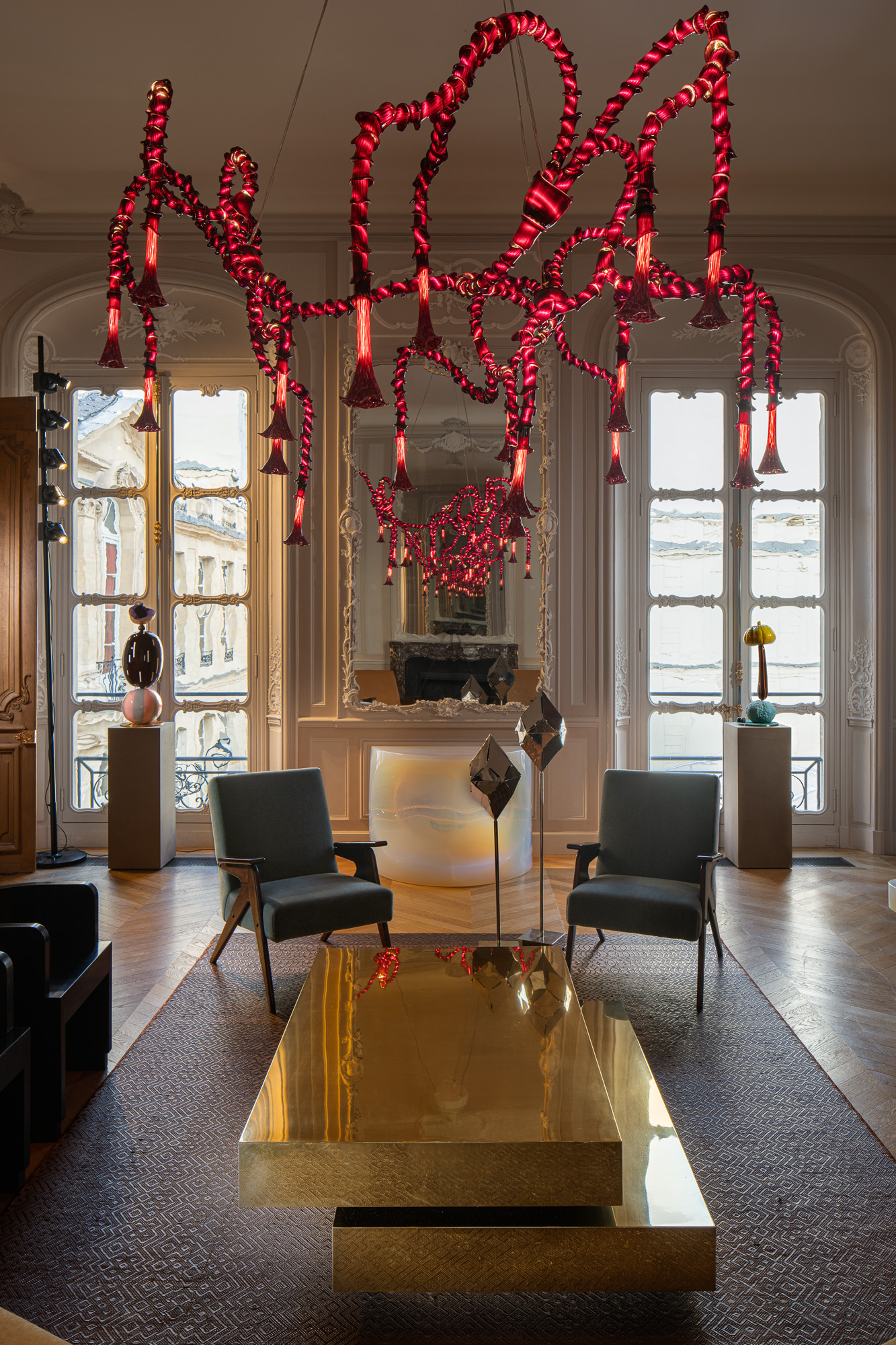 The vintage works are thoughtfully combined with contemporary pieces, such as the ‘Brugmansia Amaranto’ floating ceiling lamp from the ‘Brugmansia’ Collection by Christian Pellizzari, and the ‘Afairesi’ console, ‘Imisfairia’ stools, and ‘Synthesis’ low table by Objects of Common Interest. Also featured are ‘the ‘Inga’ carpet designed by Jorge Lizarazo for Hechizoo, and the ‘Kaaawa Lawn’ and ‘Black Cherry’ sculptures by artist Jonathan Trayte. Rounding out the contemporary collection are ‘Campanula’ floor lamps by Osanna Visconti. Each piece creates a narrative that underscores how the past continually informs and inspires the present.