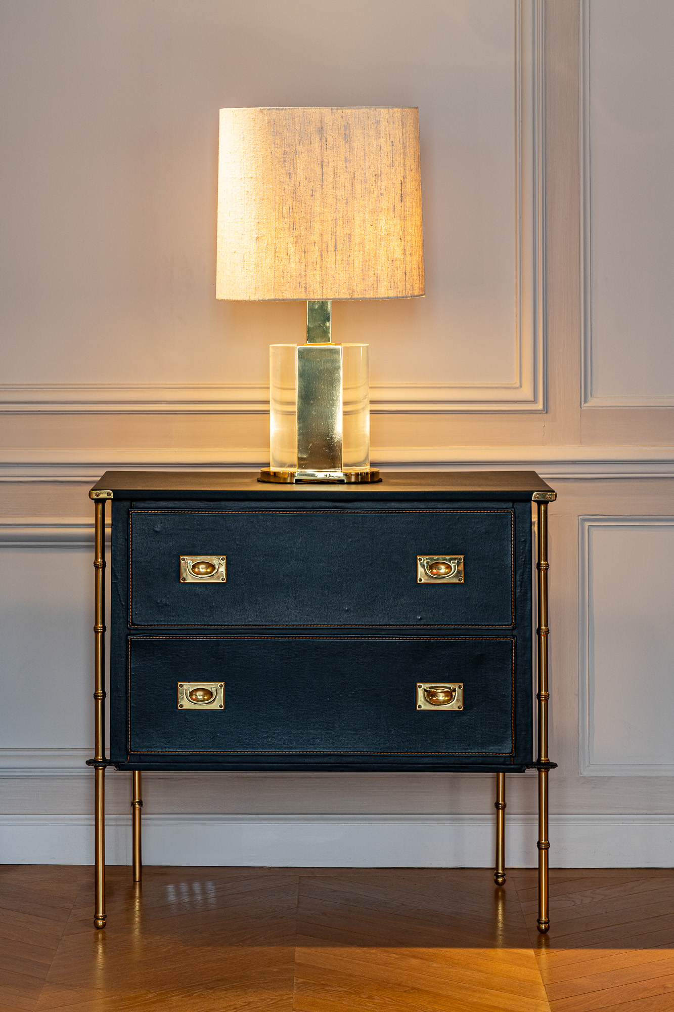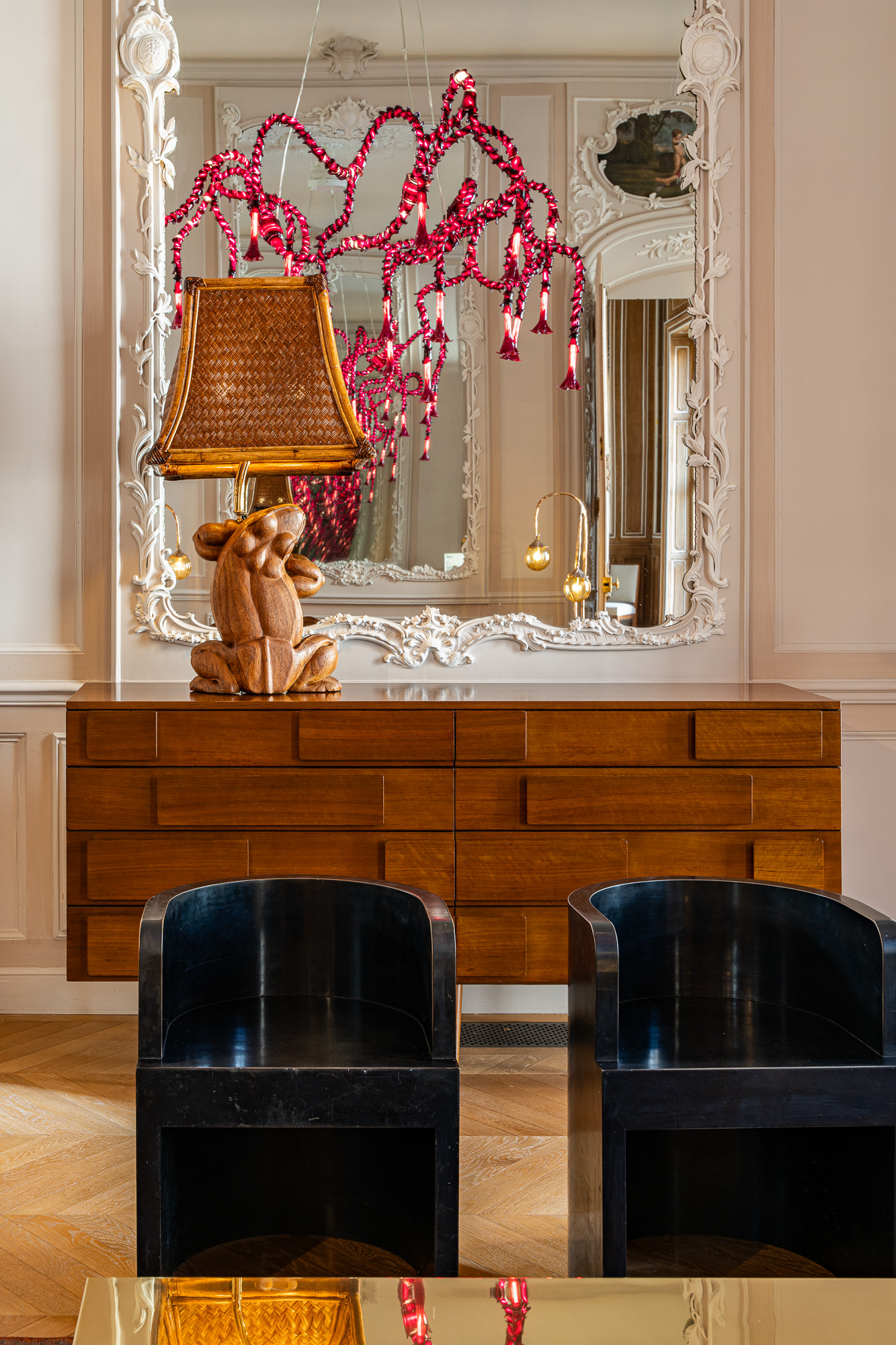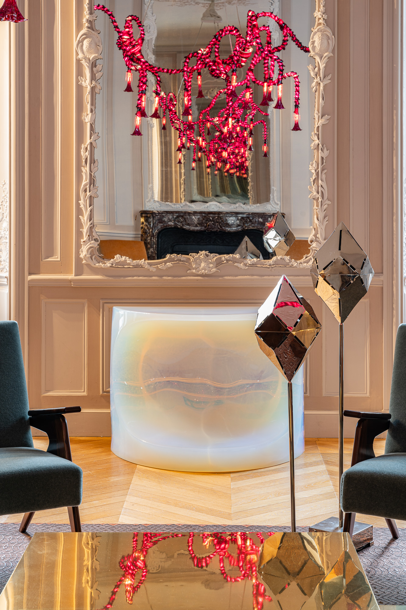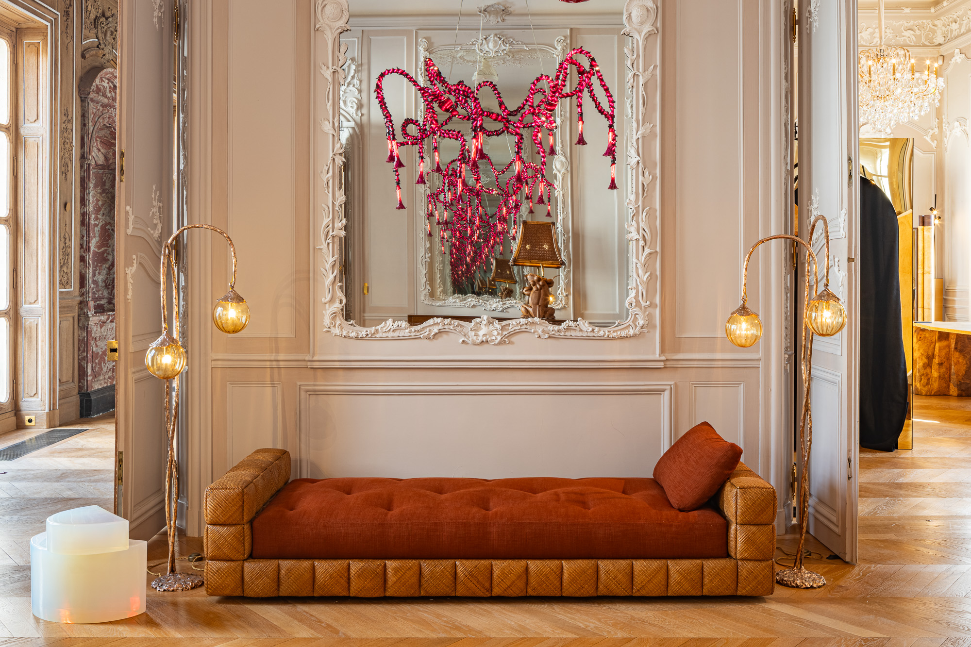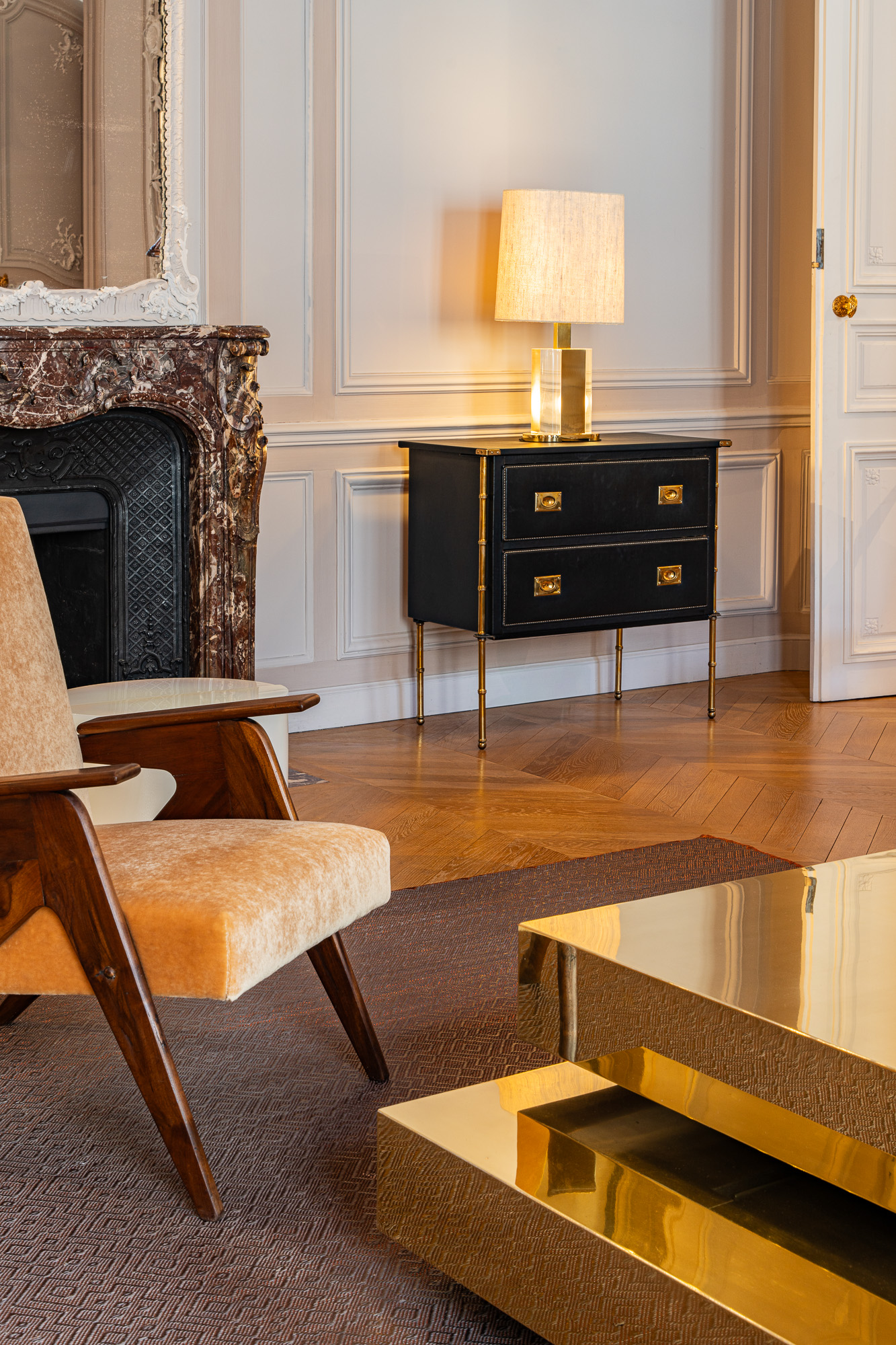 Set within the exquisite confines of the Hotel de Maison, Nilufar exhibition features a selection of rare vintage masterpieces spanning countries and masters, including ‘Tridente / P9’ armchairs by Lina Bo Bardi and Giancarlo Palanti for Studio d’Arte Palma (1948), the ‘Scultura’ table from the ‘Plurimi’ Series, the ‘Rana’ Table Lamp and two ‘Bauletto’ Table Lamps in addition to ‘Caleidoscopio’ floor lamps, all by Gabriella Crespi from the 1970s. Also on display are two armchairs by Gino Levi Montalcini and Giuseppe Pagano (1930s), and a daybed by Marzio Cecchi (ca. 1965). Adding to this vintage treasure trove are the ‘2161’ cabinet by Gio Ponti (1950s), and a pair of chest of drawers by Jacques Adnet (1950s).