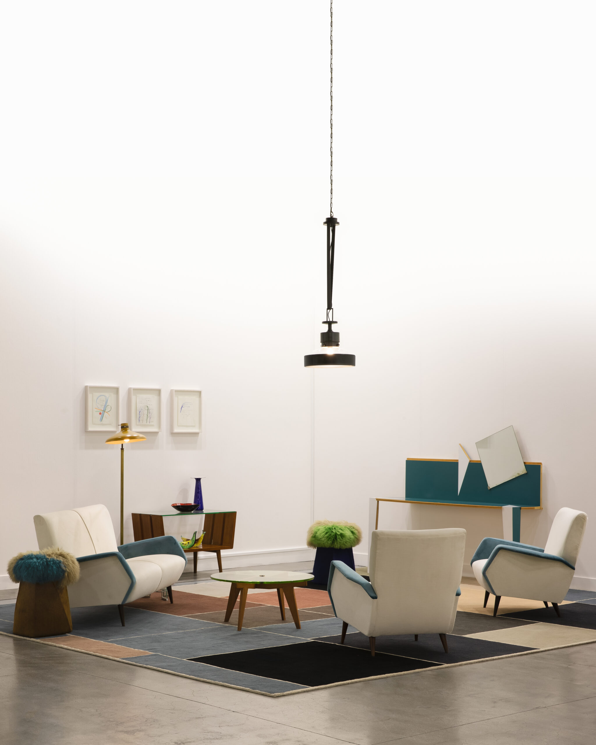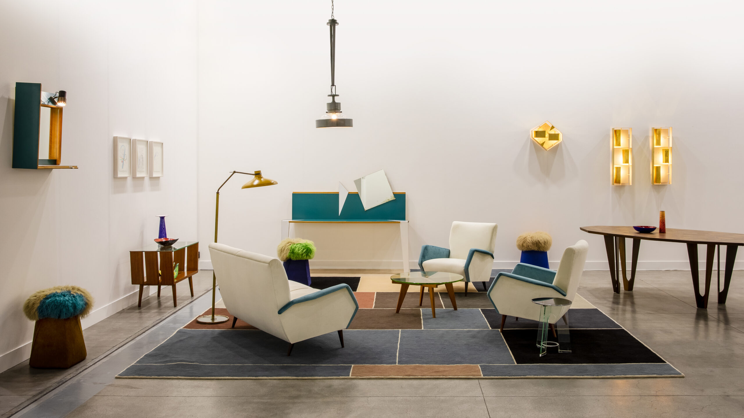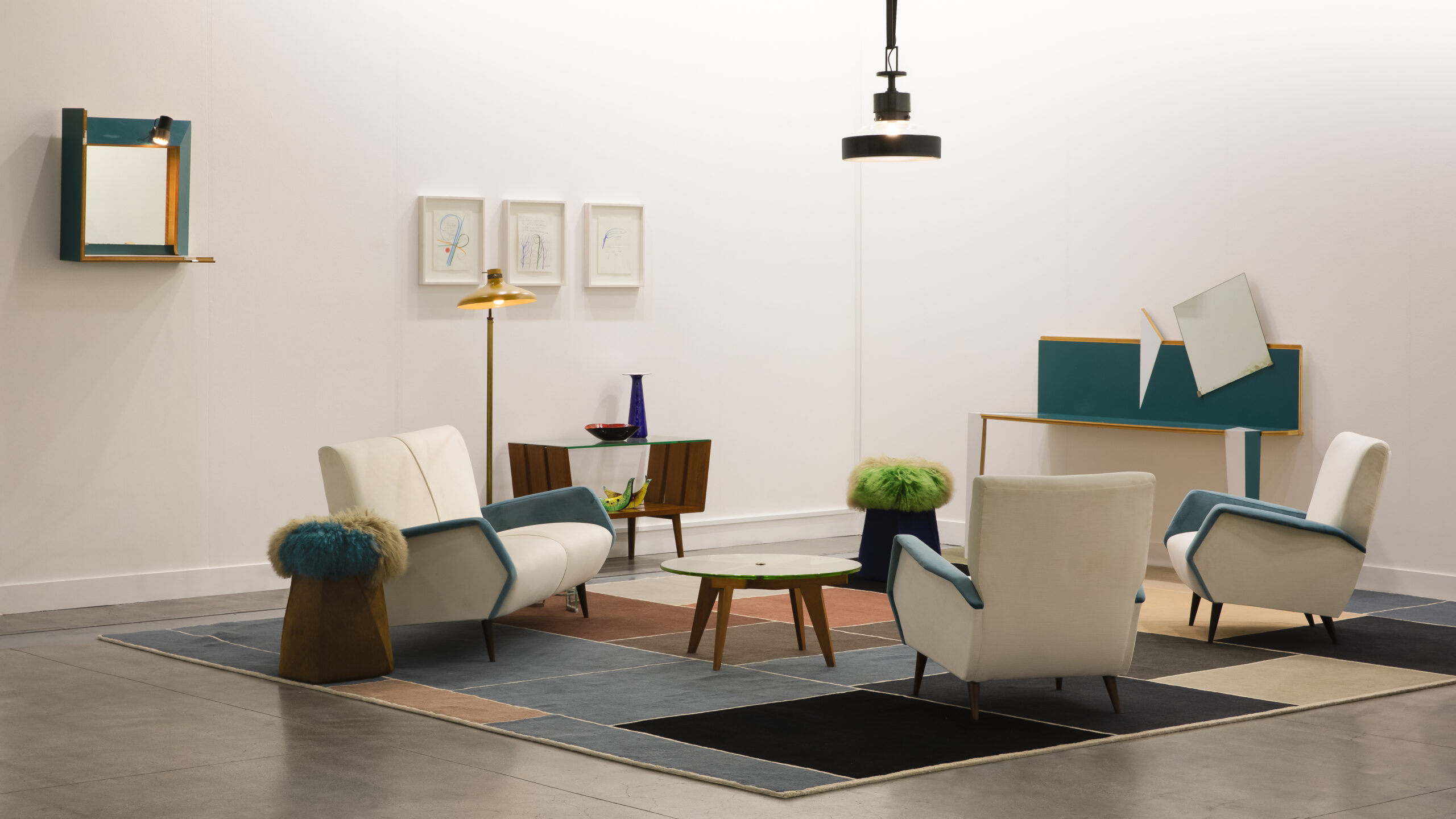 Nilufar’s miart 2021 installation explores the dialogue between Martino Gamper and Gio Ponti, blending past, present, and future design with a visual interplay of colors and iconic furniture pieces