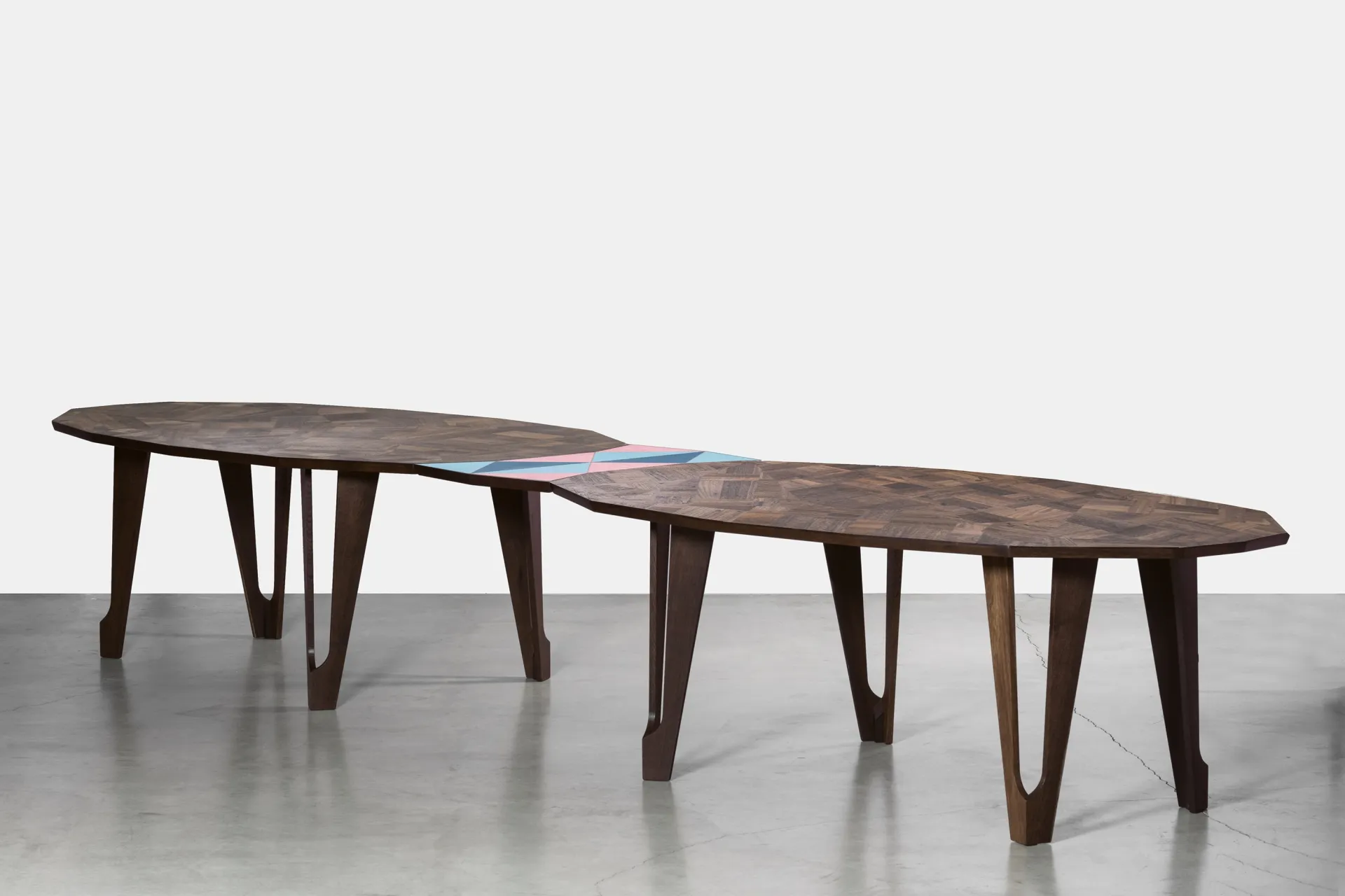 A combination of two extremely influential figures, Martino Gamper and Gio Ponti, that shines the spotlight on a console table designed by Gamper for his performance at the 2008 exhibition “Gio Ponti translated by Martino Gamper” reinterpretingthe furniture pieces created by Ponti for the Hotel Parco dei Principi in Sorrento and the ironic pony skinand Mongolian shearling wool Wikatoriastools, combined with exclusive upholstered pieces by Gio Ponti, such as the iconic mod. 803 sofa and armchairs, and with tables such as the one featured in the Hotel della Città et de la Ville in Forlì and designed for the Garzanti Foundation. “An act to rethink, repossess and recreate adestiny for iconic objects in order to share them with the general public once again, to breathe new life into them and to give them a new intended use”, said Martino Gamper during his performance in 2008.