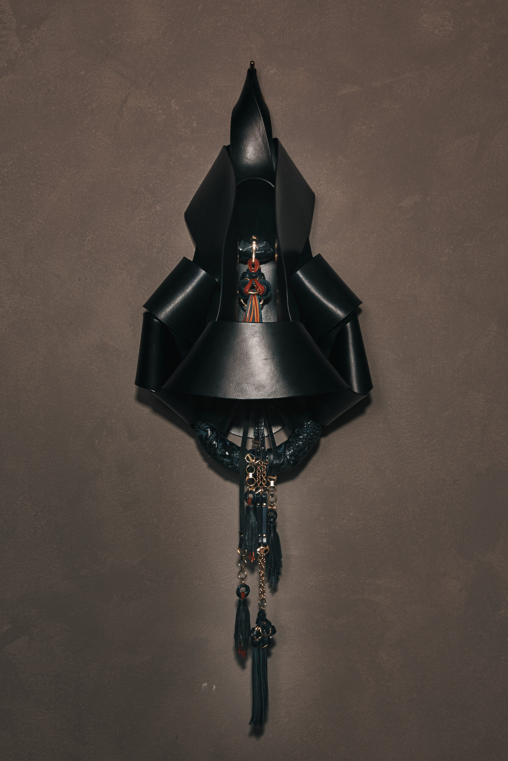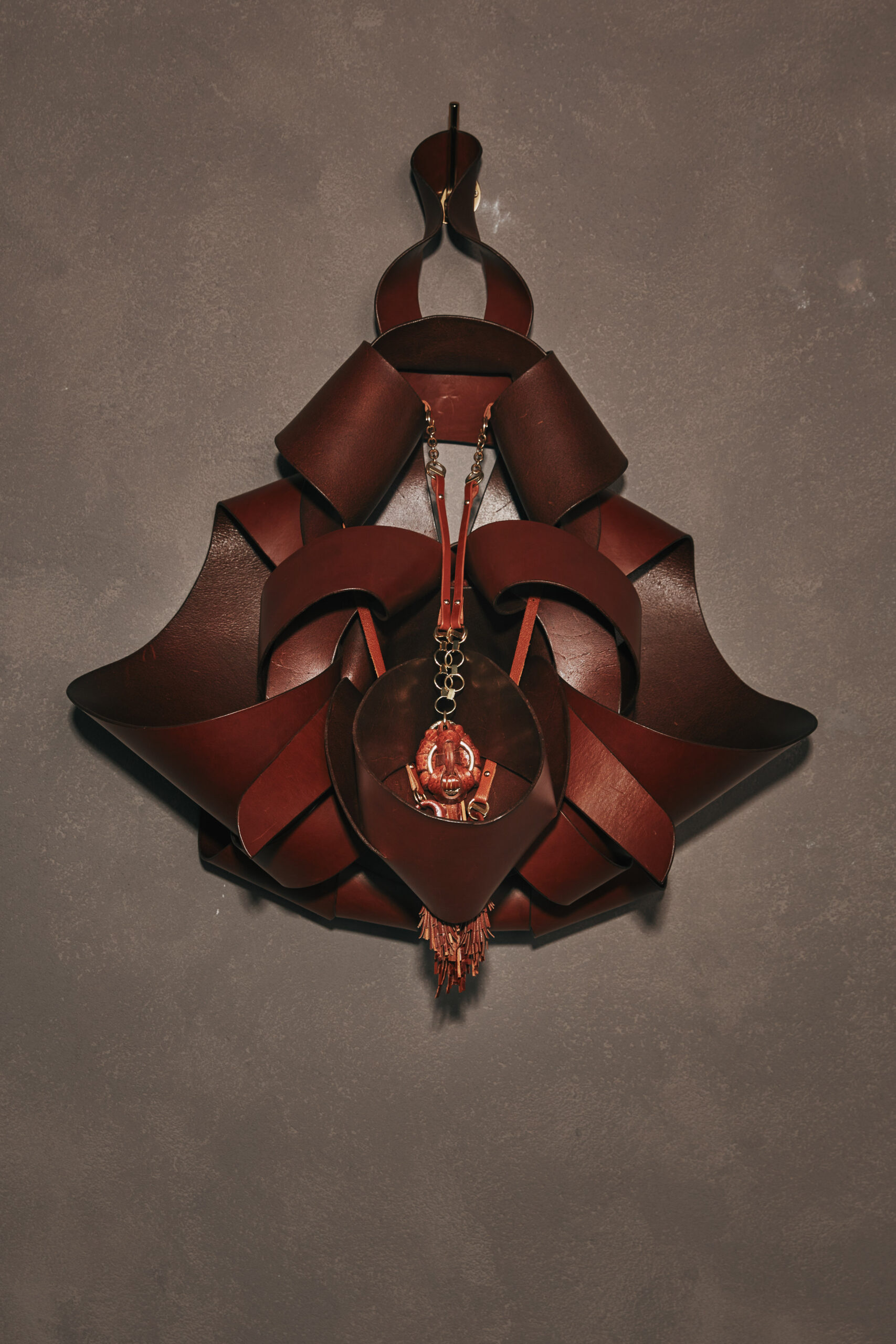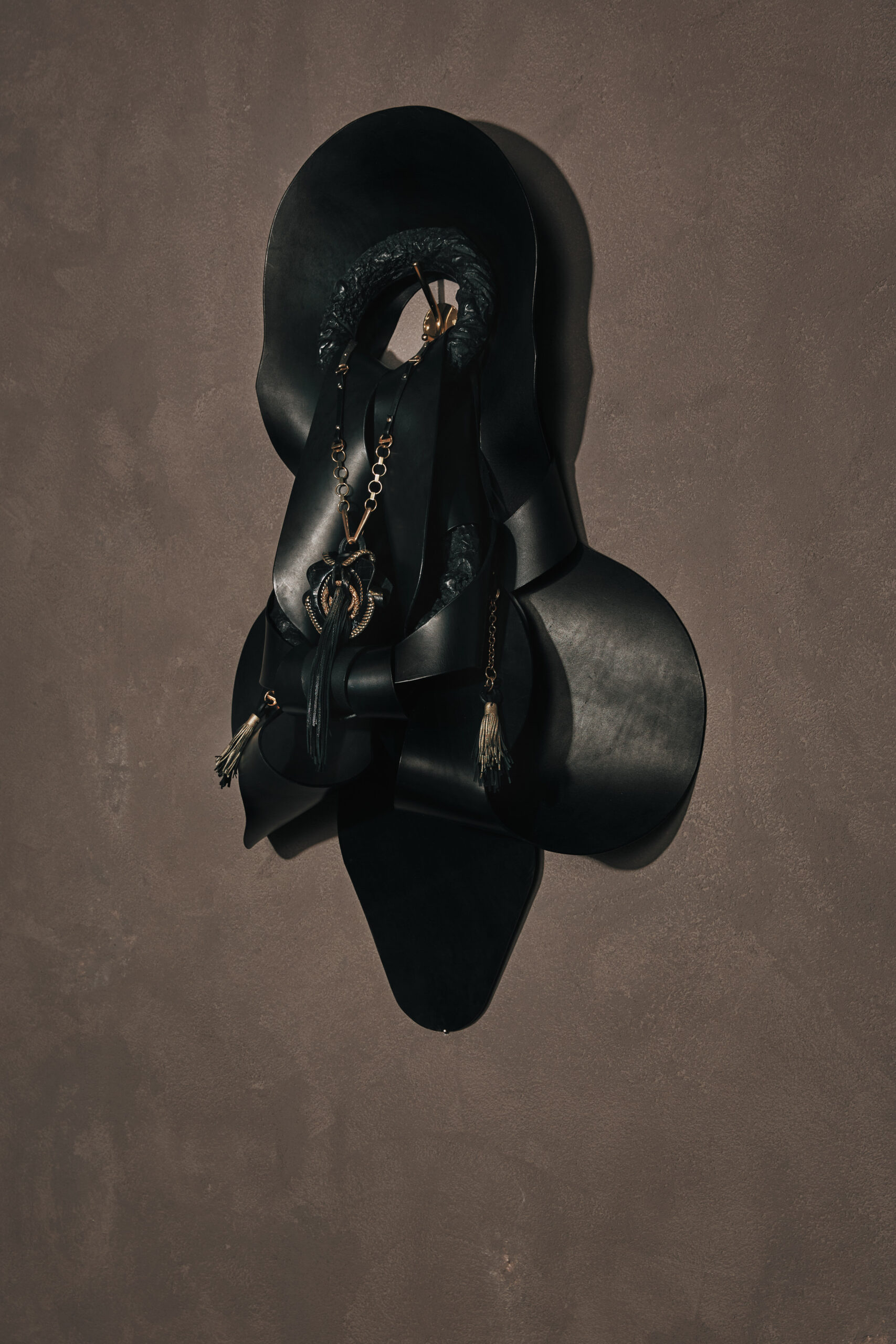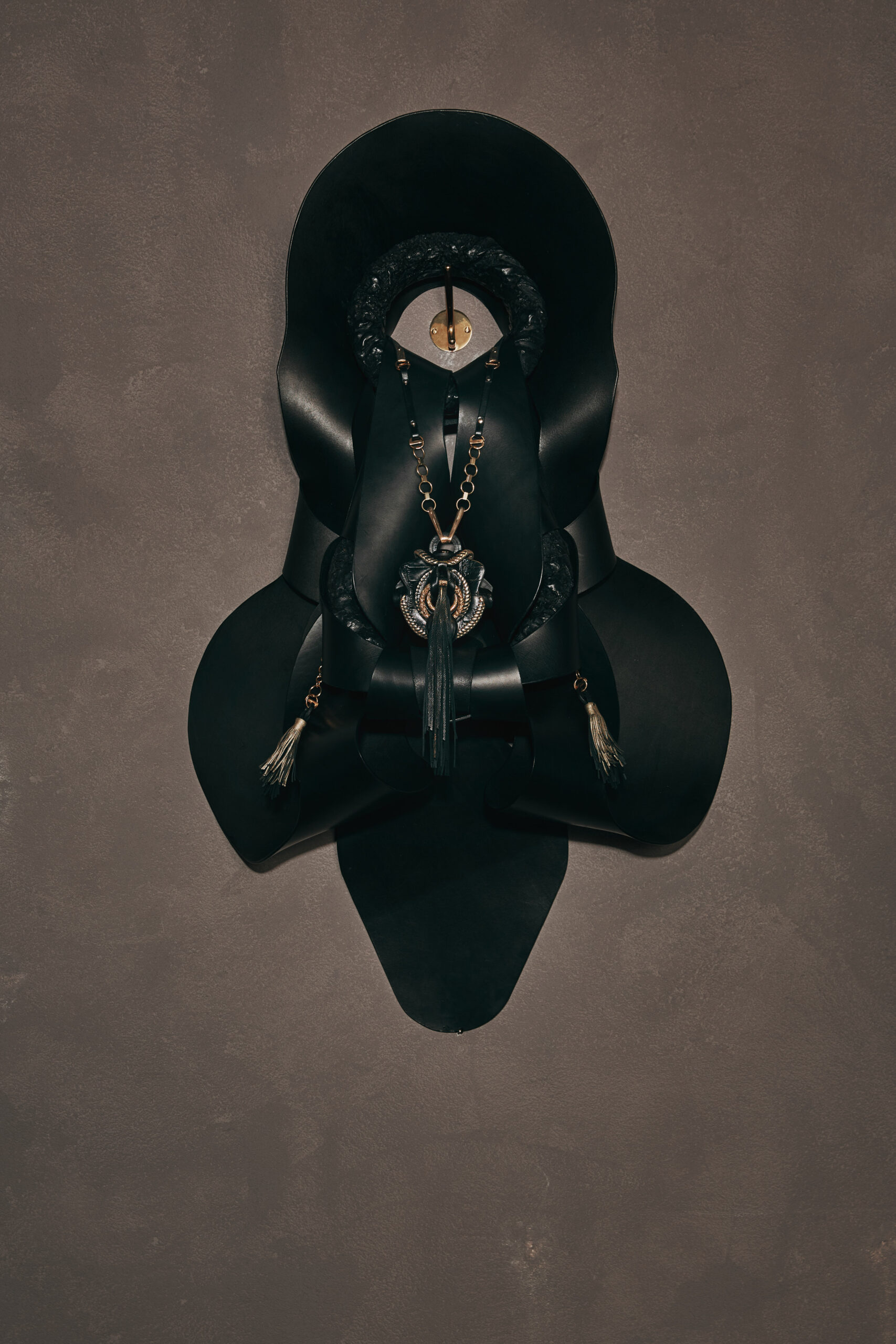 The Origine NeckPieces are highly crafted, leather and cast bronze pendants whose enigmatic presence feel like contemporary and abstracted versions of ancient fertility figurines, sacred objects, or ritualistic artifacts. These captivating knotted pieces interact with her Anatomies, themselves large and sensuously knotted forms.