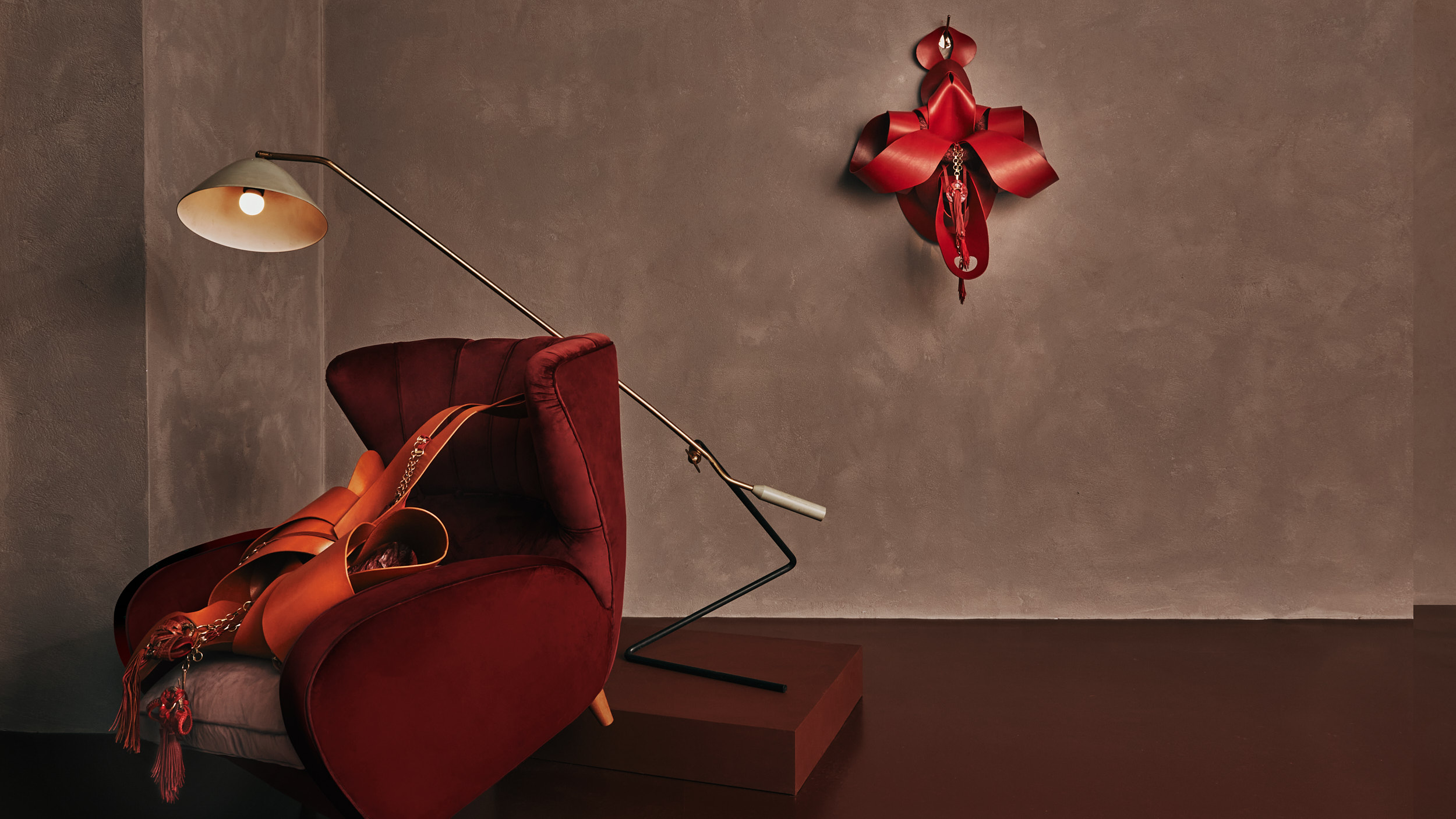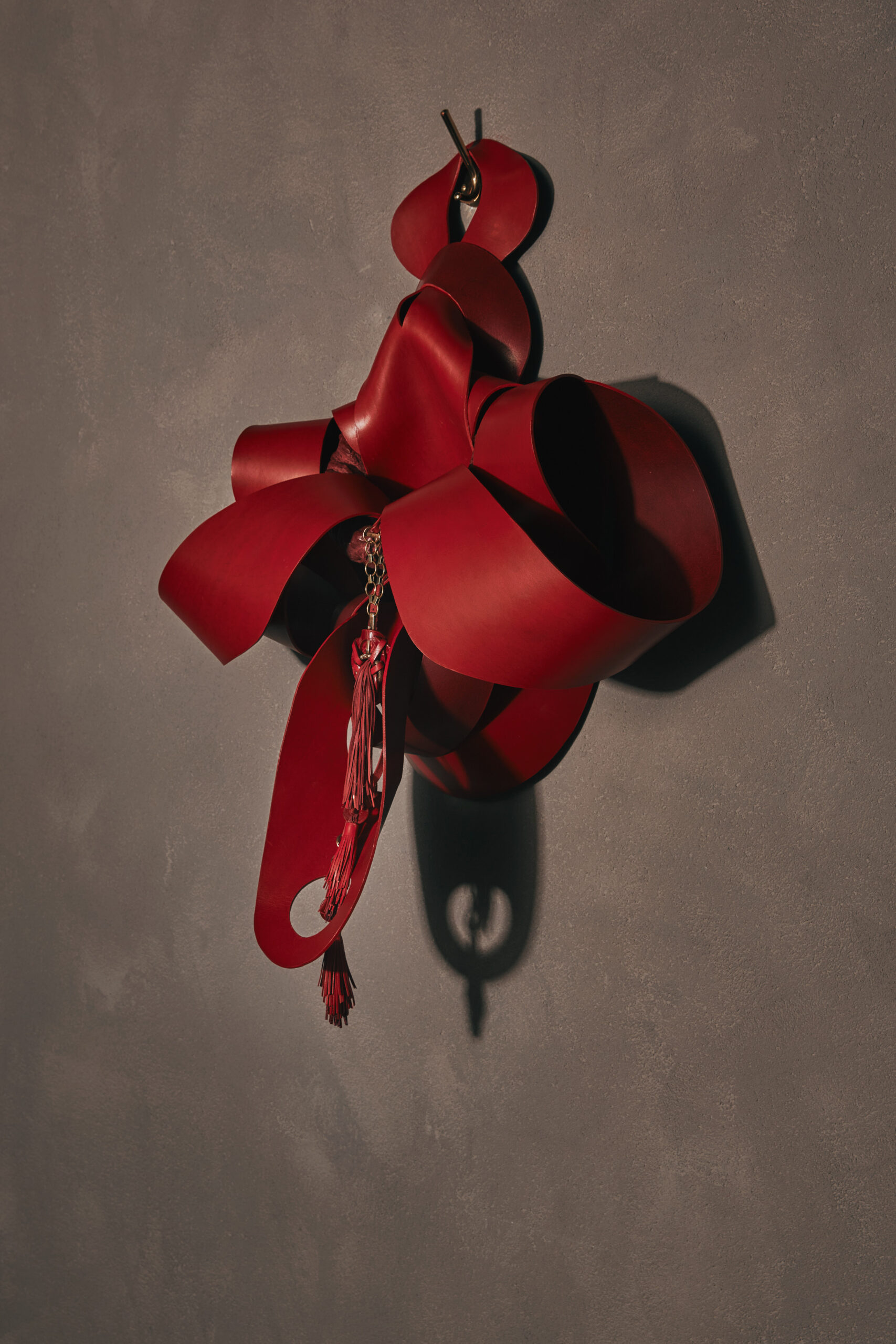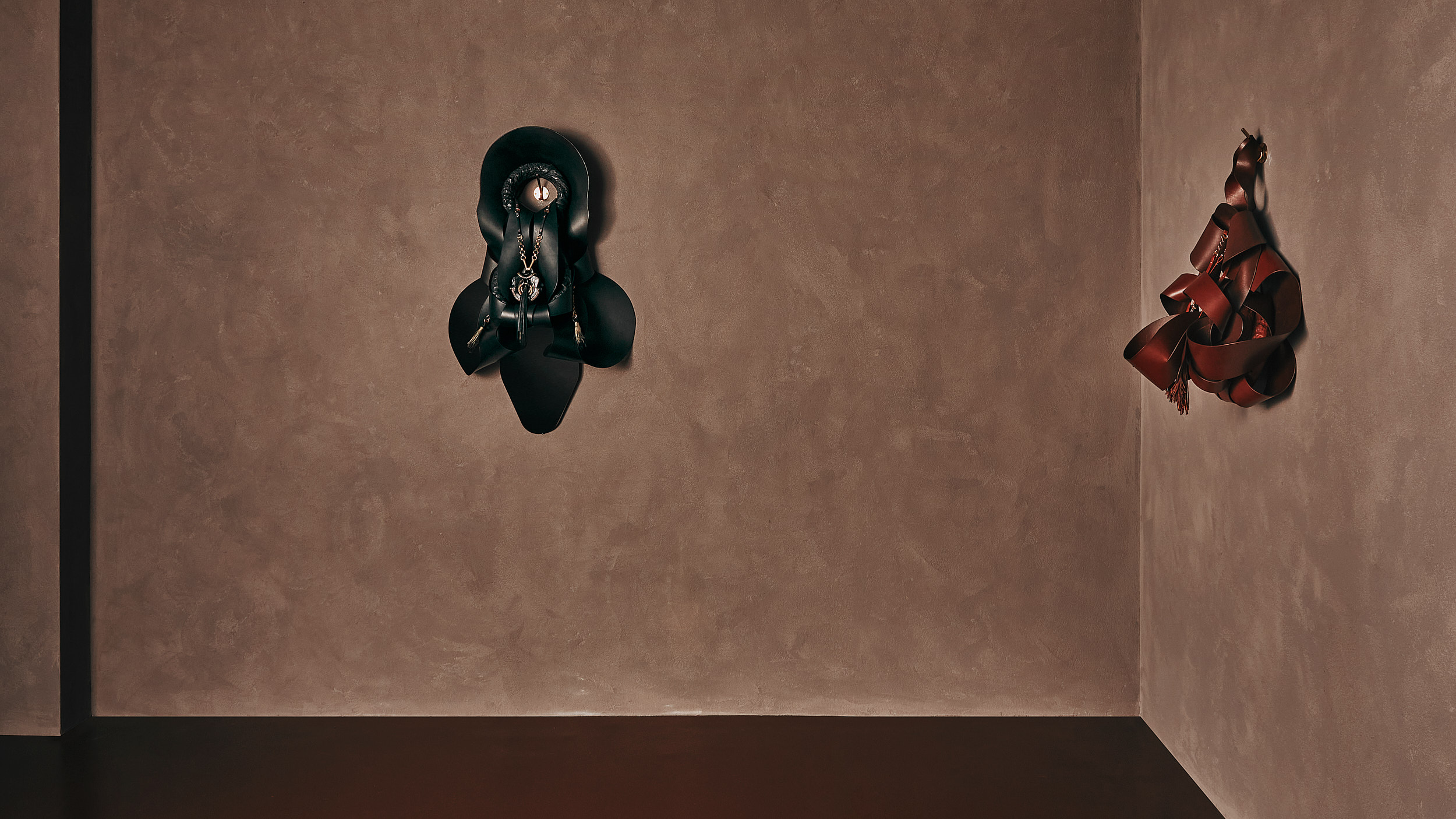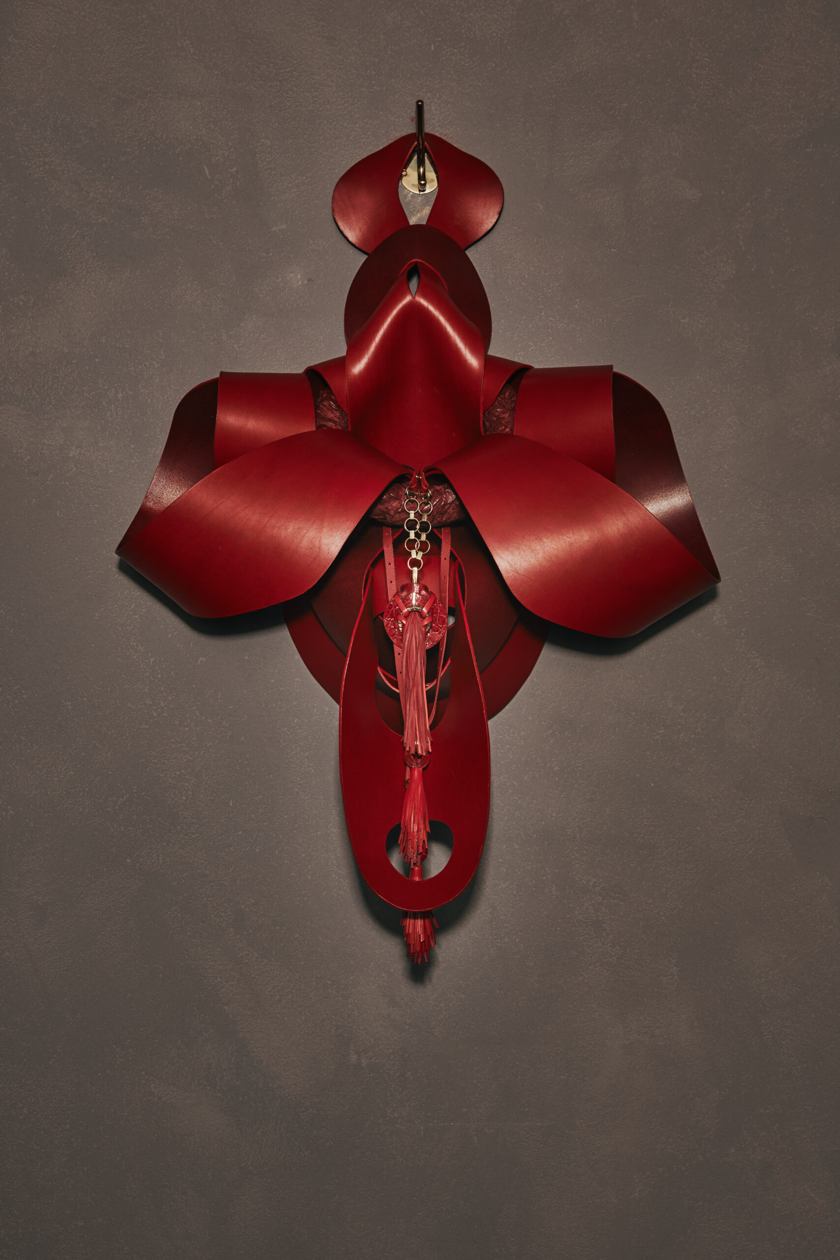 Crafted from vegetable tanned leather and industrial wax, the Anatomies wall sculptures provide the NeckPieces with a home that is native to them, mediating between them and the surrounding space. When describing the Anatomies, Cardelús writes “I wanted my NeckPieces to be situated in a place of belonging, a place that supplants the human body while suggesting, at the same time, a place of origin. By the time I finished the Anatomies, I was thinking of them as many things…dissected or deconstructed bodies, vessels, flowers, frames, nests, caves, altars, jars, emanations, books, blankets…and more…”