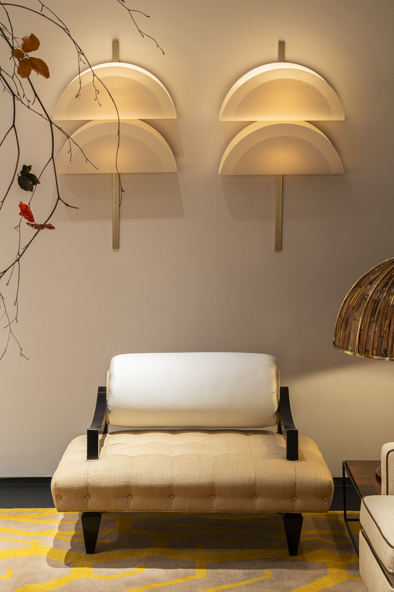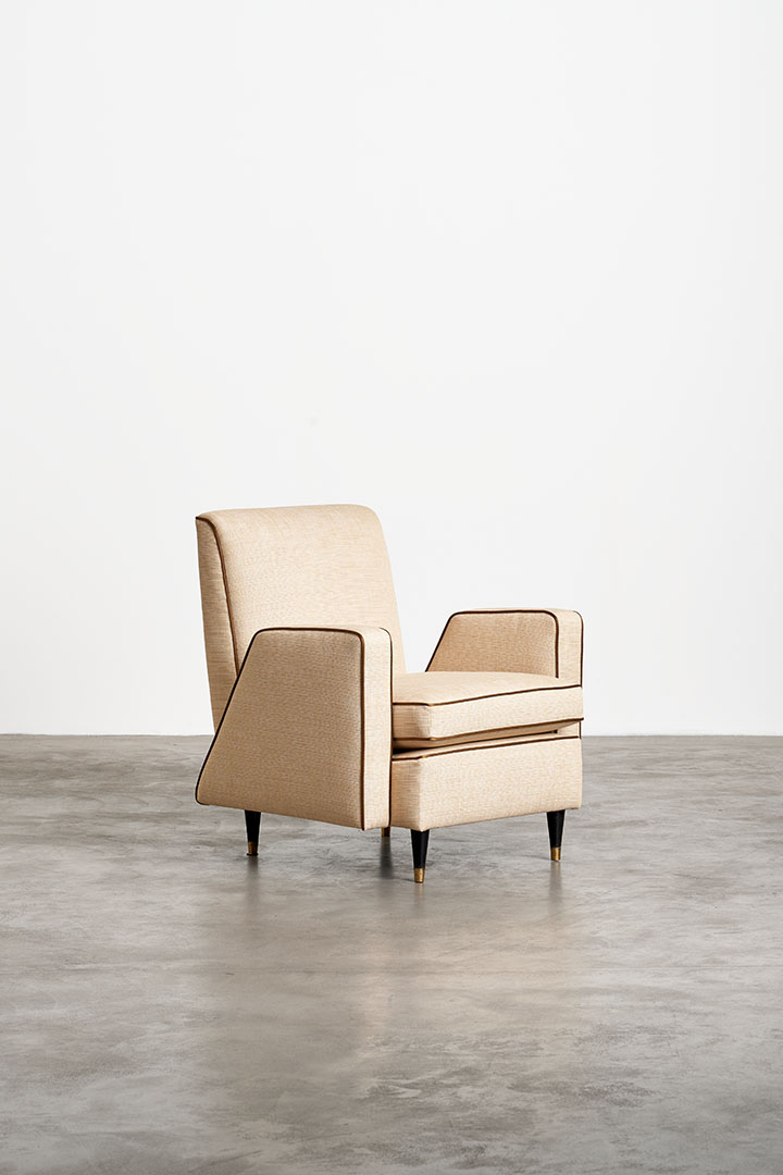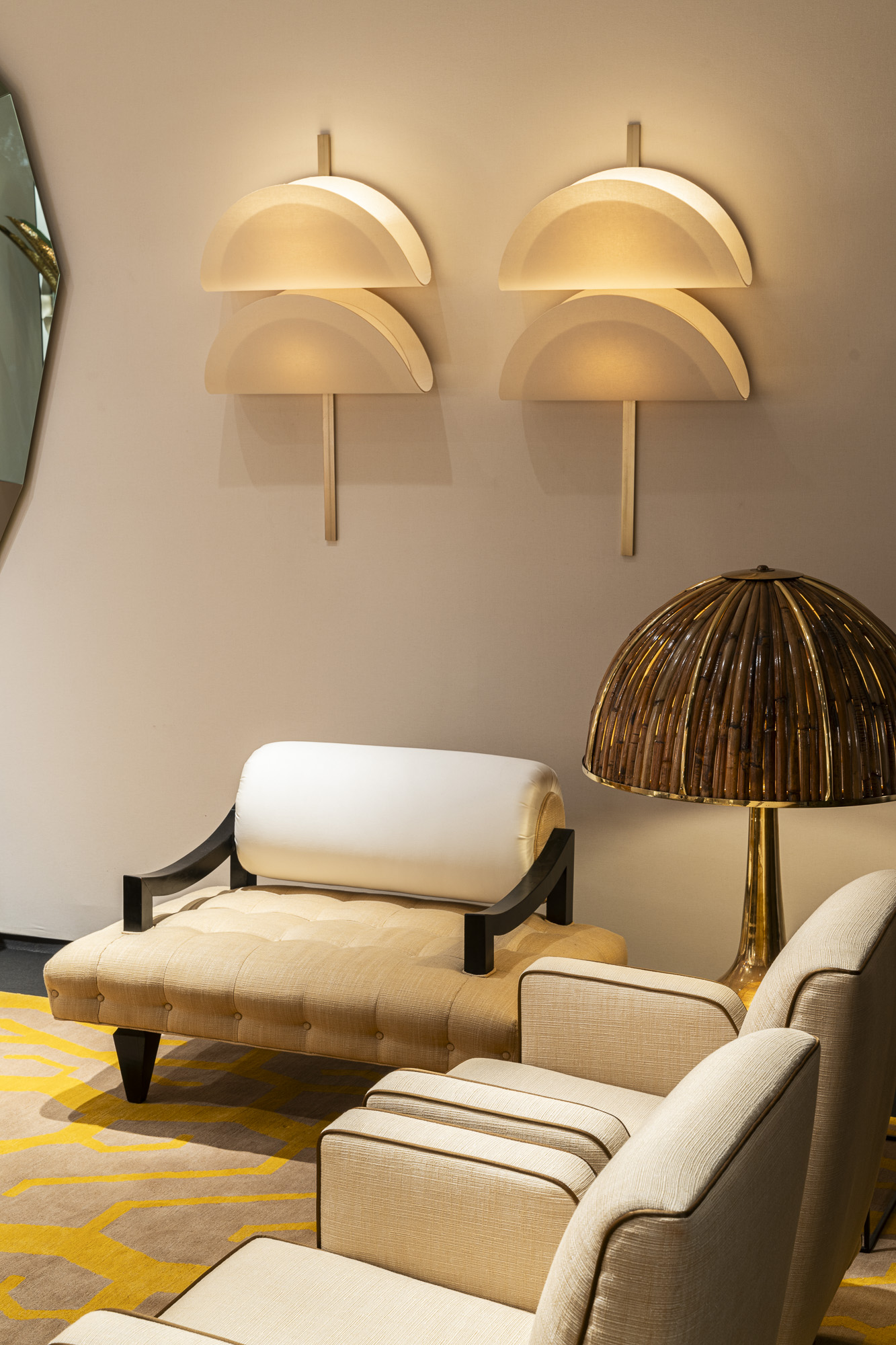Focusing on the vintage selection, Nilufar presents a pair of 1950s American design armchairs by James Mont, showcasing enduring appeal and craftsmanship, 1970s low tables and lamps by Italian designer Gabriella Crespi, emblems of retro charm, and a pair of mid-century Brazilian design armchairs by Giuseppe Scapinelli epitomize elegance and comfort.