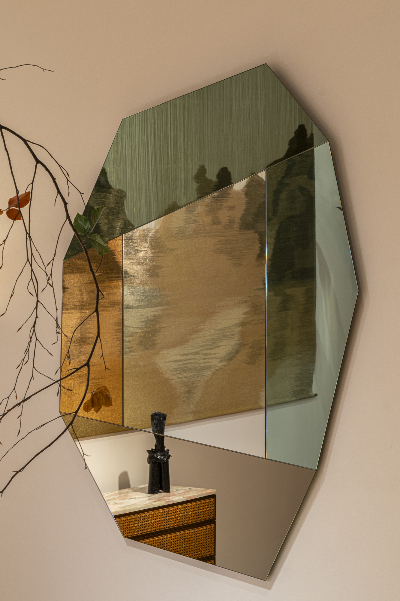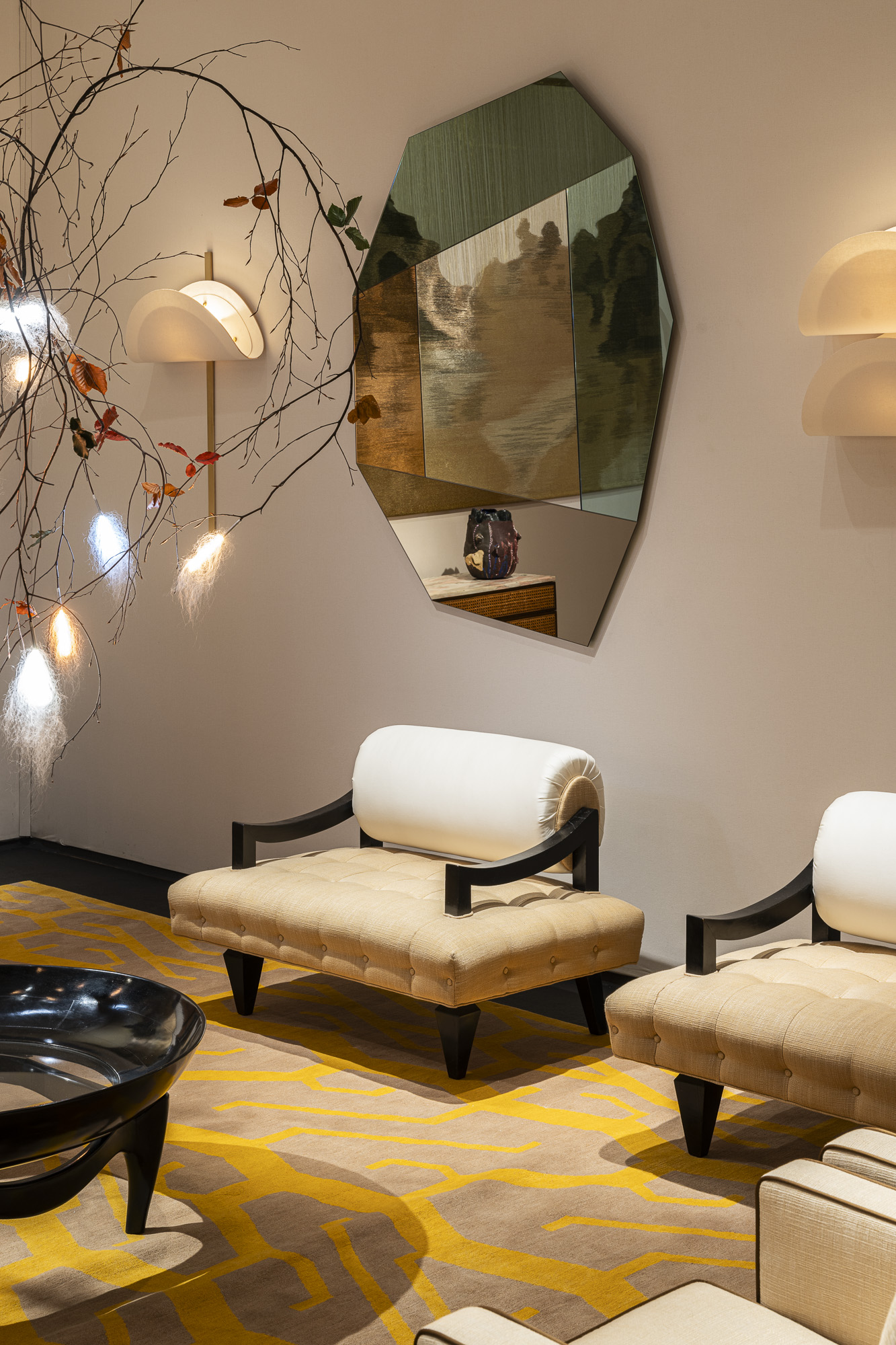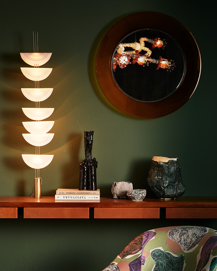Among the contemporary pieces, the unique copper alloy chairs created by Israeli-American designer Shlomo Harush are a testament to modern ingenuity. Illuminating the space with an ethereal glow is a ceiling lamp by Italian designer Maximilian Marchesani as well as a floor and wall lamp by London-based Cypriot designer Michael Anastassiades, while a tapestry by Colombian designer Hechizoo adds a touch of depth.Italian artist Allegra Hicks’ low tables beckon with their graceful lines and understated elegance along with the sculptural materiality of French-Lebanese artist Flavie Audi‘s low table, complemented by a mirror created by the masterful hands of Martino Gamper. Adding a touch of whimsy and intrigue are wall lamps by the french designer Robinson Ferreux, casting playful shadows and transforming the ambiance with their dynamic presence. Meanwhile, a selection of sculptures by Greek artist Anestis Michalis invites reflection, each piece a testament to the power of artistic expression. Rounding out the contemporary showcase is a carpet by Italian duo Caturegli & Formica, its intricate patterns and textures inviting tactile exploration.