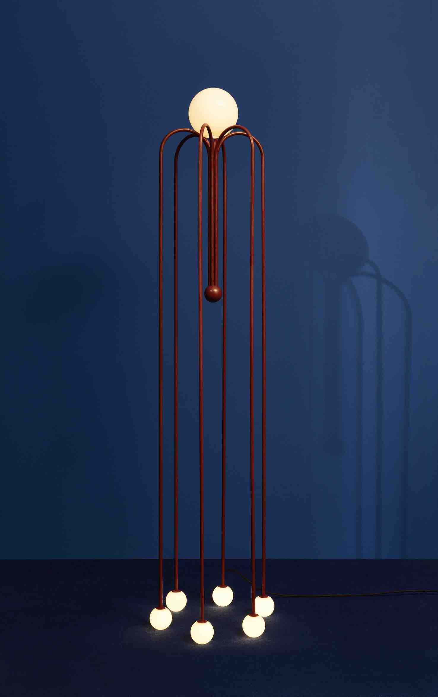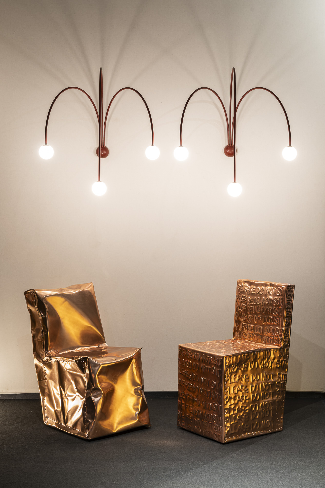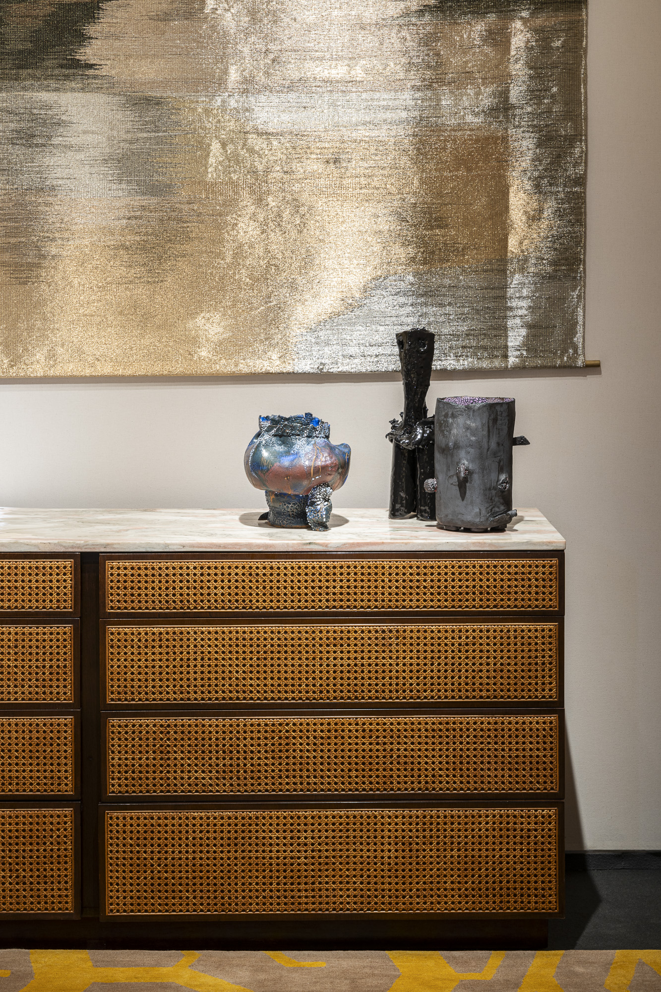 Among the contemporary pieces, the unique copper alloy chairs created by Israeli-American designer Shlomo Harush are a testament to modern ingenuity. Illuminating the space with an ethereal glow is a ceiling lamp by Italian designer Maximilian Marchesani as well as a floor and wall lamp by London-based Cypriot designer Michael Anastassiades, while a tapestry by Colombian designer Hechizoo adds a touch of depth.Italian artist Allegra Hicks’ low tables beckon with their graceful lines and understated elegance along with the sculptural materiality of French-Lebanese artist Flavie Audi‘s low table, complemented by a mirror created by the masterful hands of Martino Gamper. Adding a touch of whimsy and intrigue are wall lamps by the french designer Robinson Ferreux, casting playful shadows and transforming the ambiance with their dynamic presence. Meanwhile, a selection of sculptures by Greek artist Anestis Michalis invites reflection, each piece a testament to the power of artistic expression. Rounding out the contemporary showcase is a carpet by Italian duo Caturegli & Formica, its intricate patterns and textures inviting tactile exploration.