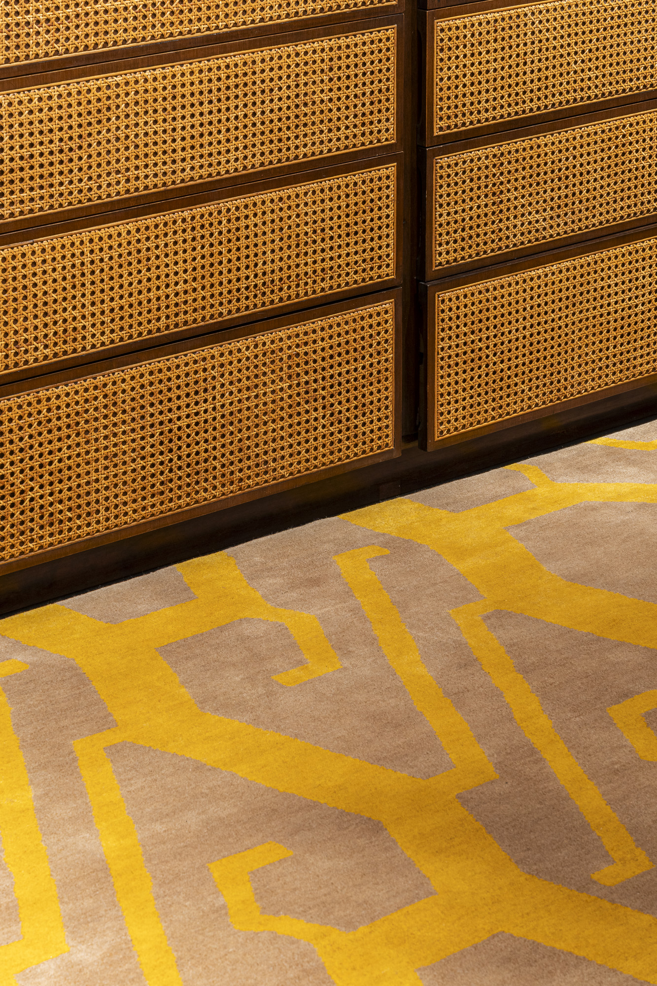 From sleek consoles to exquisite cabinets, versatile side tables, Goyal’s collection embodies a perfect blend of tradition and modernity. Illuminating the space are his lighting fixtures and mirror.