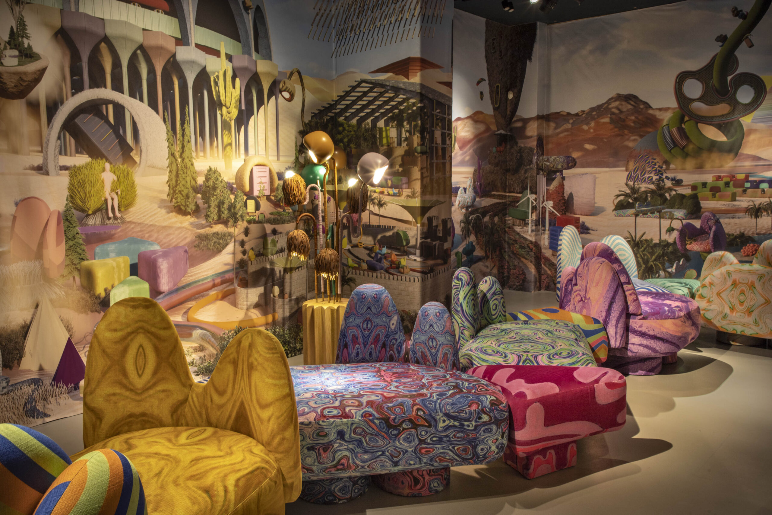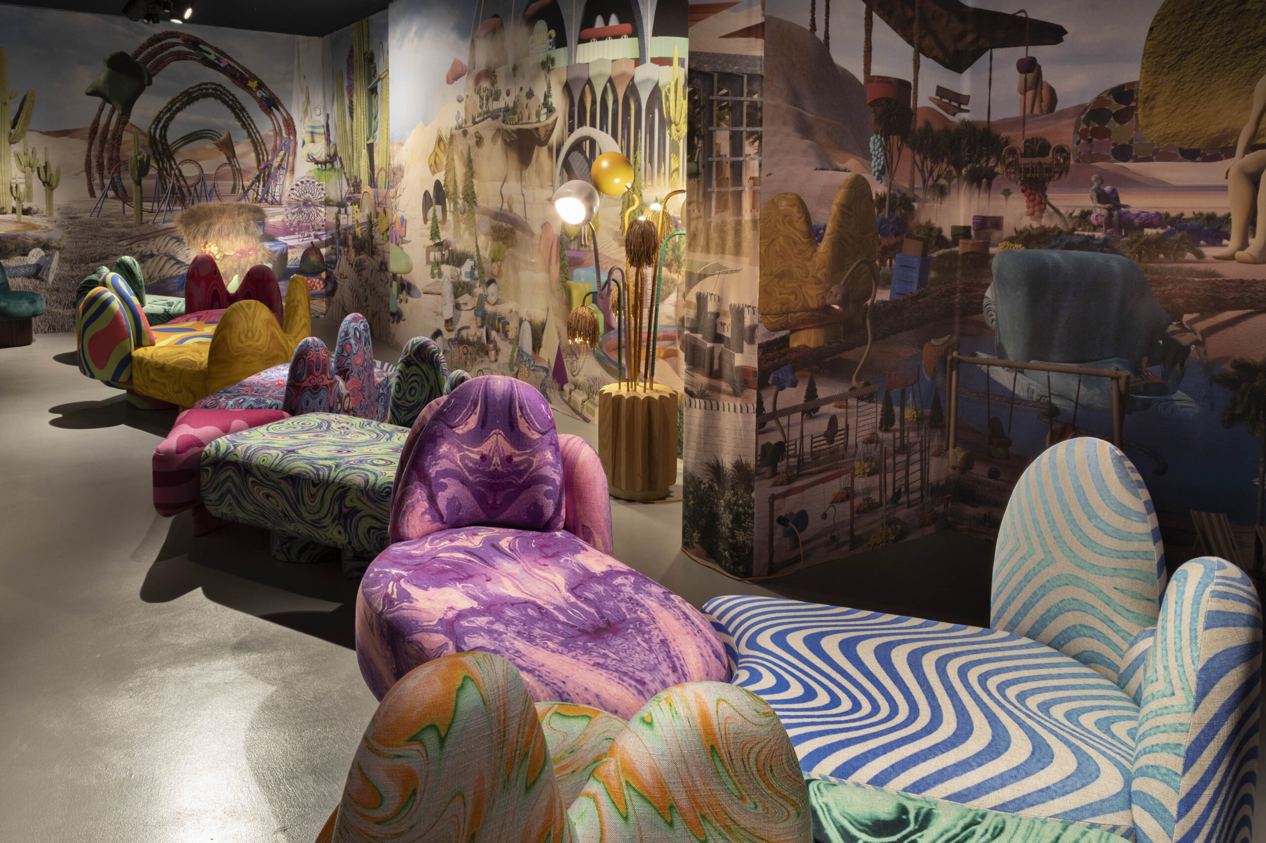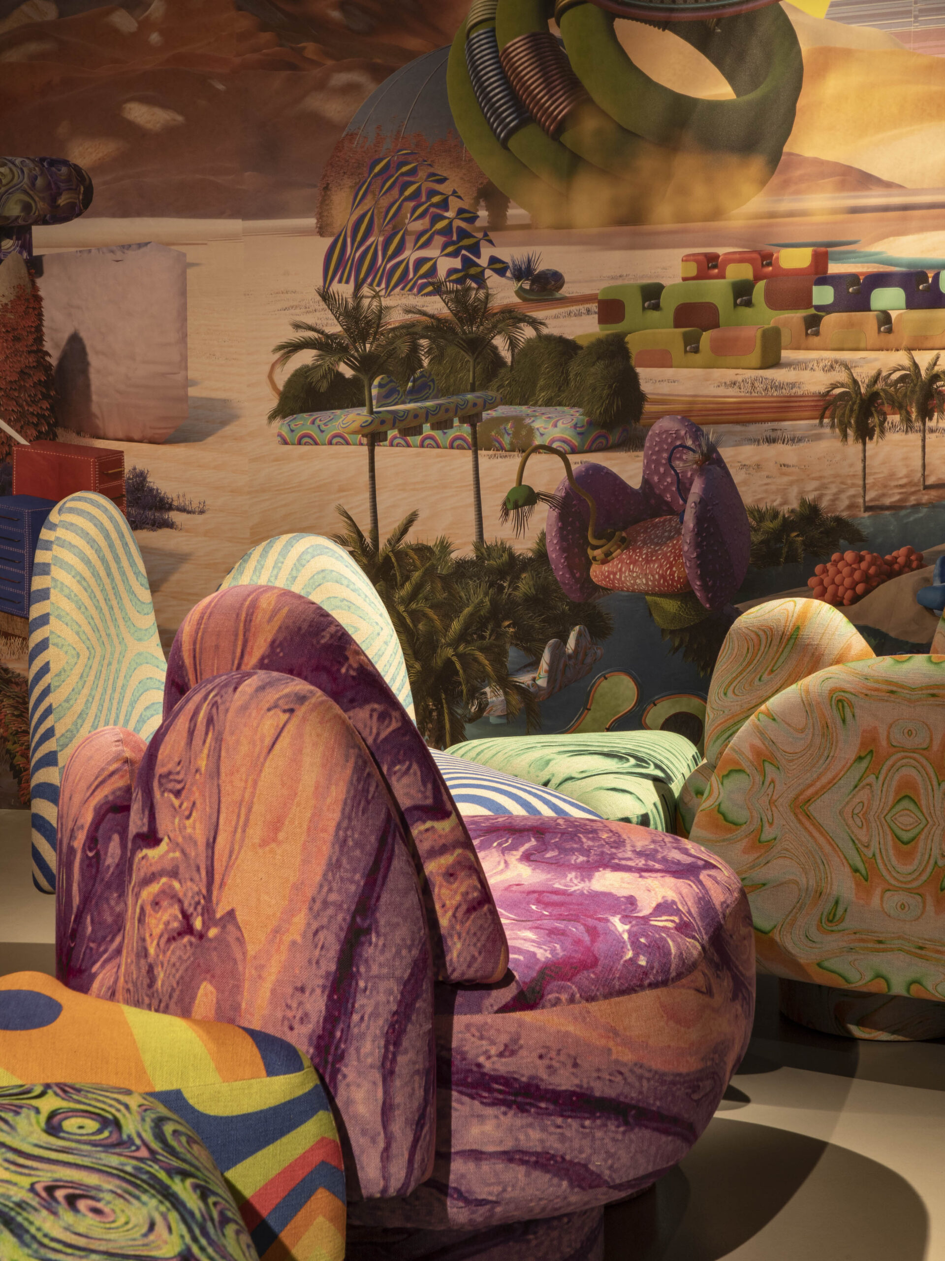 Khaled El Mays presents a psychedelic iteration of his Flora Seating Series at Nilufar, inviting visitors into a dreamy, otherworldly experience with modular sofas and immersive installations