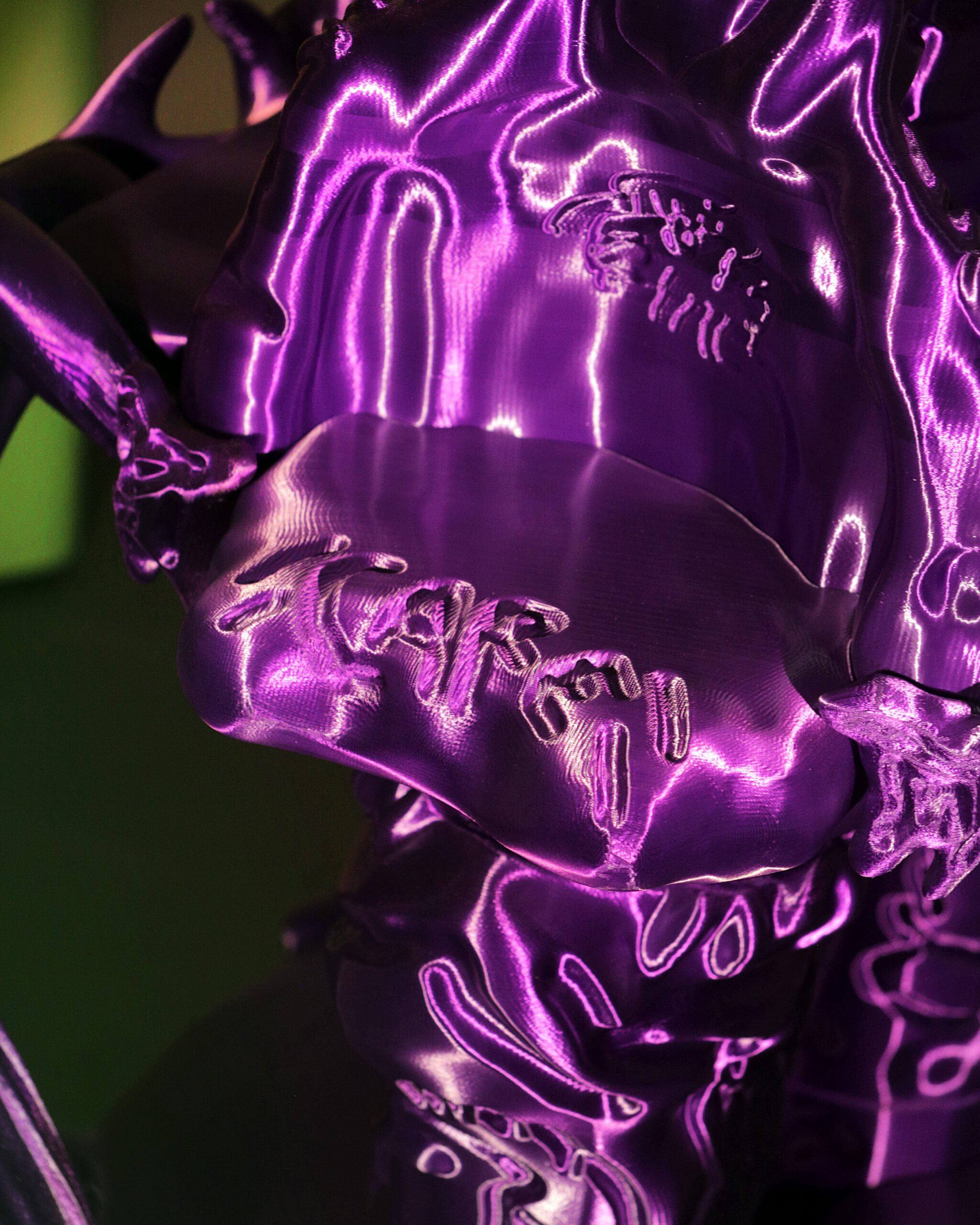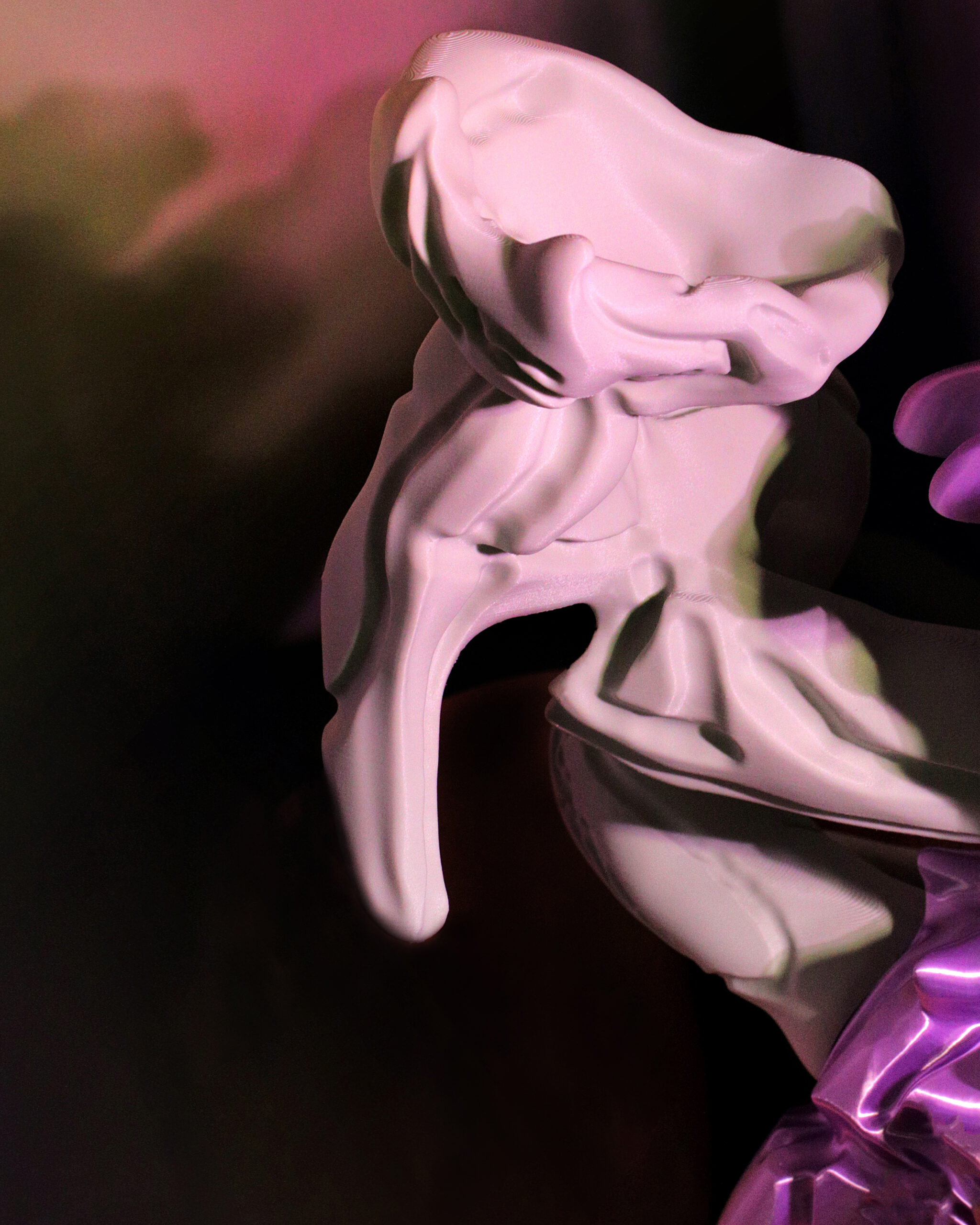 What is observed in these images is a dialogue, a meeting of two expressive languages: that of the photographer Sara Scanderebech and the designer and artist Audrey Large. But it’s more than that. It’s a realm where photography and sculpture converge, where reality and the digital realm intersect, where representation blends with abstraction, and where mimesis dances with illusion.
