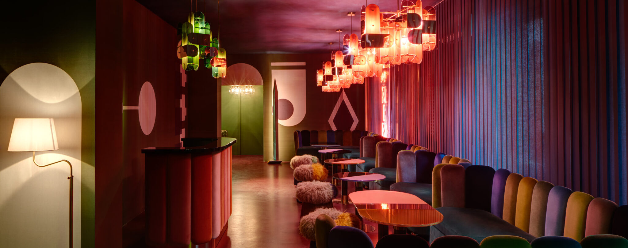 Chez Nina, a private club designed by India Mahdavi, blends sophisticated design with intimate atmospheres, featuring vintage and contemporary pieces, luxurious fabrics, and a unique ambiance