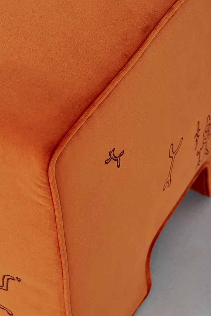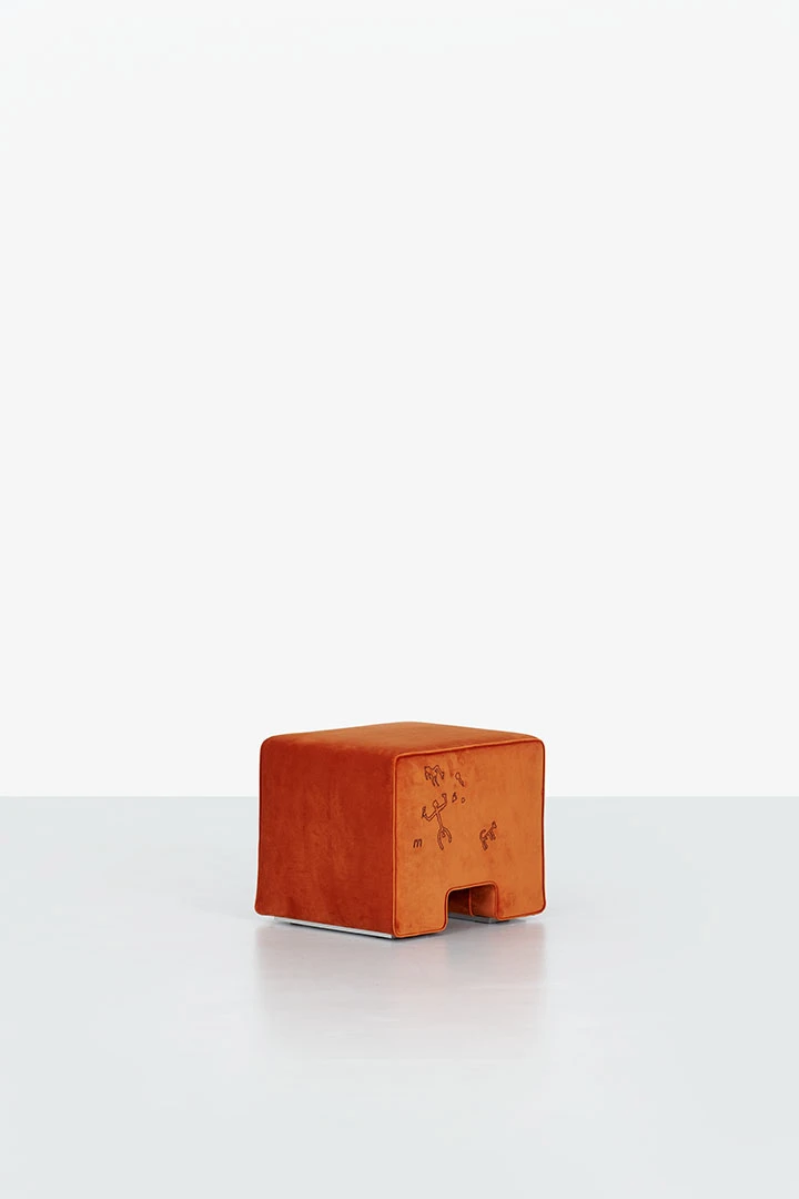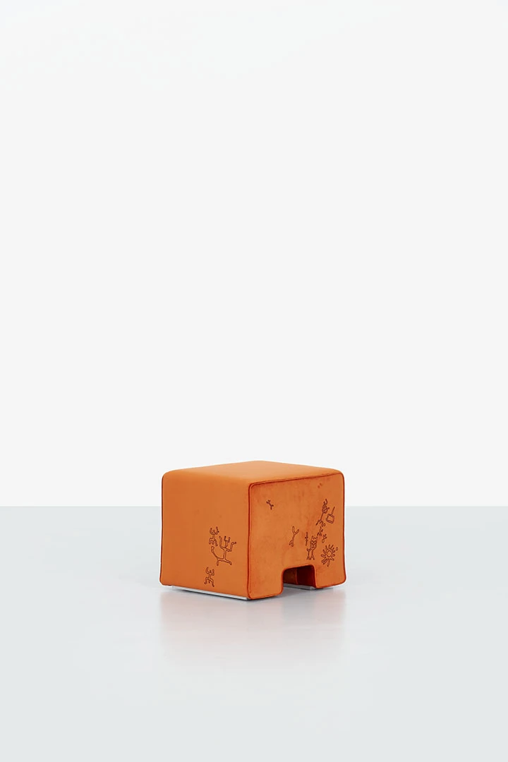 This block-shaped seat relies on a simple volume and decorative textured patterns that call to mind cave drawings and engravings from the distant past. The elementary form has a structure in wood and features three models upholstered in a patent leather effect fabric in pink, blue or brown colors as well as two models upholstered in velvet with contrasting embroidery in a pink or brown hue.