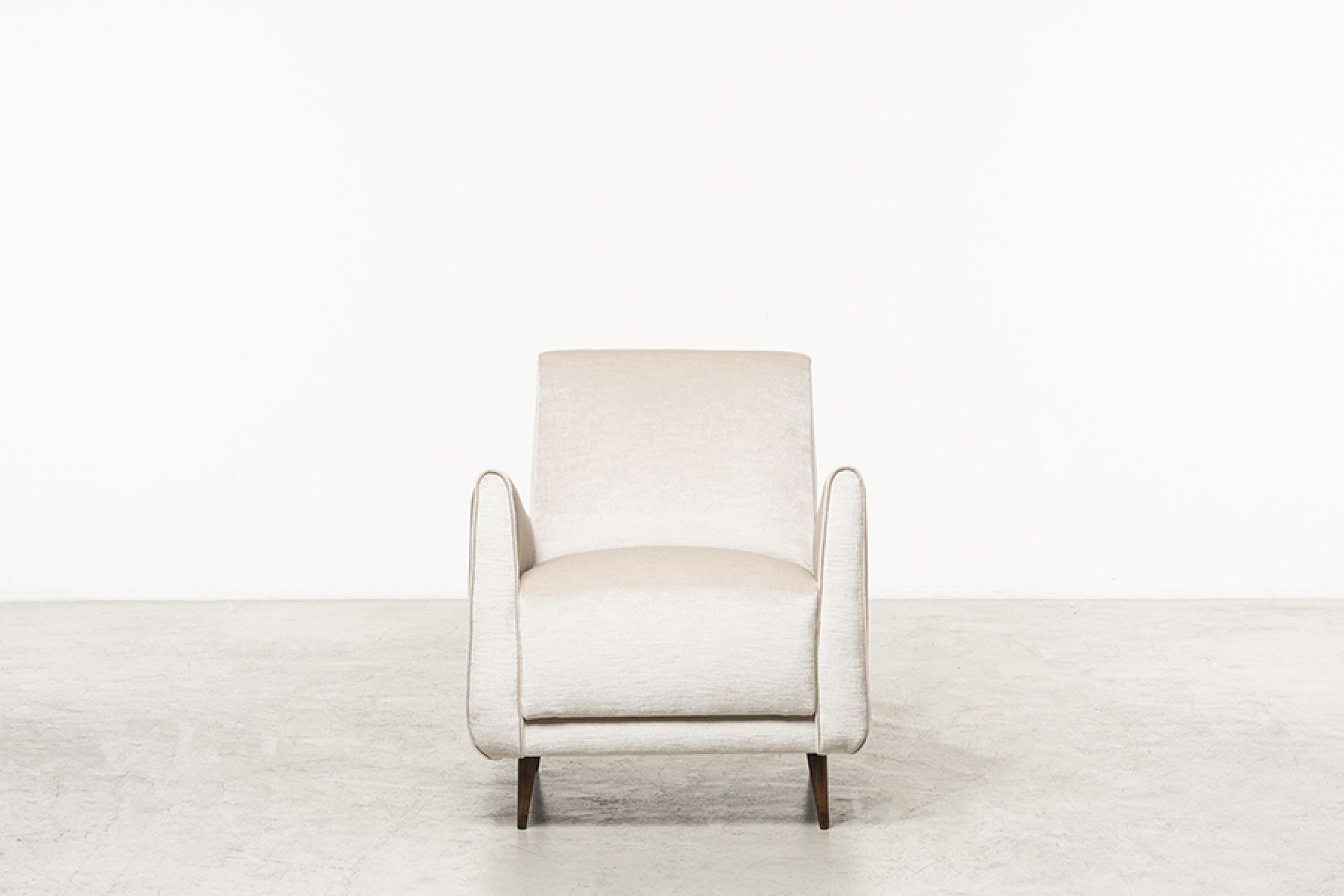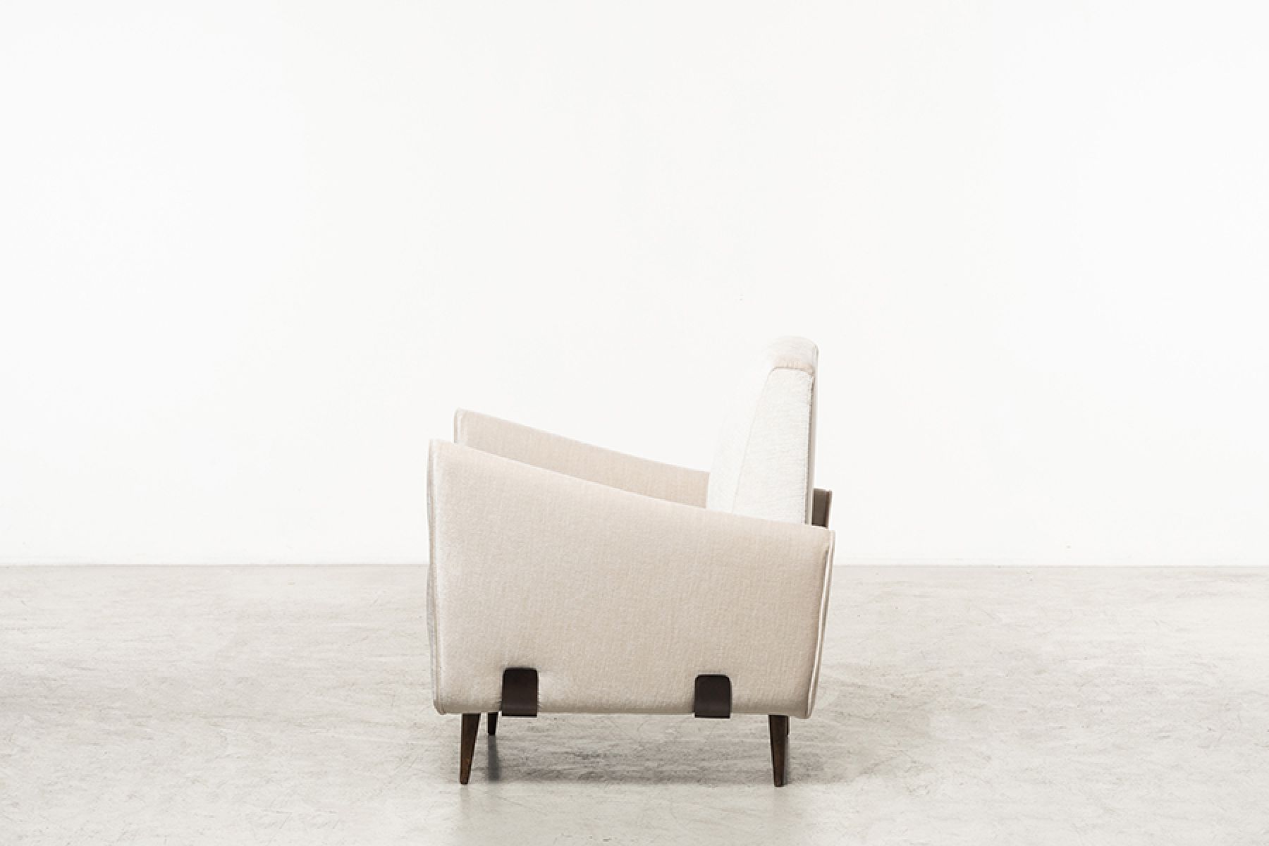Manufactured in 1961 by Jorge Zalszupin company, L’Atelier, the mod. 801 armchair exemplifies the designer’s innovative approach to modern design. The striking contrast between the refined, sophisticated fabric and the rich Jacaranda wood structure elevates this piece to a timeless icon. These elements highlight the minimalistic elegance of Brazilian design, further emphasize by its simple yet captivating lines and armrests.