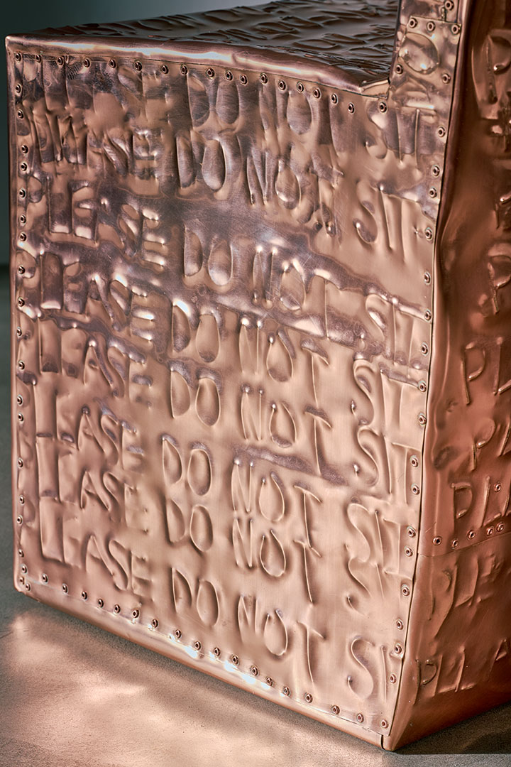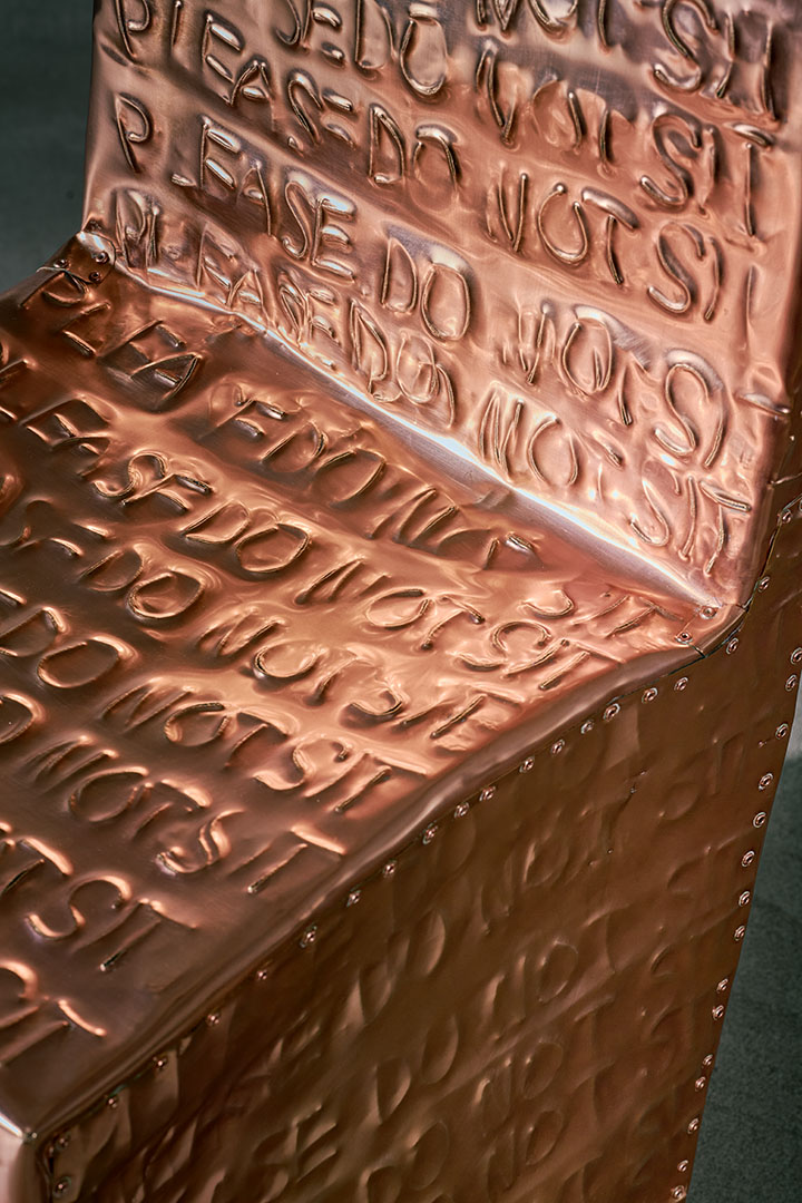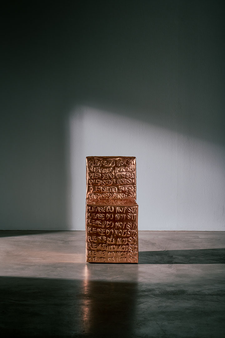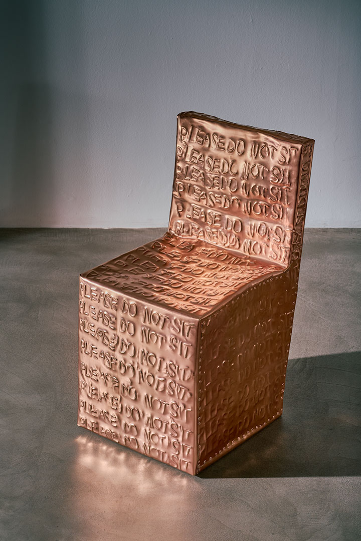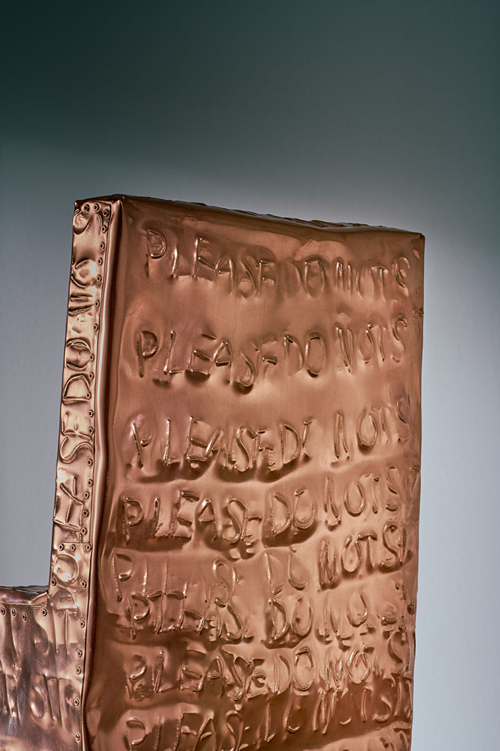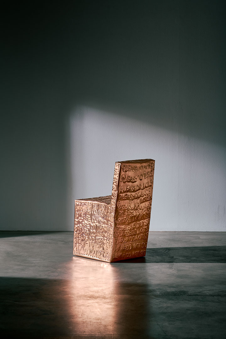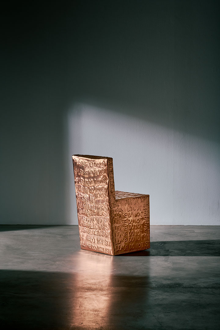 Exploring the interplay between familiar shapes and unexpected materials, this body of works by Shlomo Harush delves into the ongoing relationship between art and function. The manipulation, gravity, intertwining and nailing of the copper alloy or brass in gold tones express tension, life and experience, a feeling of contemporary existence and artistic communication.