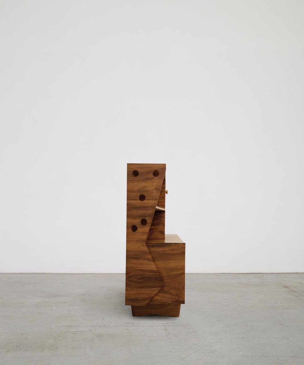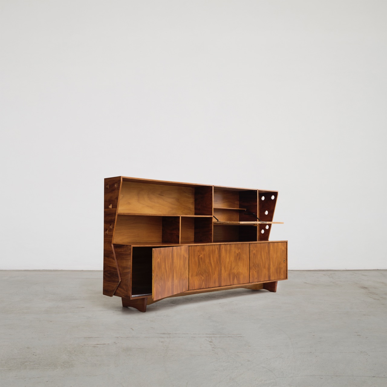 Manufactured in the 1950s by José Zanine Caldas’ company, Móveis Artísticos Z, this bar cabinet exemplifies his innovative approach to design. Caldas approached wood with a profound understanding of its nature, limits, and possibilities. He balanced traditional craftsmanship, readily available materials like plywood, and industrial production techniques. The result was accessible modern designs that maintained exceptional quality in both construction and aesthetics.