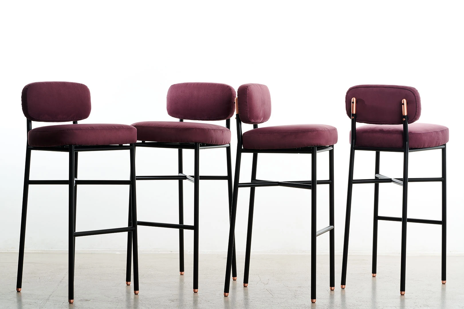 Black laquered metal frame, copper details, suede upholstery