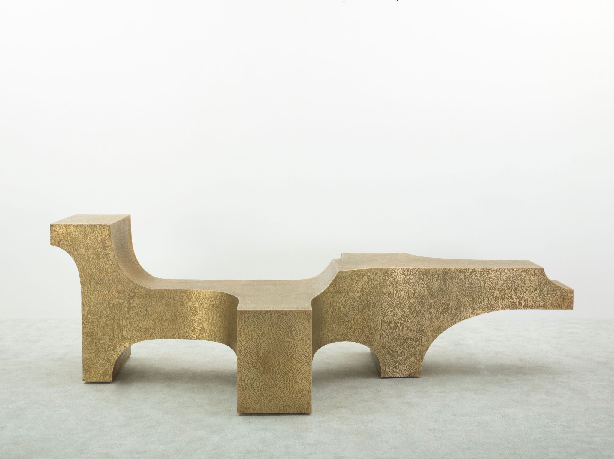 Golden Arc, a solid console, a bench and a seat in patinated gold finish, represent a new language for the studio, and have an architectural quality explored through intersecting surfaces, arches and columns.