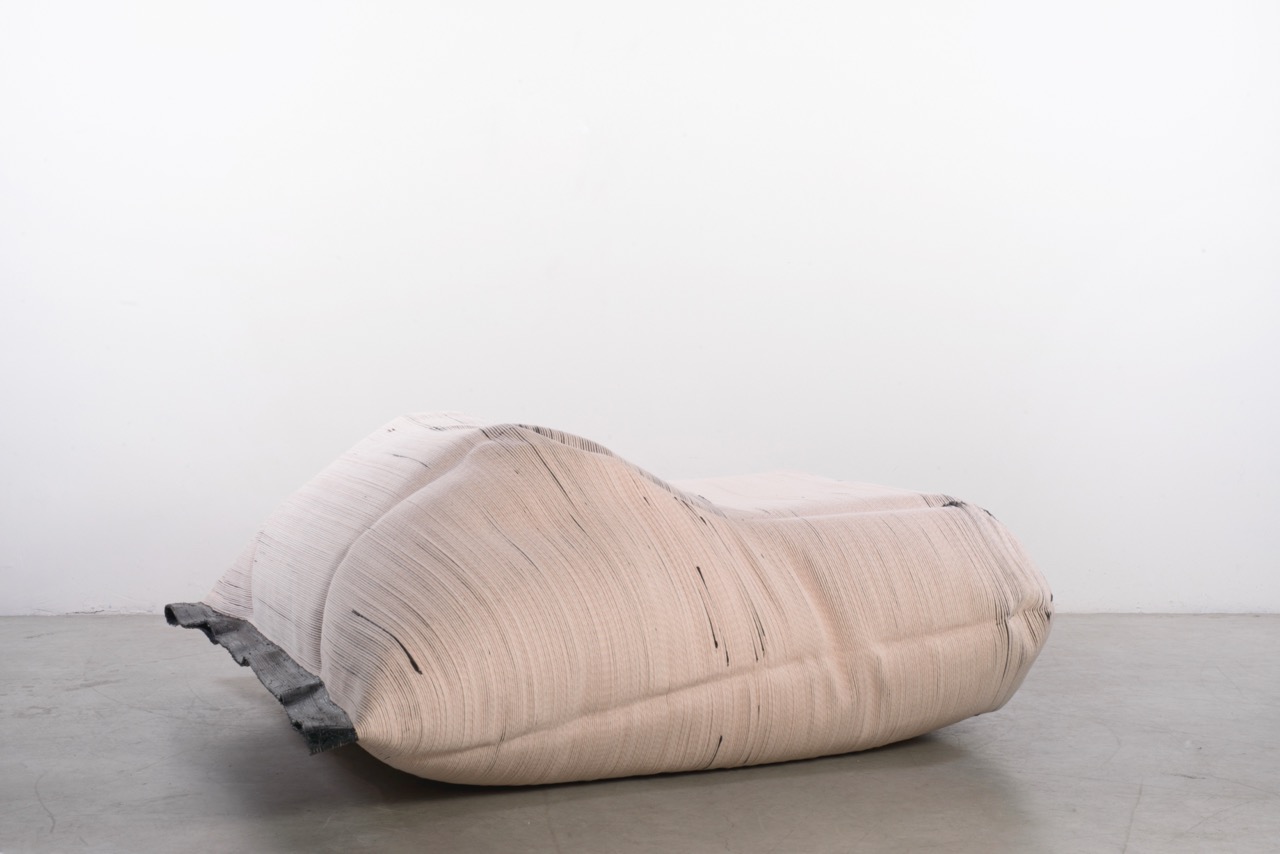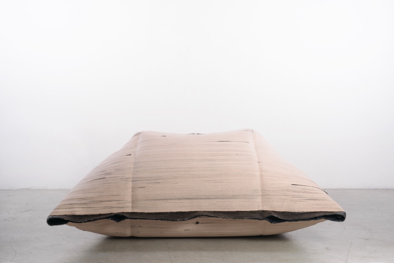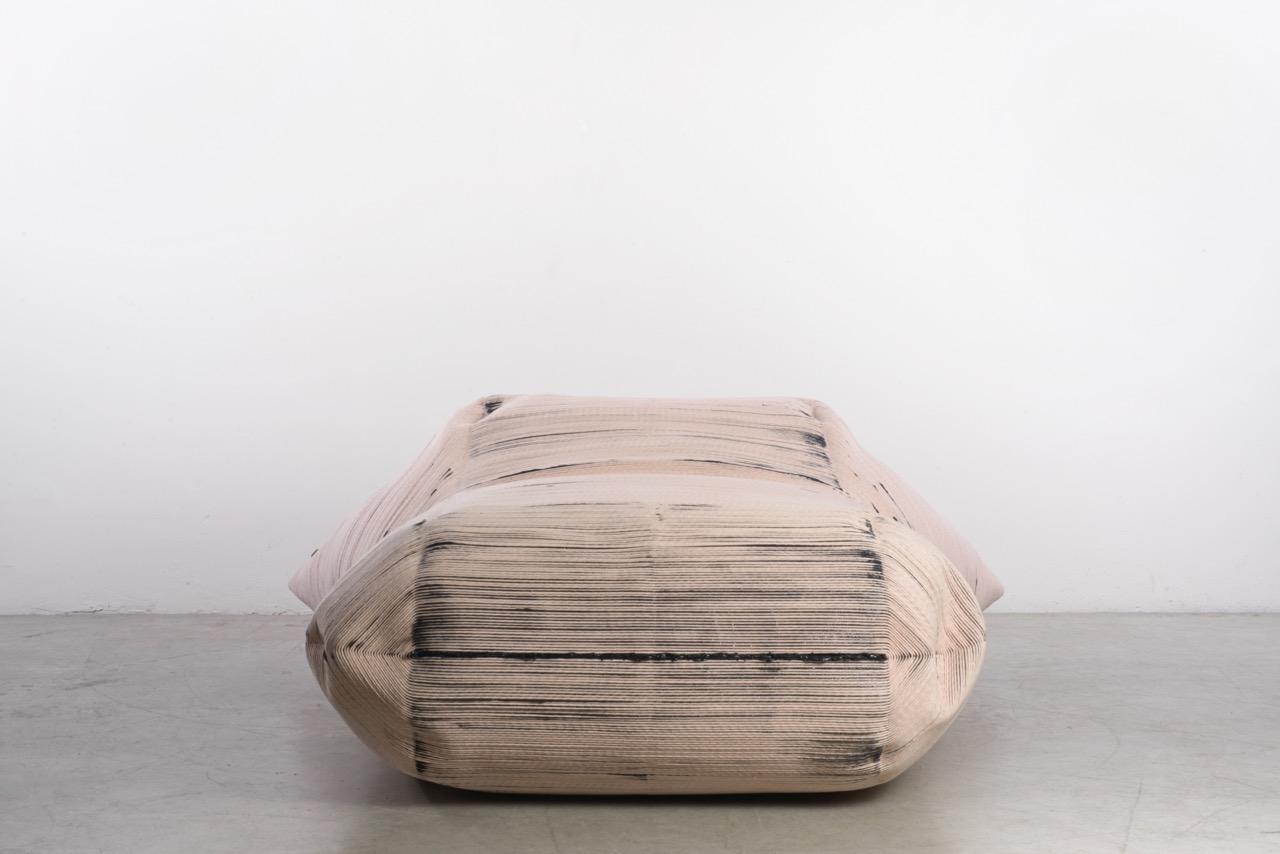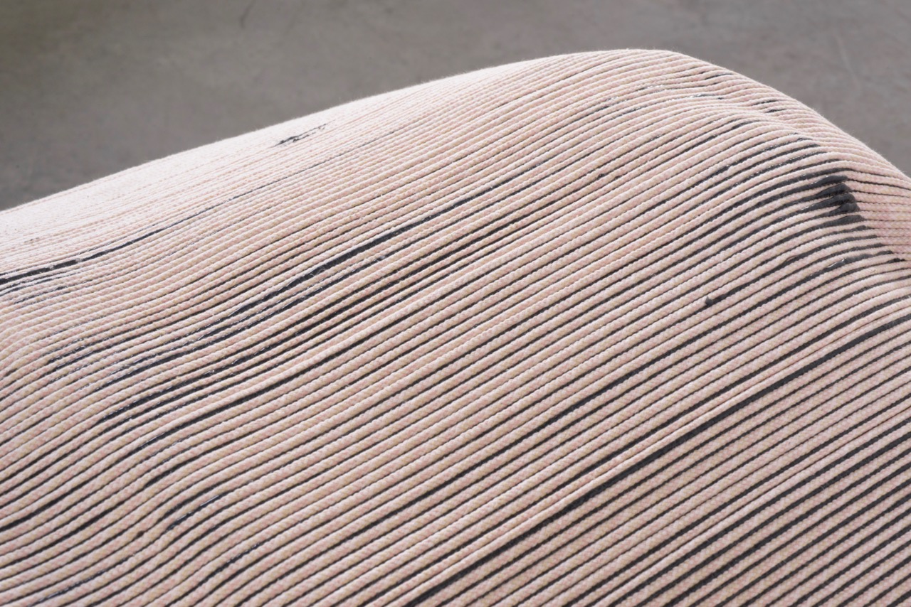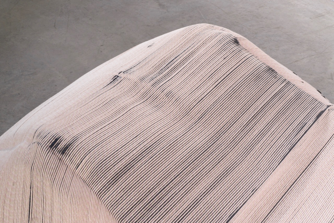 The Big Soft Chair by Wendy Andreu, part of the Regen Camouflage collection, transforms silicone and rope into a waterproof, flexible skin. Crafted around a rotating metal mold, its organic form is filled with polystyrene and feathers, creating a soft, sculptural piece. Each piece of the collection is unique, blending art and functionality.