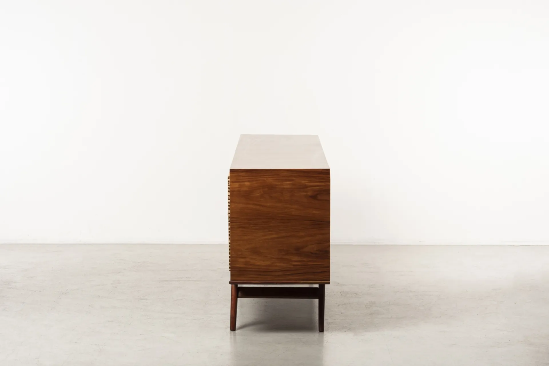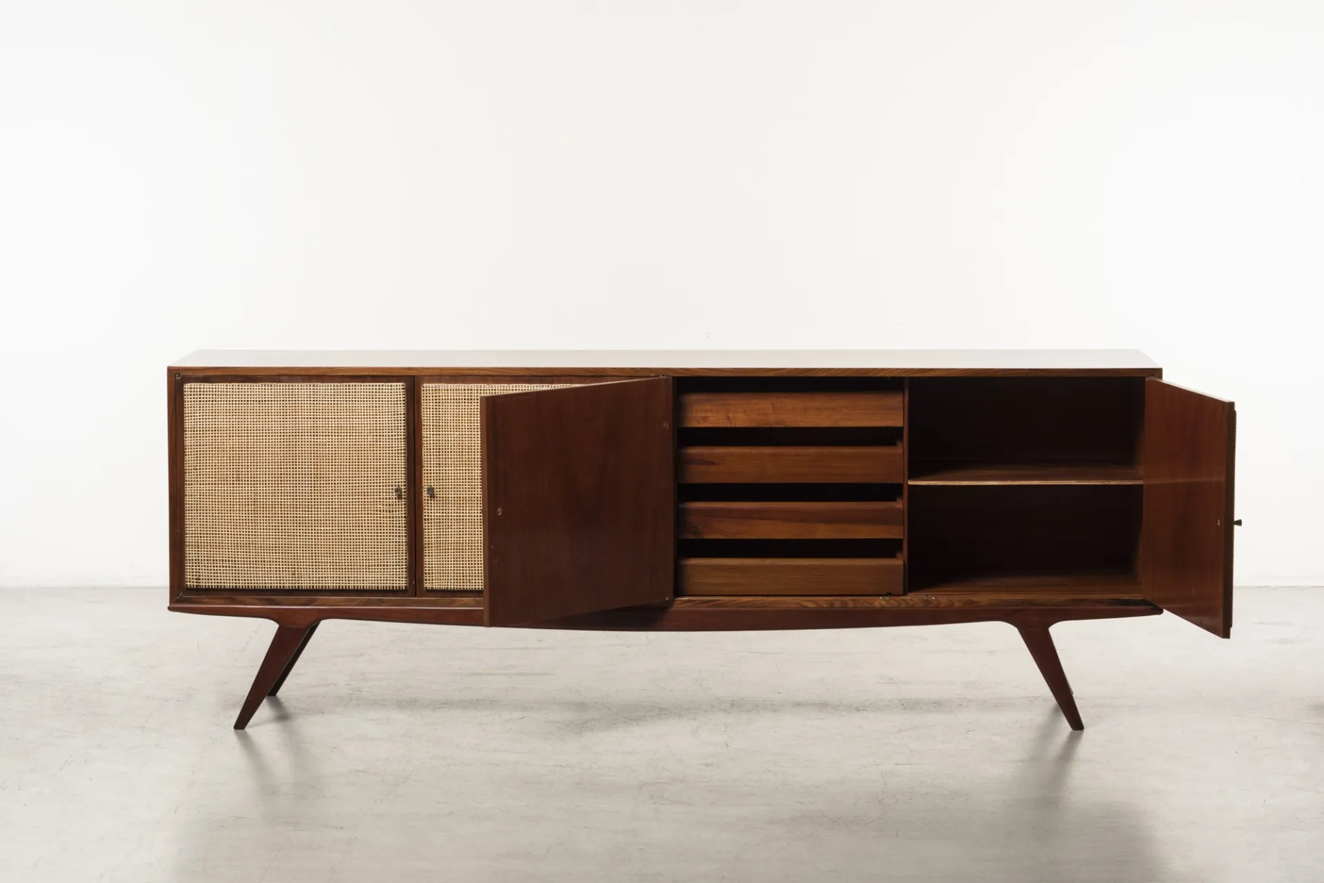 Manufactured in Brazil in 1960, this cabinet exemplifies the pioneering design philosophy of Martin Eisler and Carlo Hauner. With this collaboration, they celebrate the organic beauty of Brazilian tropical woods through refined, modernist forms. Their designs combined traditional craftsmanship with innovative techniques, creating timeless pieces that highlighted the natural elegance of their materials.