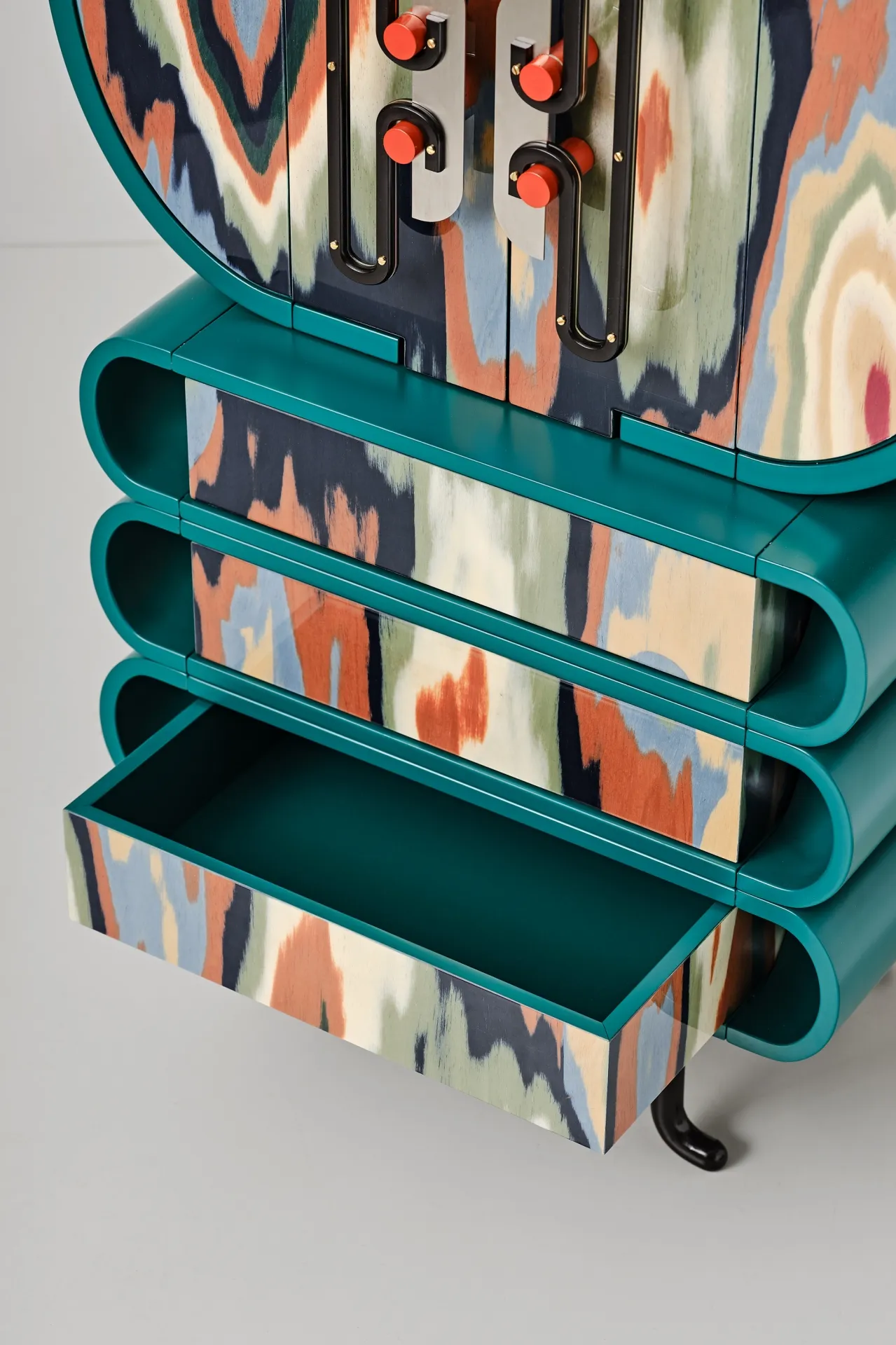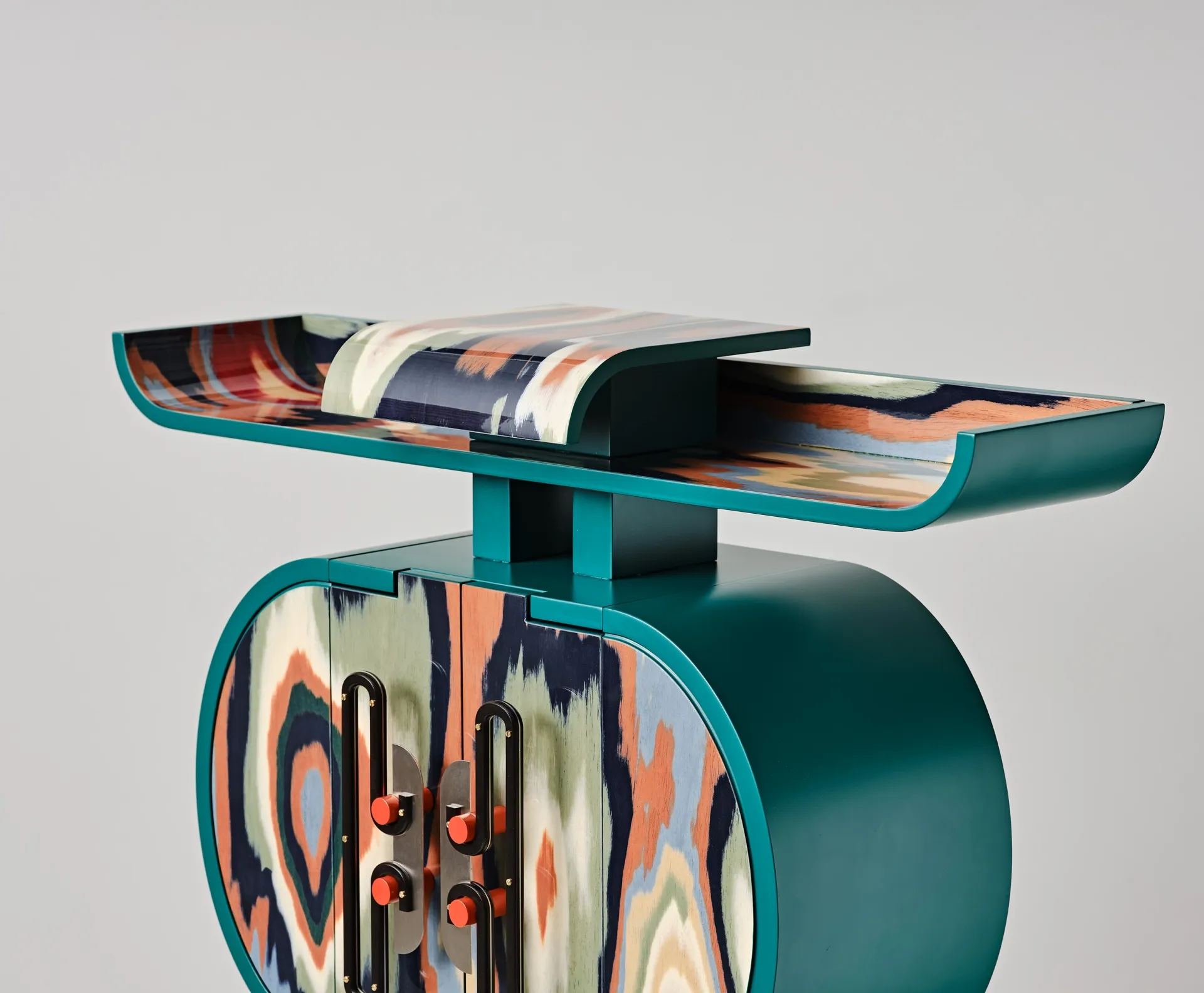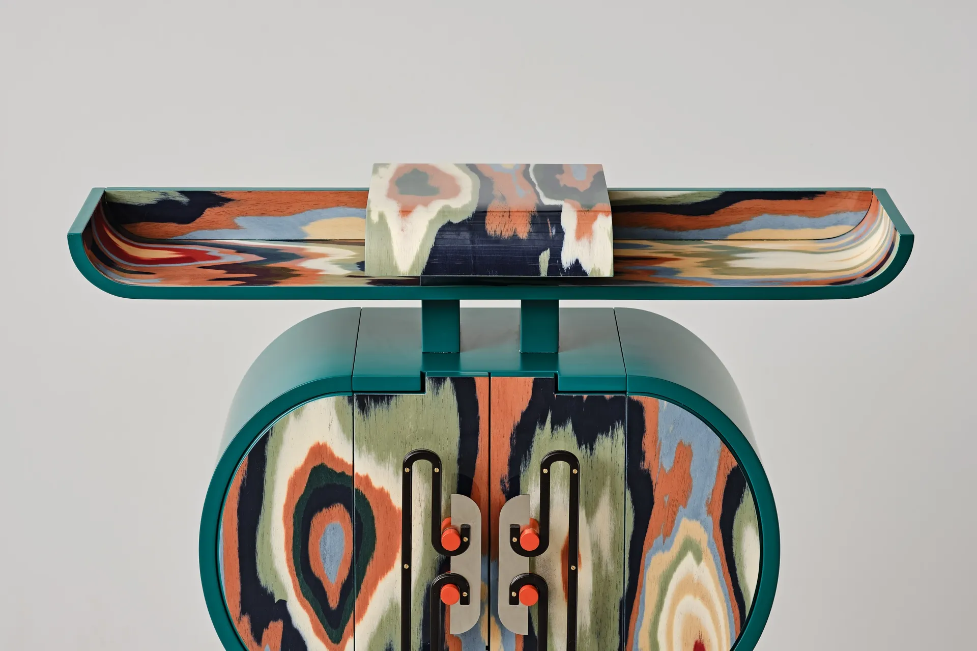 Originally an investigation into handles, whose detailed construction became jewelry for furniture, this project evolved into cabinets and a desk with curvaceous forms in ALPI veneer. Fascinated by Meisen Kimonos and Ikat tapestry, Bethan selected veneers sheets highlighting ripples resembling weaving patterns. Combining natural and manmade elements, the pieces echo East Asian cabinets and insect anatomy. Developed for Bethan’s Ornate solo show at Nilufar Gallery, each piece is unique.