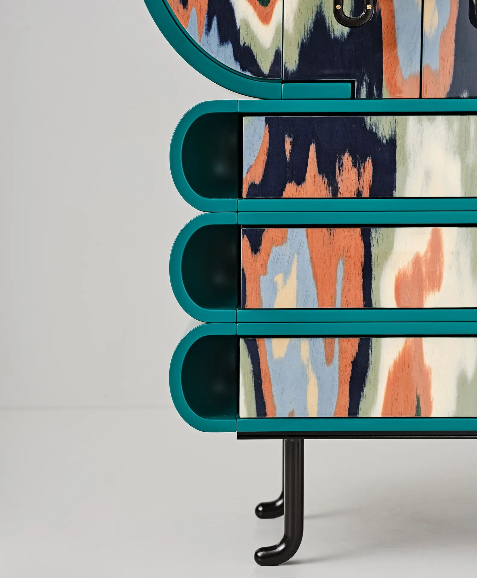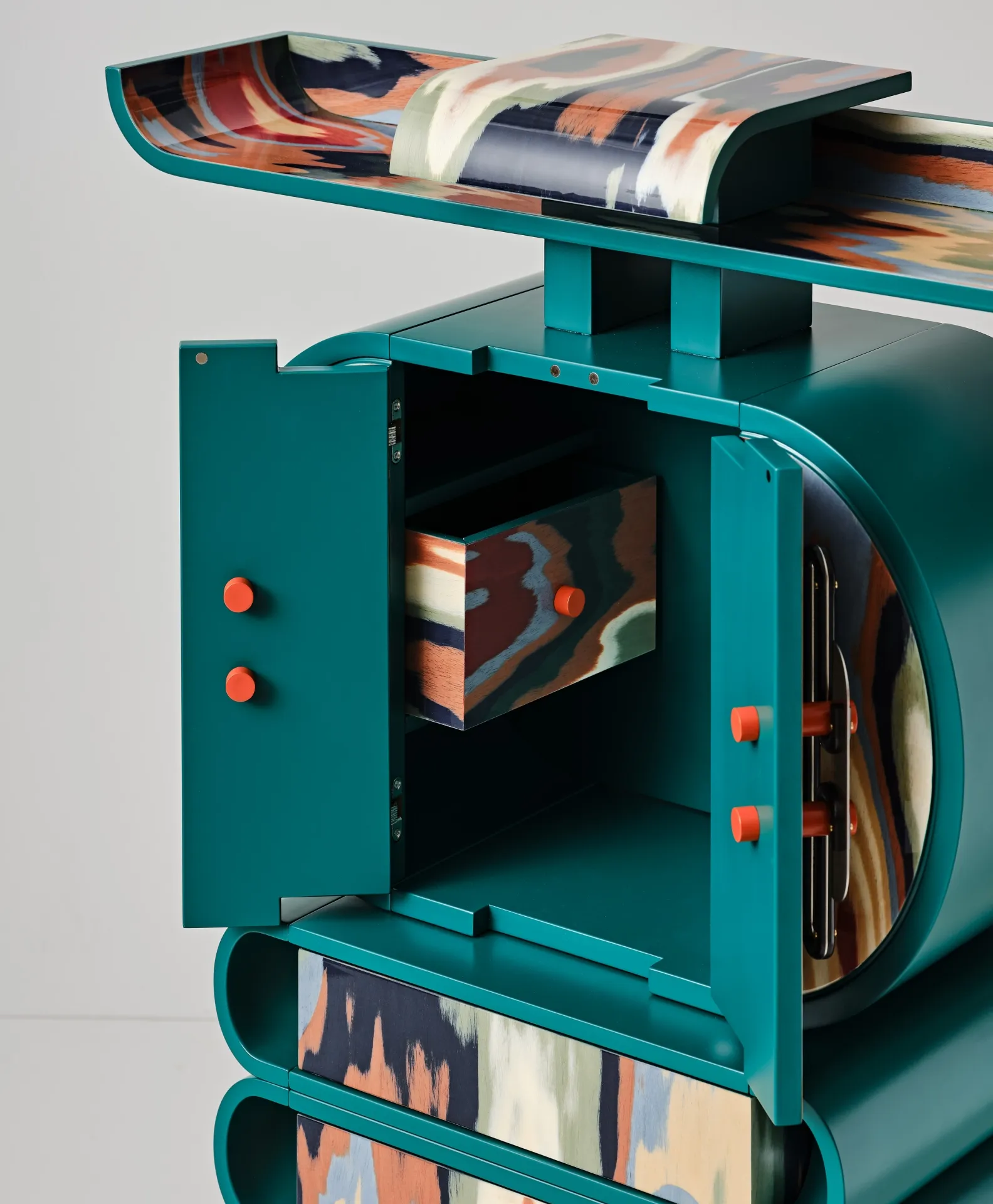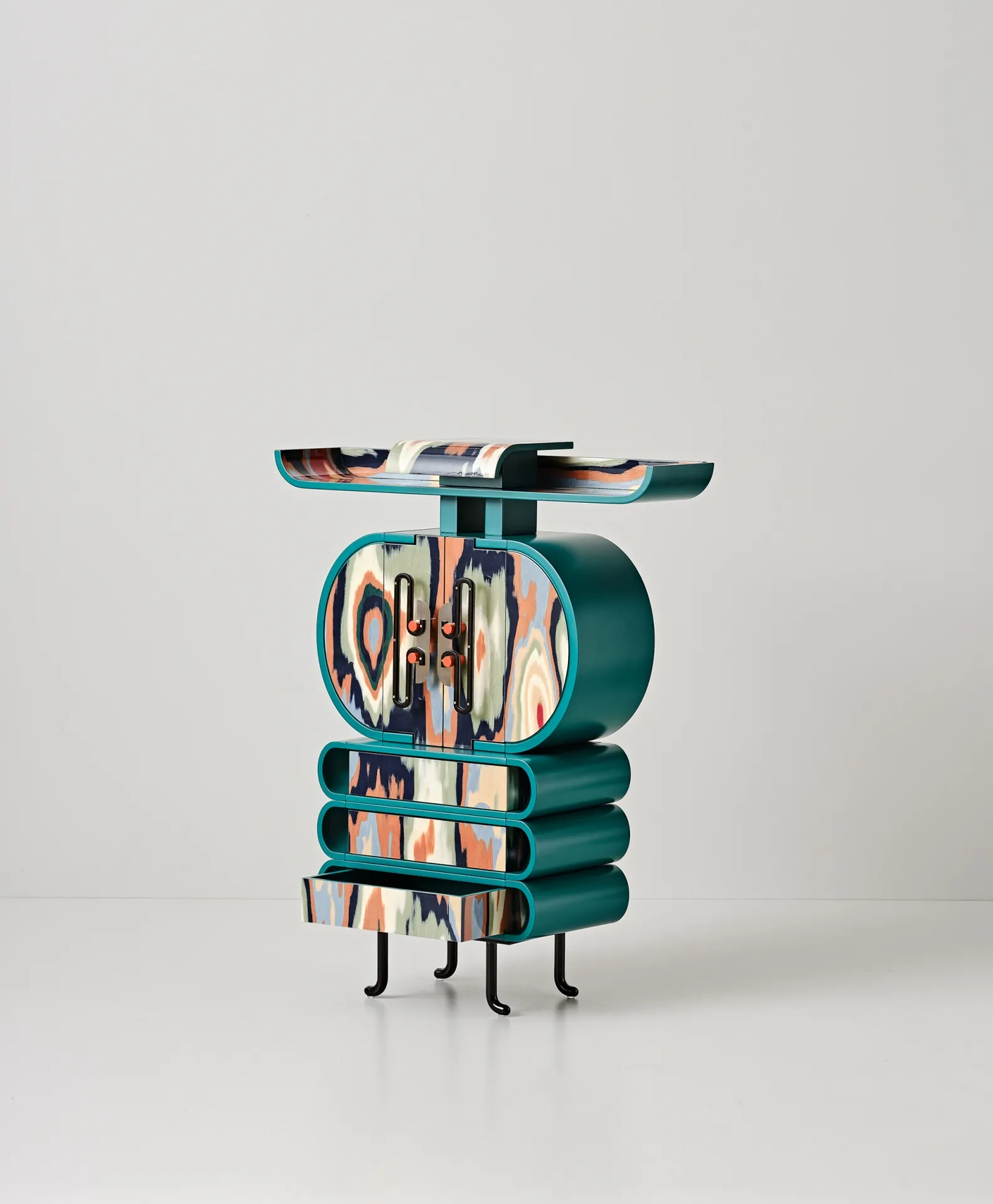 Originally an investigation into handles, whose detailed construction became jewelry for furniture, this project evolved into cabinets and a desk with curvaceous forms in ALPI veneer. Fascinated by Meisen Kimonos and Ikat tapestry, Bethan selected veneers sheets highlighting ripples resembling weaving patterns. Combining natural and manmade elements, the pieces echo East Asian cabinets and insect anatomy. Developed for Bethan’s Ornate solo show at Nilufar Gallery, each piece is unique.
