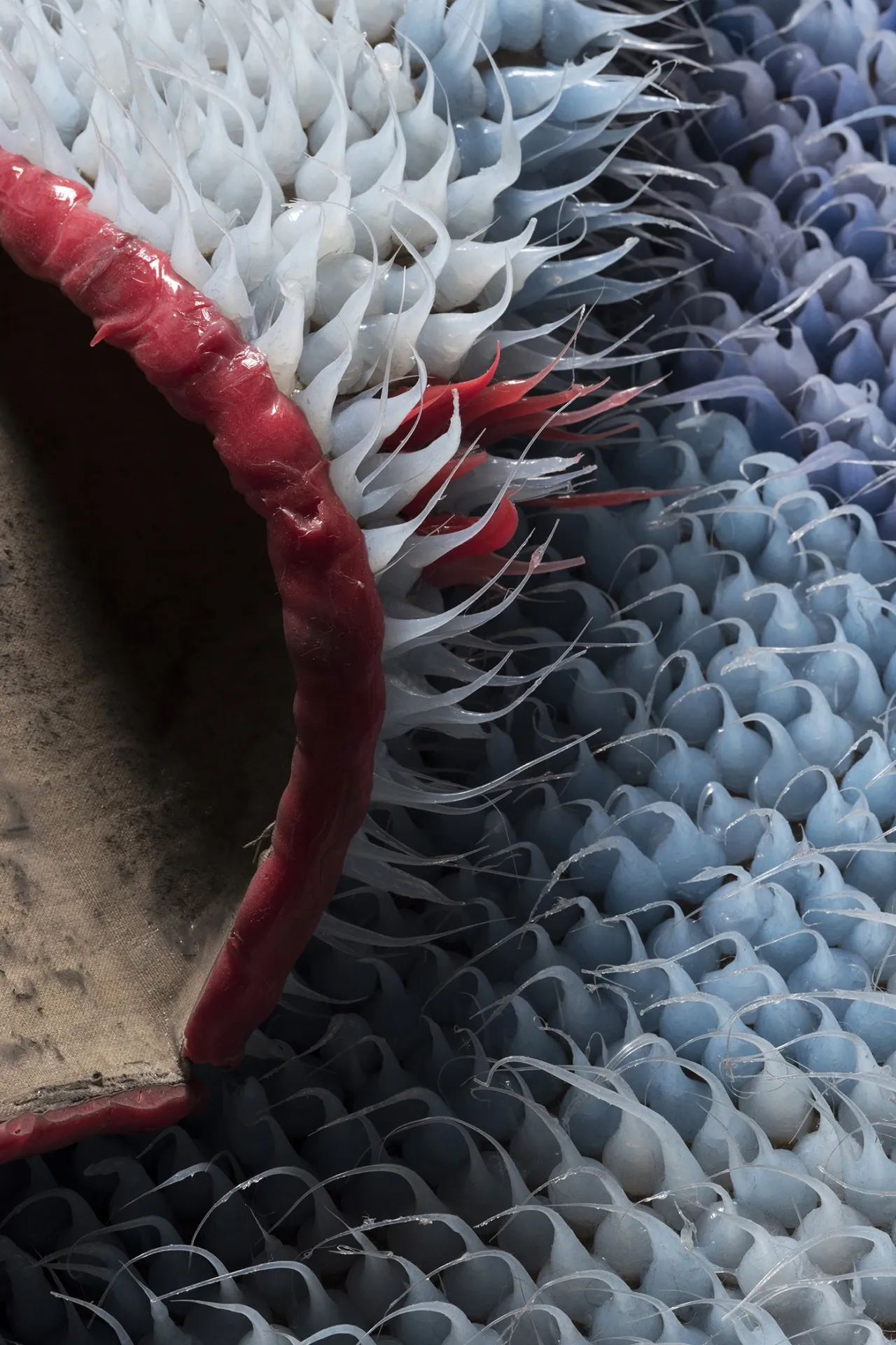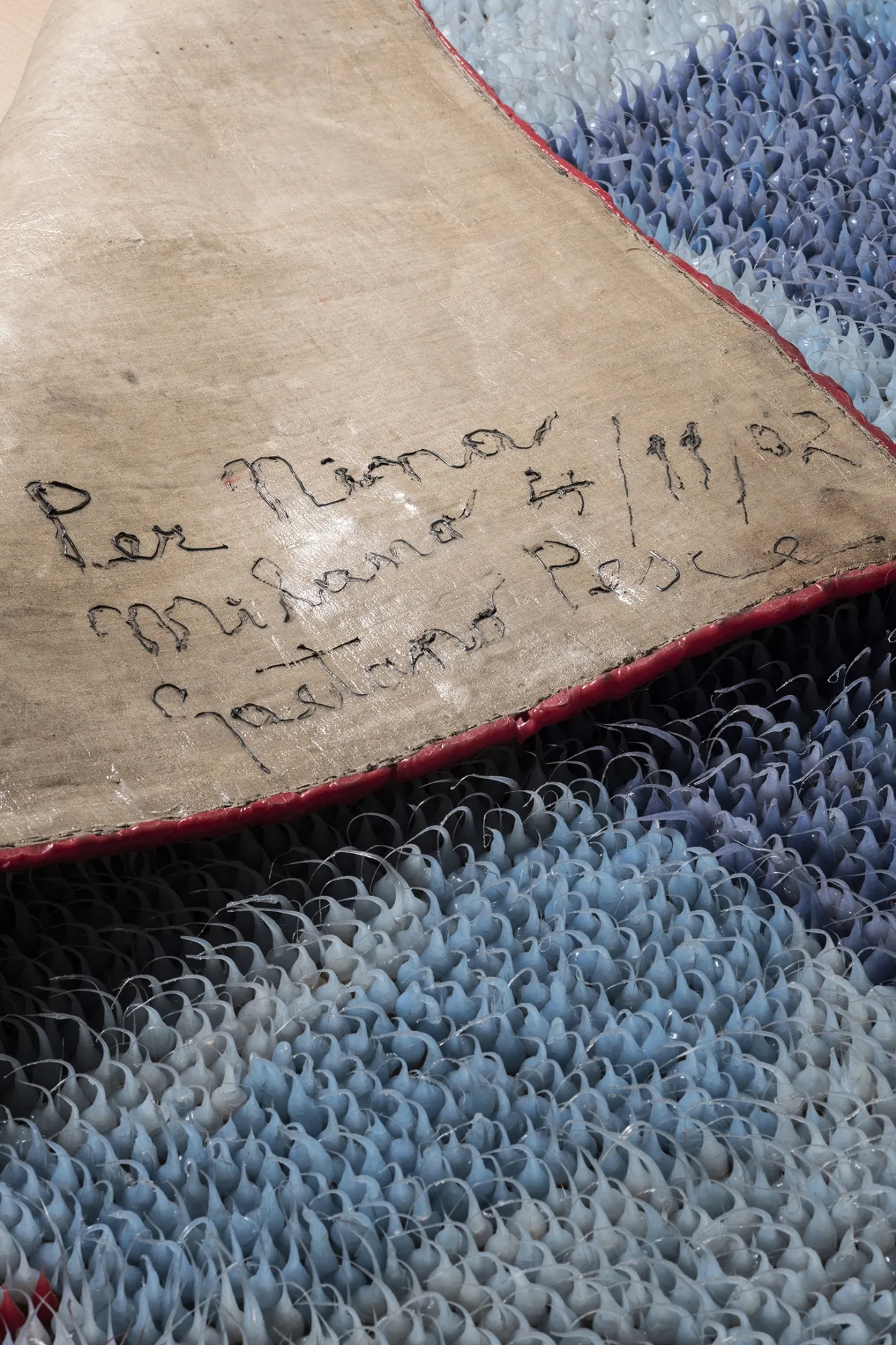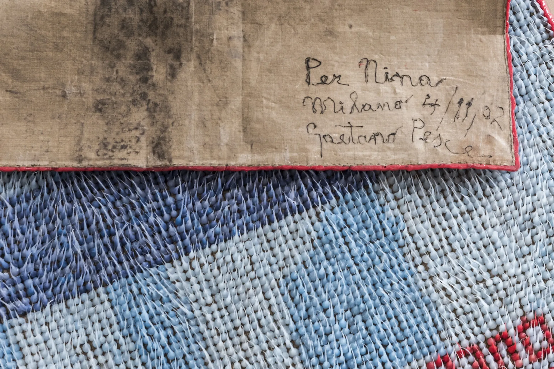 Gaetano Pesce, renowned for his craftsmanship, boundless creativity, and original approach, revolutionized the fusion of art and design. By challenging traditional norms through the use of unconventional materials such as silicone, he viewed objects as living entities, where the artisan’s touch and the materials themselves expressed sensuality and individuality. The What can't be made big...can be made small carpet perfectly embodies this philosophy, blending everyday objects with silicone and a peculiar structure to create a striking and original design.