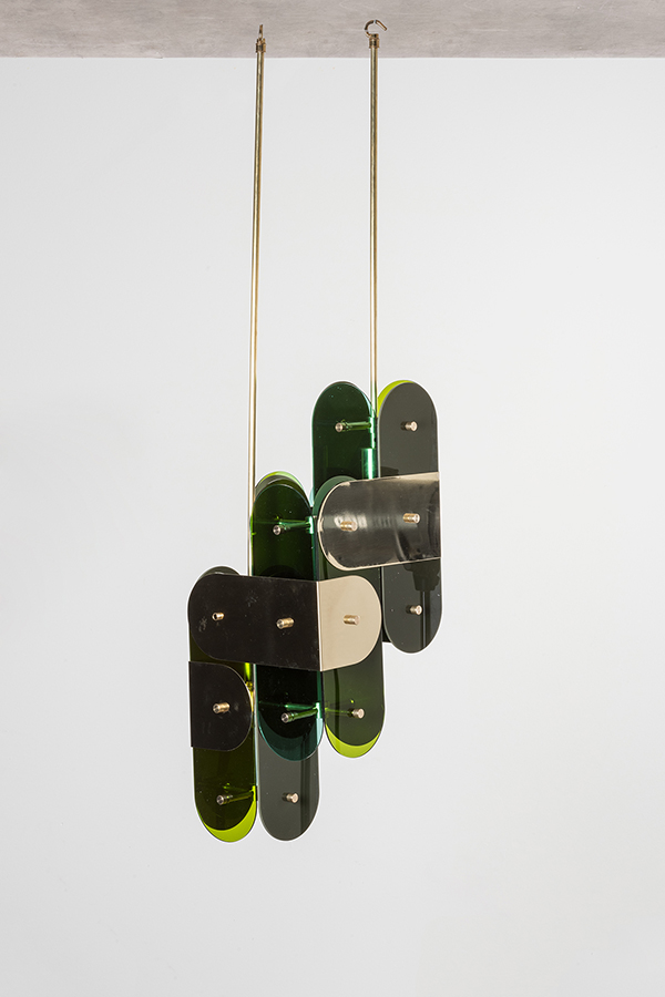 The ASTA series was created for the Chez Nina Club Episode II - a club imagined by India Mahdavi for Nilufar during the MDW in 2019. The ASTA lights are the result of a process driven by color dynamics, translucence and craftsmanship, fusing method and aesthetic in plexiglass and brass. The lights are constructed of a mix of opaque and transparent plexiglass. The light passes through the transparent layers and enhances the colors.The opaque layers shield the lightsource, but still allow the light to pass. This creates a contrast- filled interplay of color, geometry and construction that produces light, reflections and mirror effects.