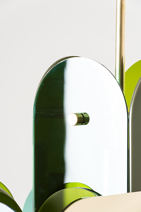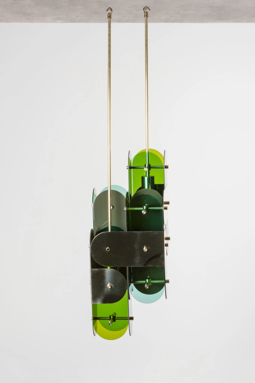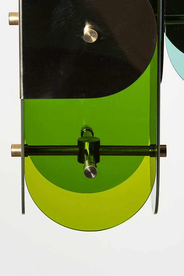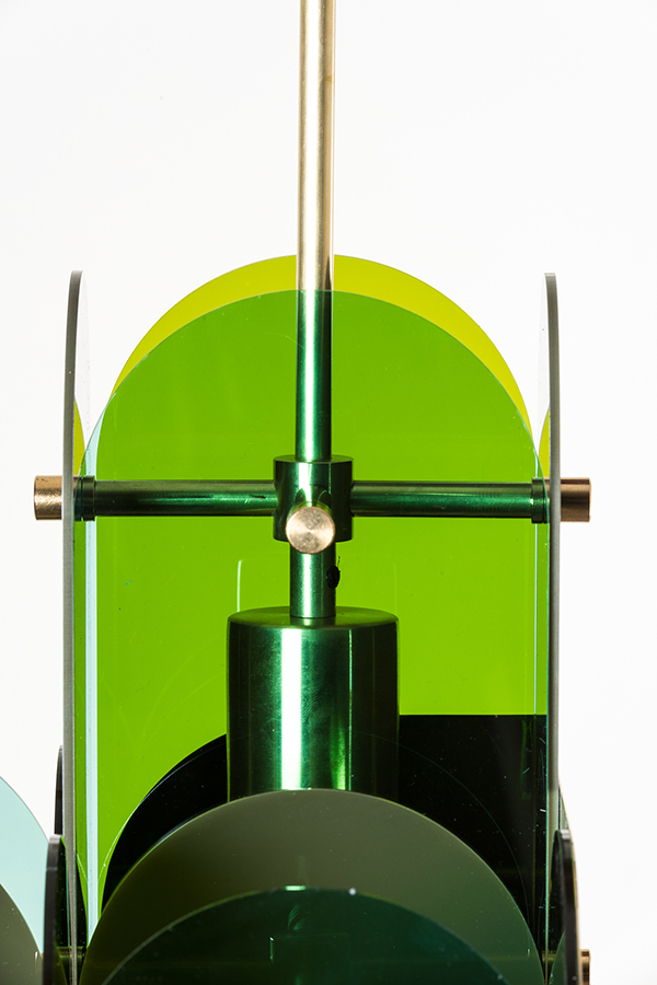 The ASTA series was created for the Chez Nina Club Episode II - a club imagined by India Mahdavi for Nilufar during the MDW in 2019. The ASTA lights are the result of a process driven by color dynamics, translucence and craftsmanship, fusing method and aesthetic in plexiglass and brass. The lights are constructed of a mix of opaque and transparent plexiglass. The light passes through the transparent layers and enhances the colors.The opaque layers shield the lightsource, but still allow the light to pass. This creates a contrast- filled interplay of color, geometry and construction that produces light, reflections and mirror effects.