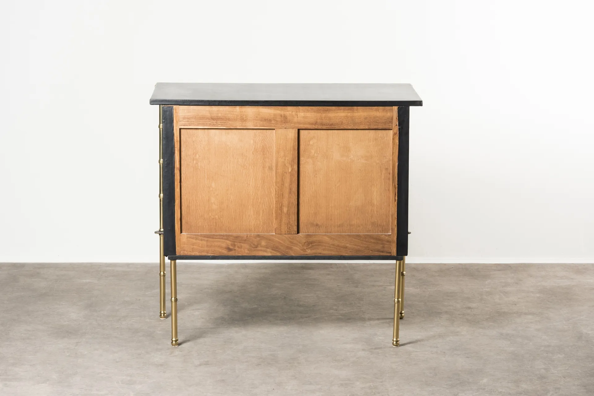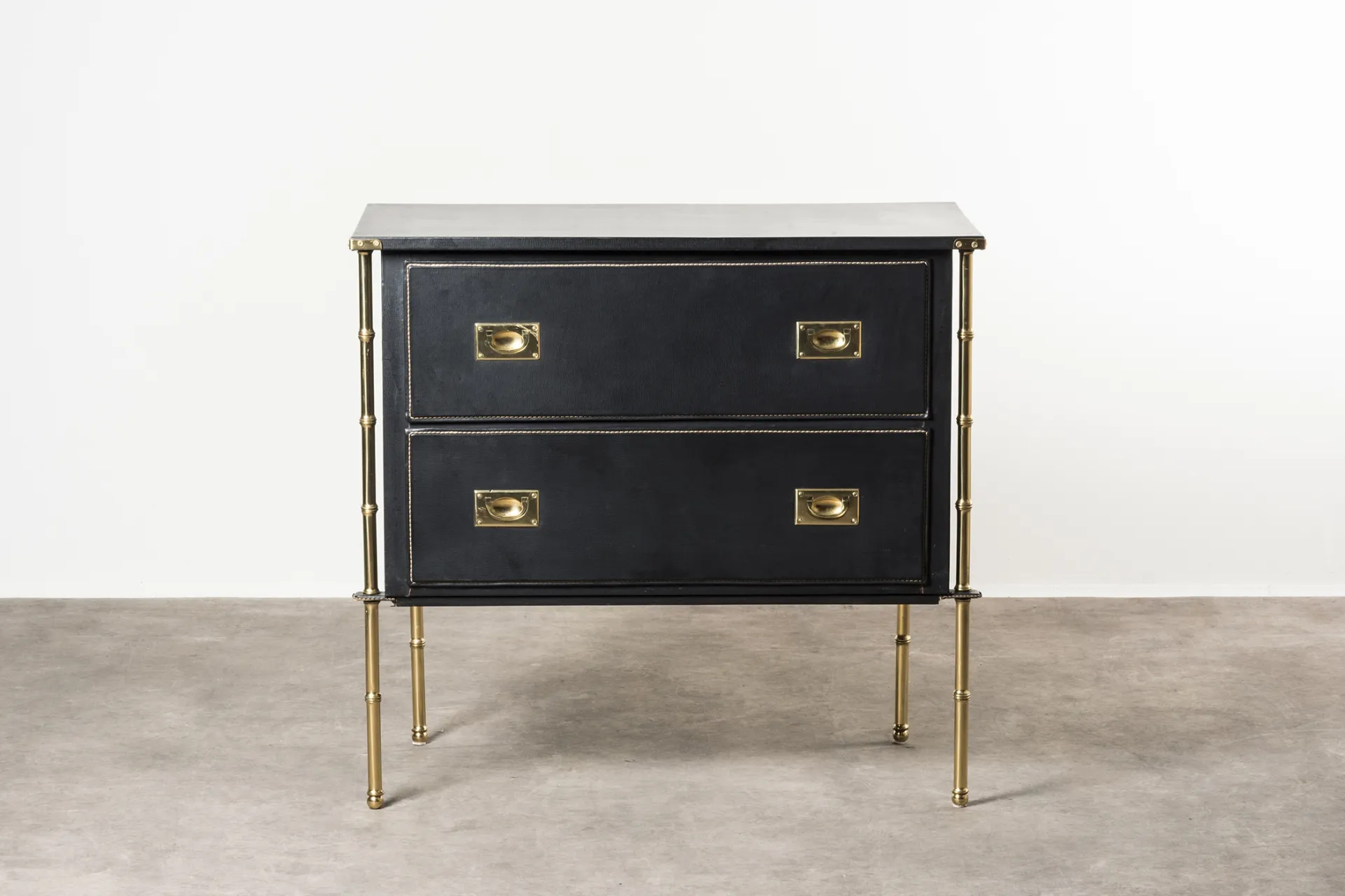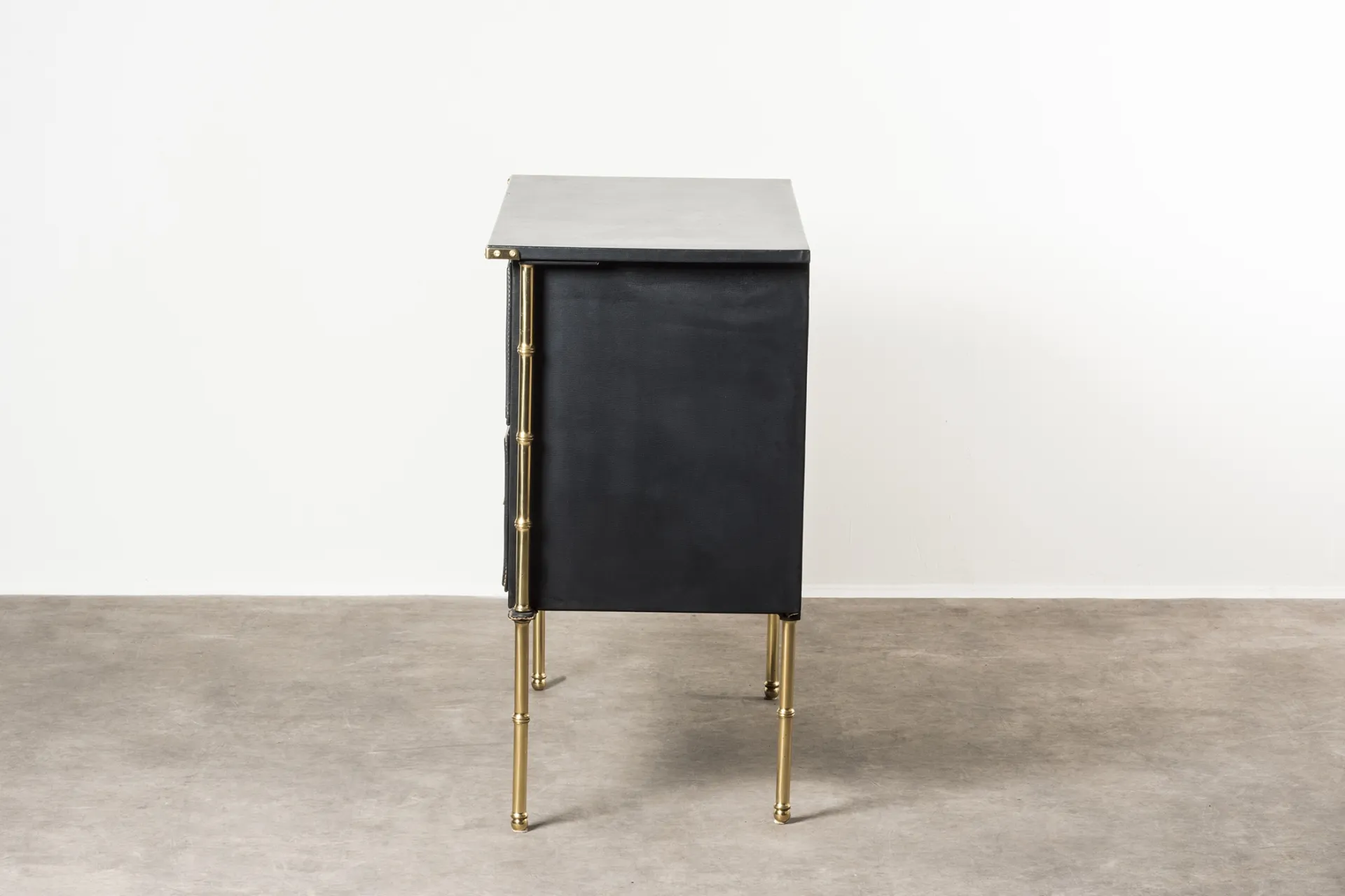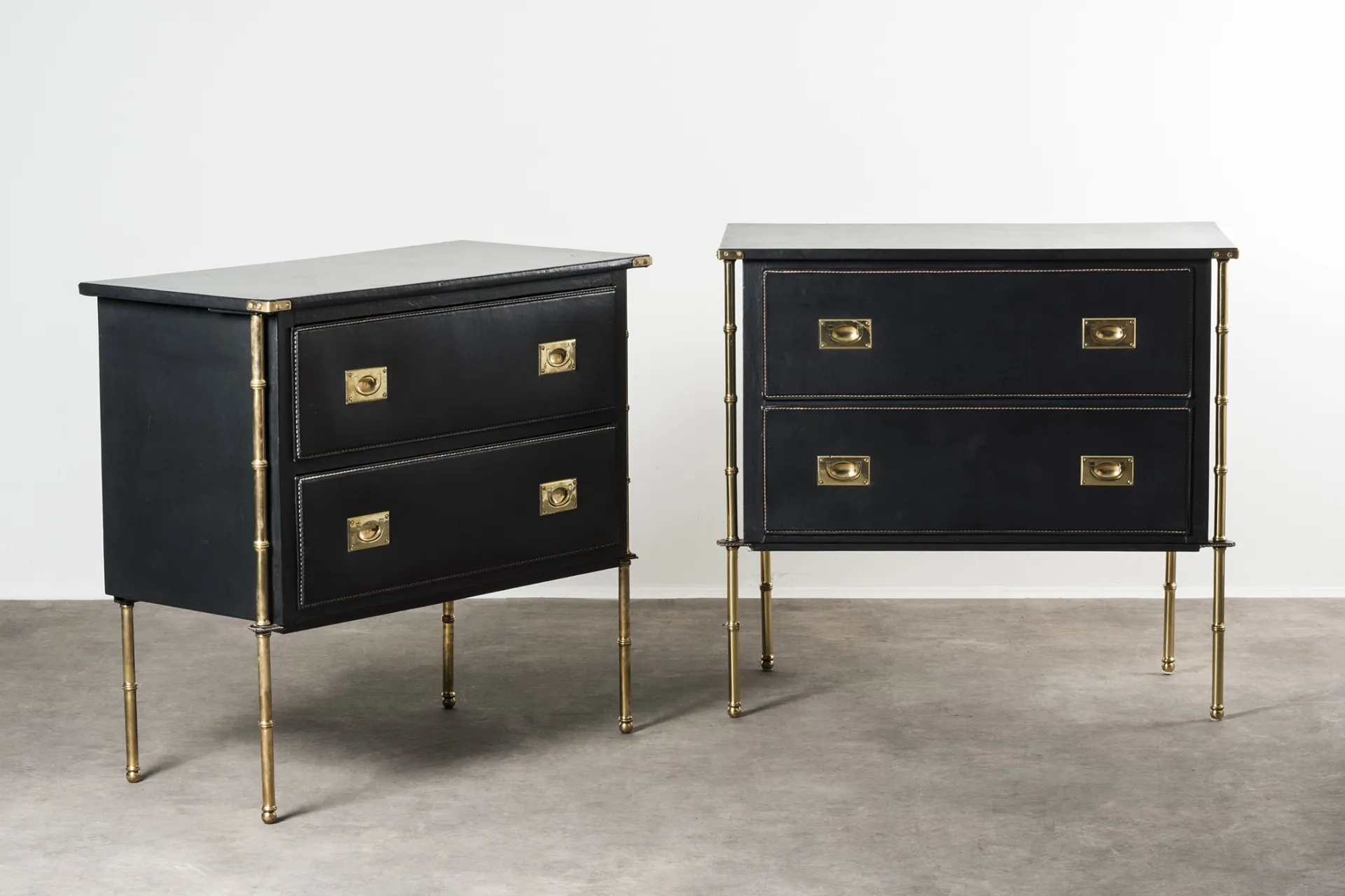 This pair of chest of drawers designed by Jacques Adnet in the 1950s features a wooden structure elegantly covered in skai leather, adding a touch of sophistication. The piece is accentuated with brass details, showcasing Adnet's signature blend of materials.