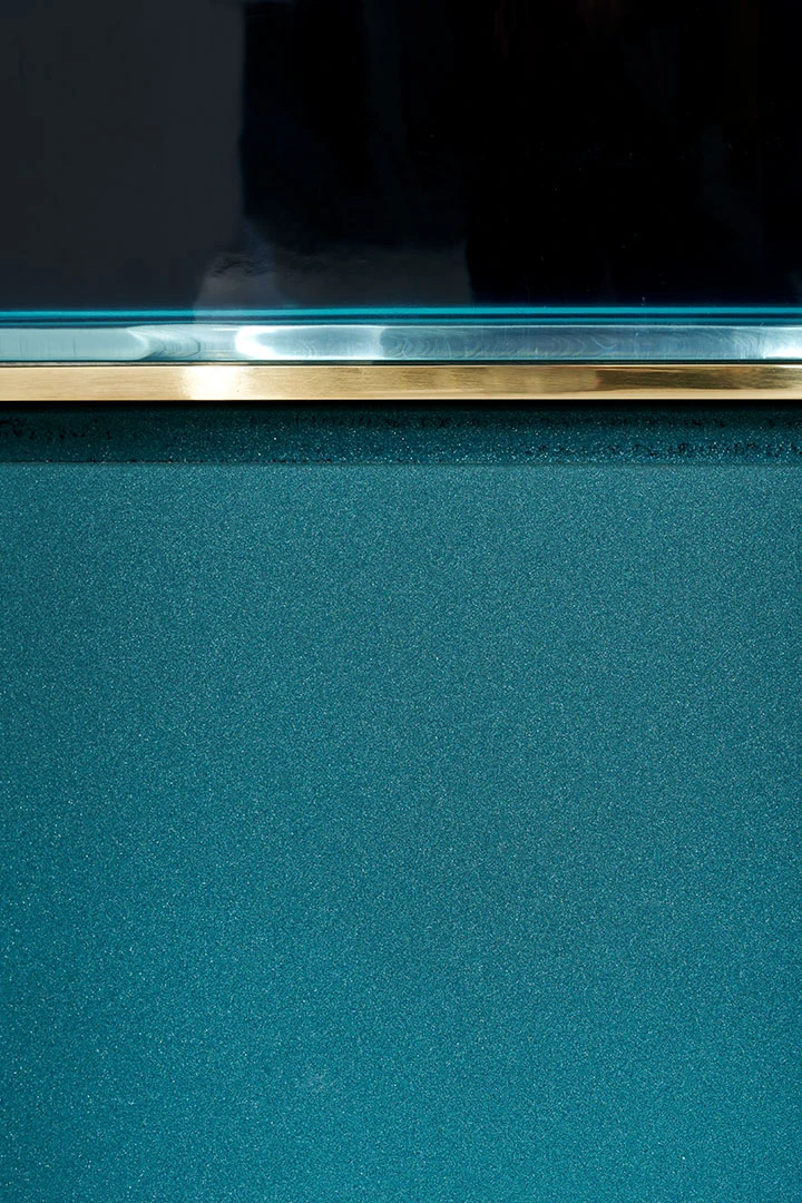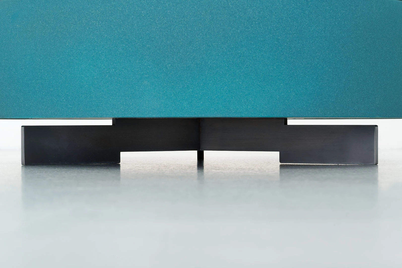 The trio of cylindrical coffee tables in different heights and widths feature sleek, see-through cast resin tops in vivid, monochromatic color schemes. Handmade in the Draga & Aurel atelier in Como, the wooden frame of each table is covered by a shiny metal casing composed of brass and aluminum.