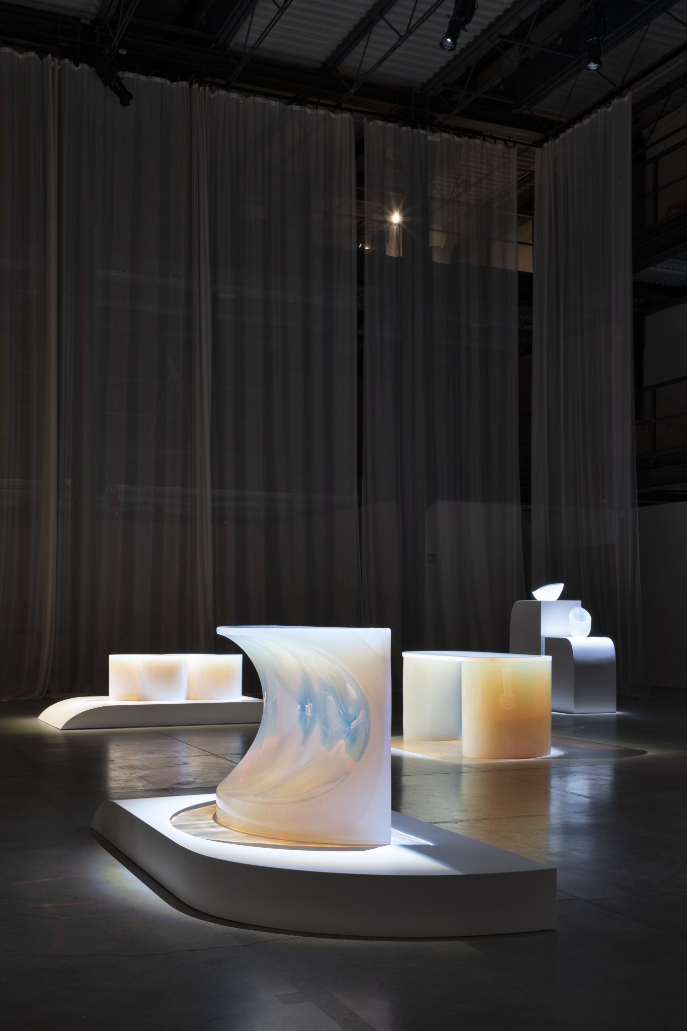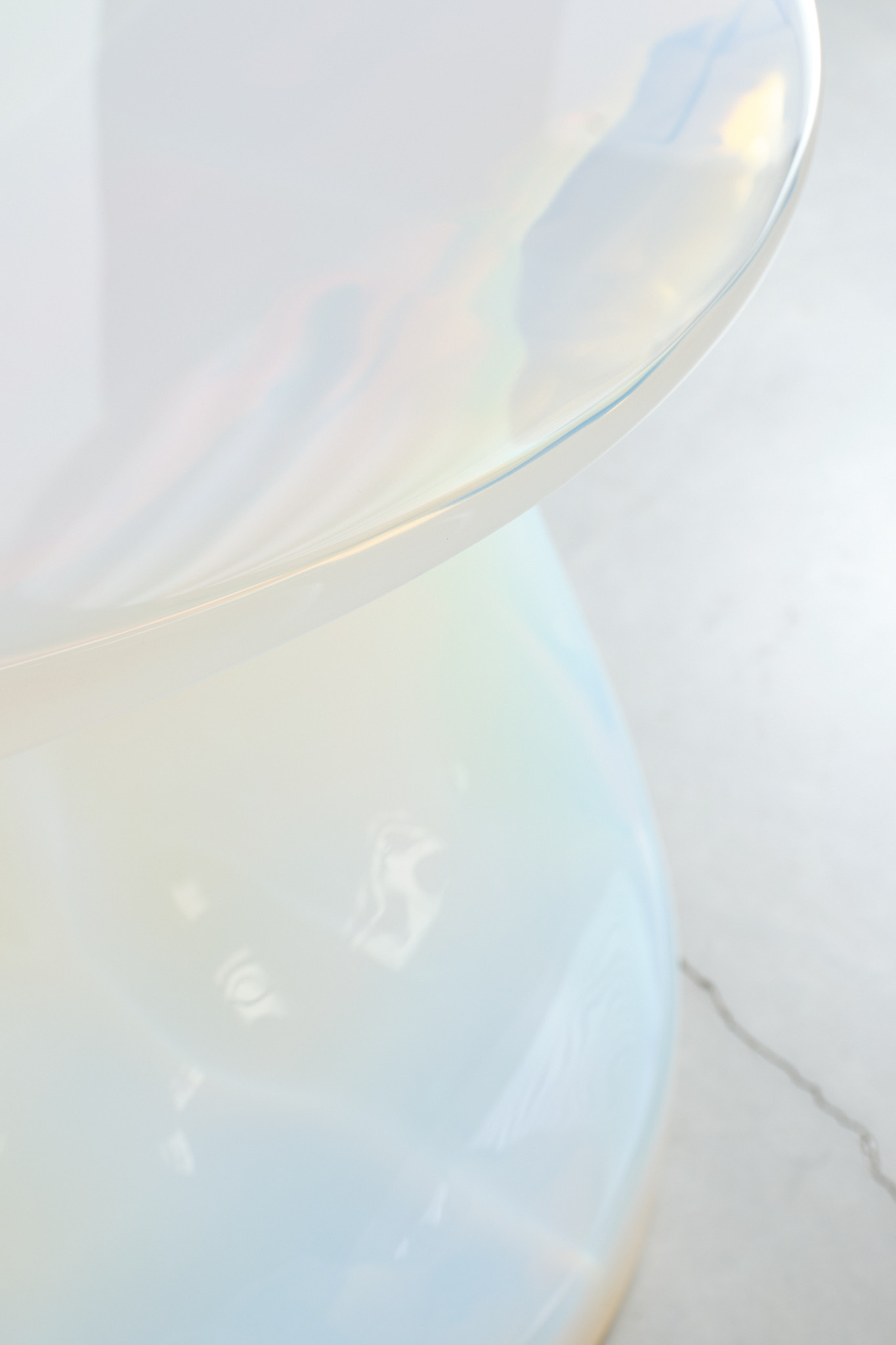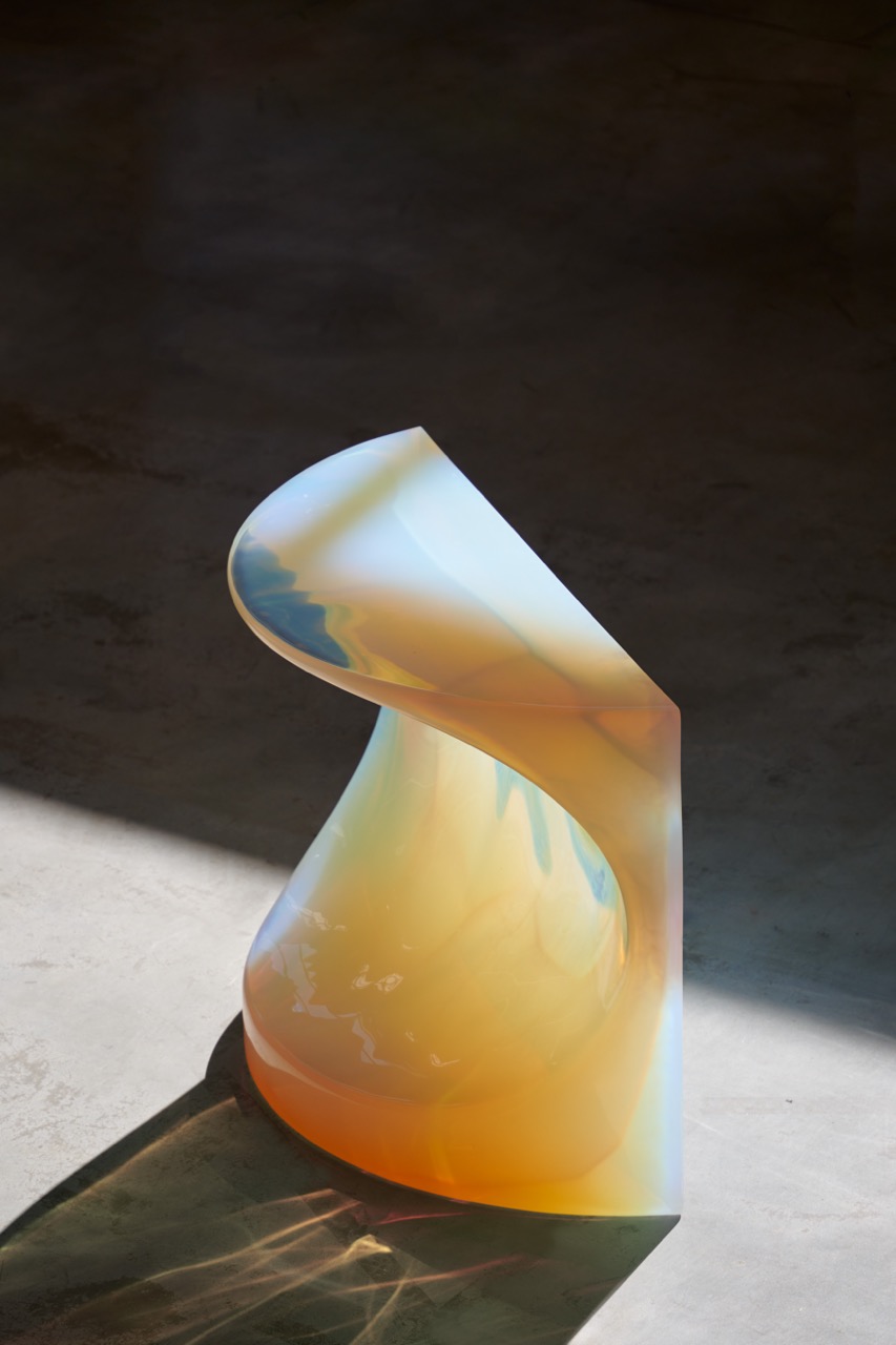 An extension of the Poikilos exhibition, an ongoing journey into deep and gentle tones that reflect the aura of their craftmanship and handmade processes. Objects whose materiality is rarefied by the iridescent hues of cast resin. Poured into molds, the liquid creates unprecedented visual effects that emphasize the plasticity of these sculptural pieces. The shifting colors correspond to the juxtapositions of soft curves and sharp angles.