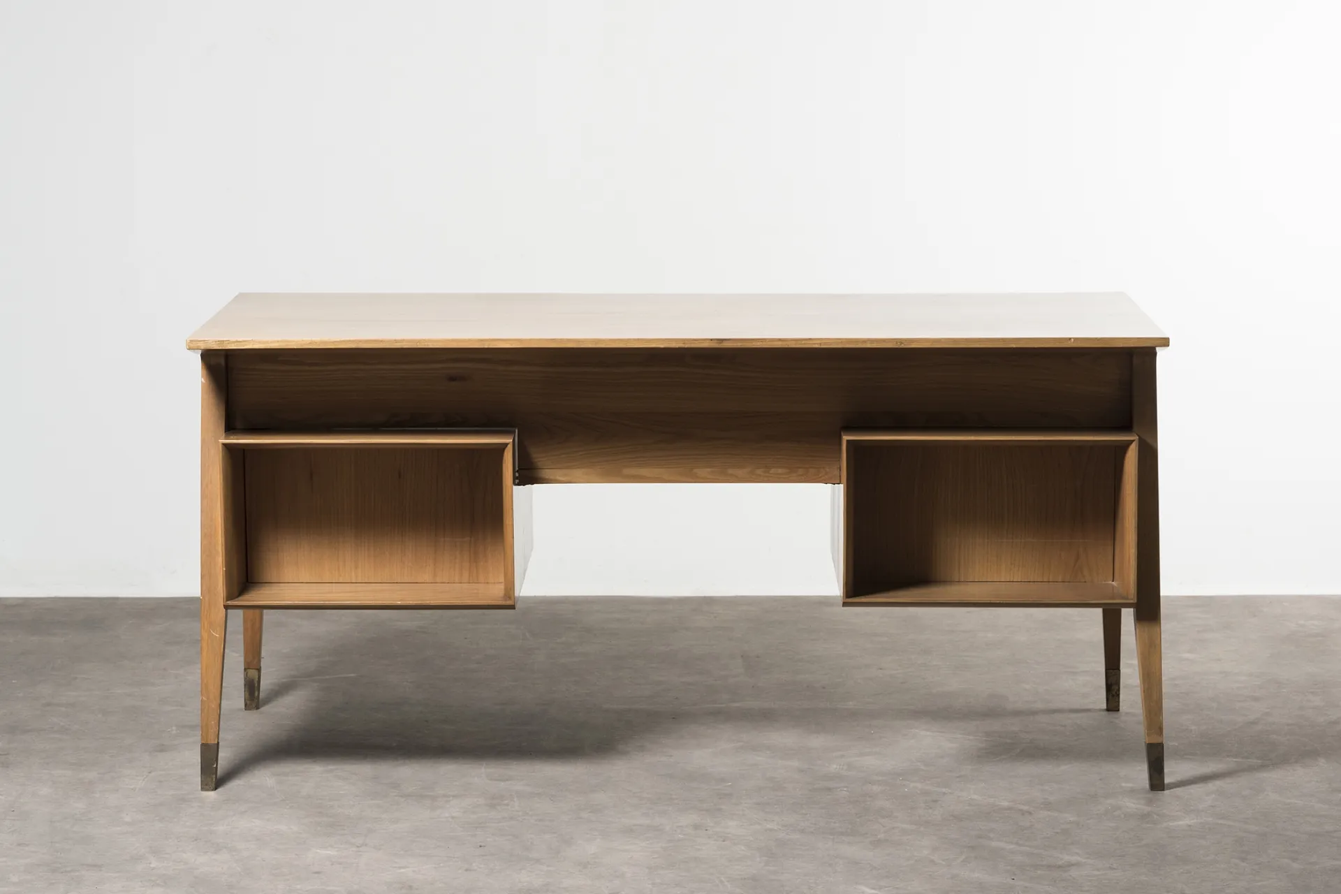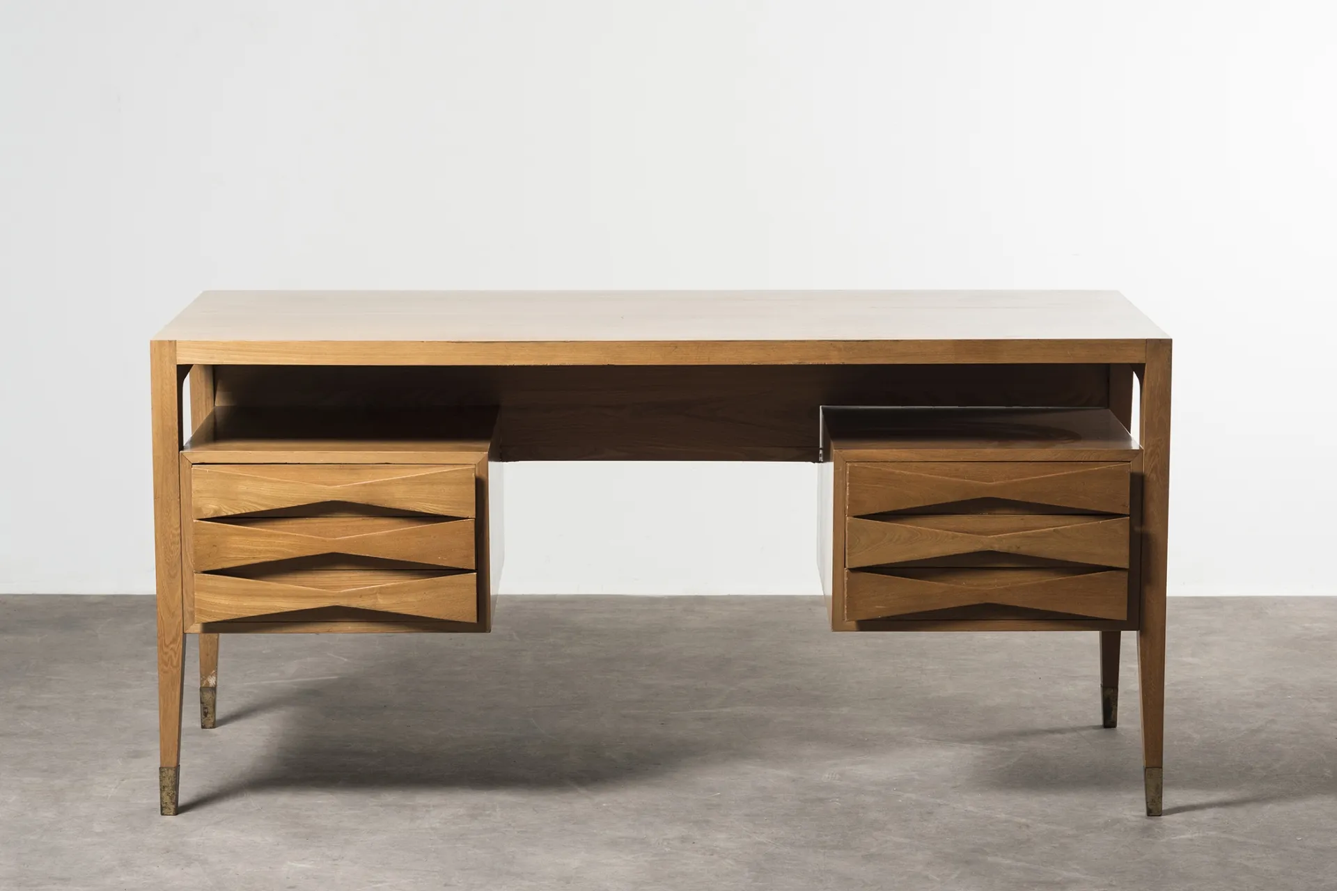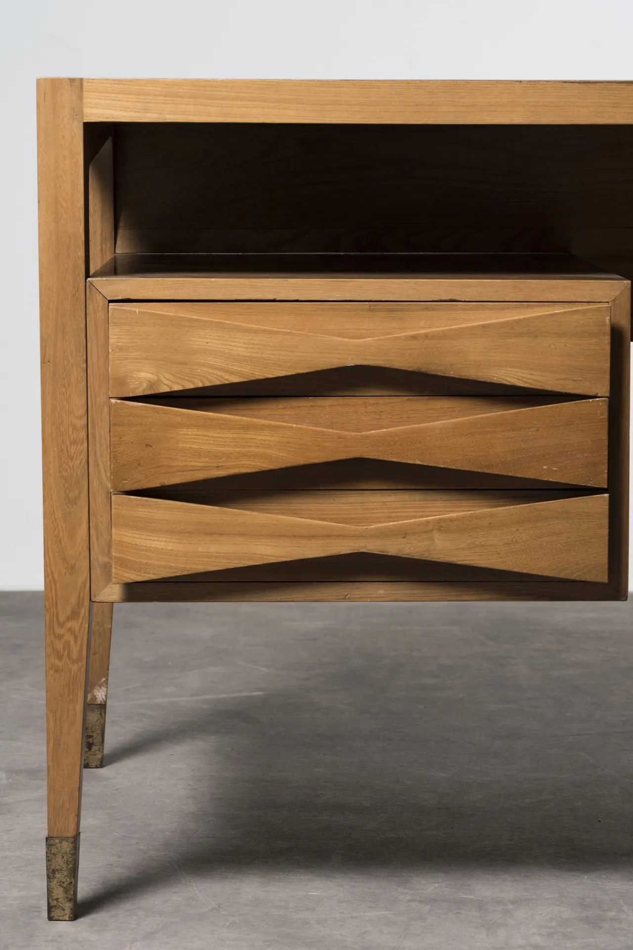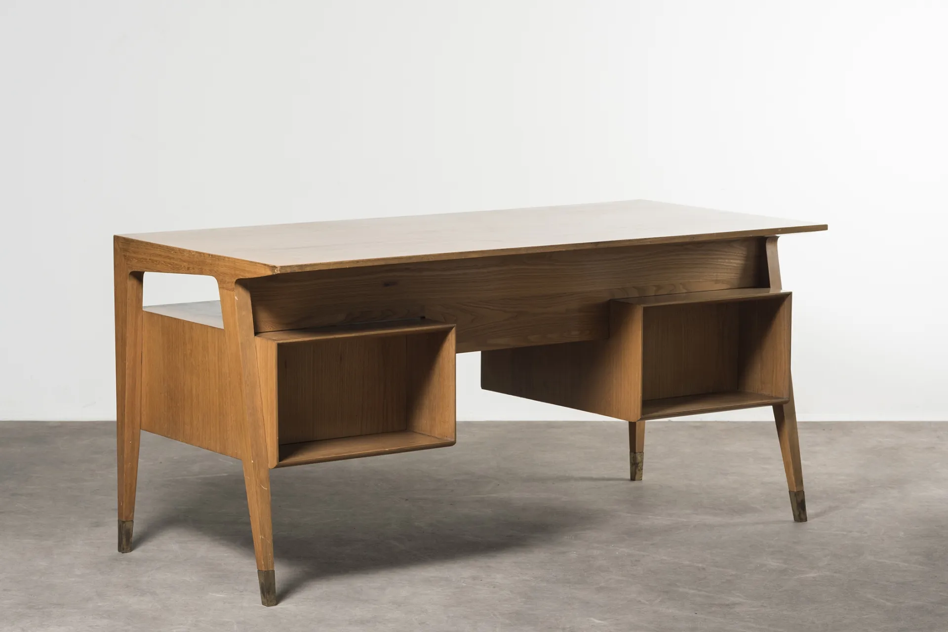 Manufactured by Cesare Cavalleroni between 1950 and 1955, this desk is a prime example of Gio Ponti’s extensive contributions to private interiors. Designed for the law studio of Mr. Luigi Licitra, its showcases distinctive wood motifs and a simple yet captivating form, standing as a timeless icon. Ponti believed that design transcended mere functionality, seeking to harmonize form, creativity, beauty and efficiency.
