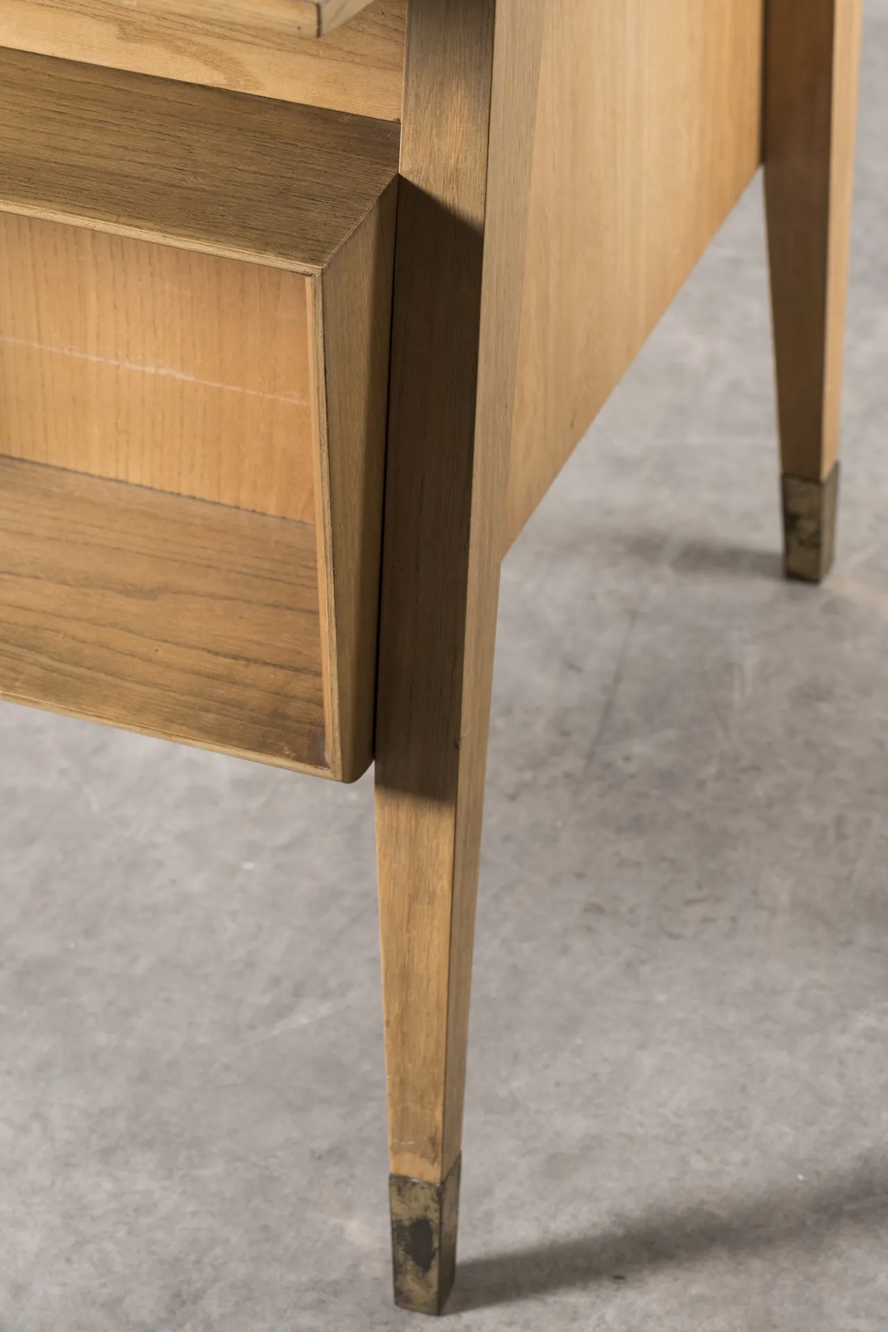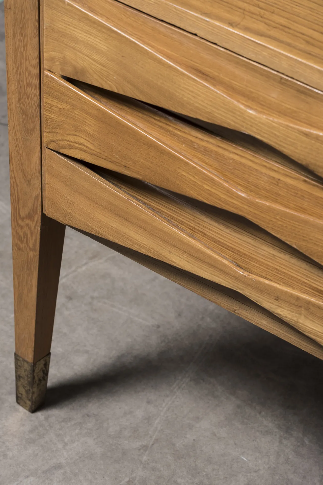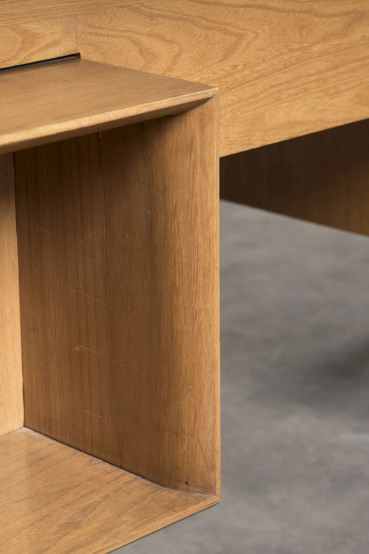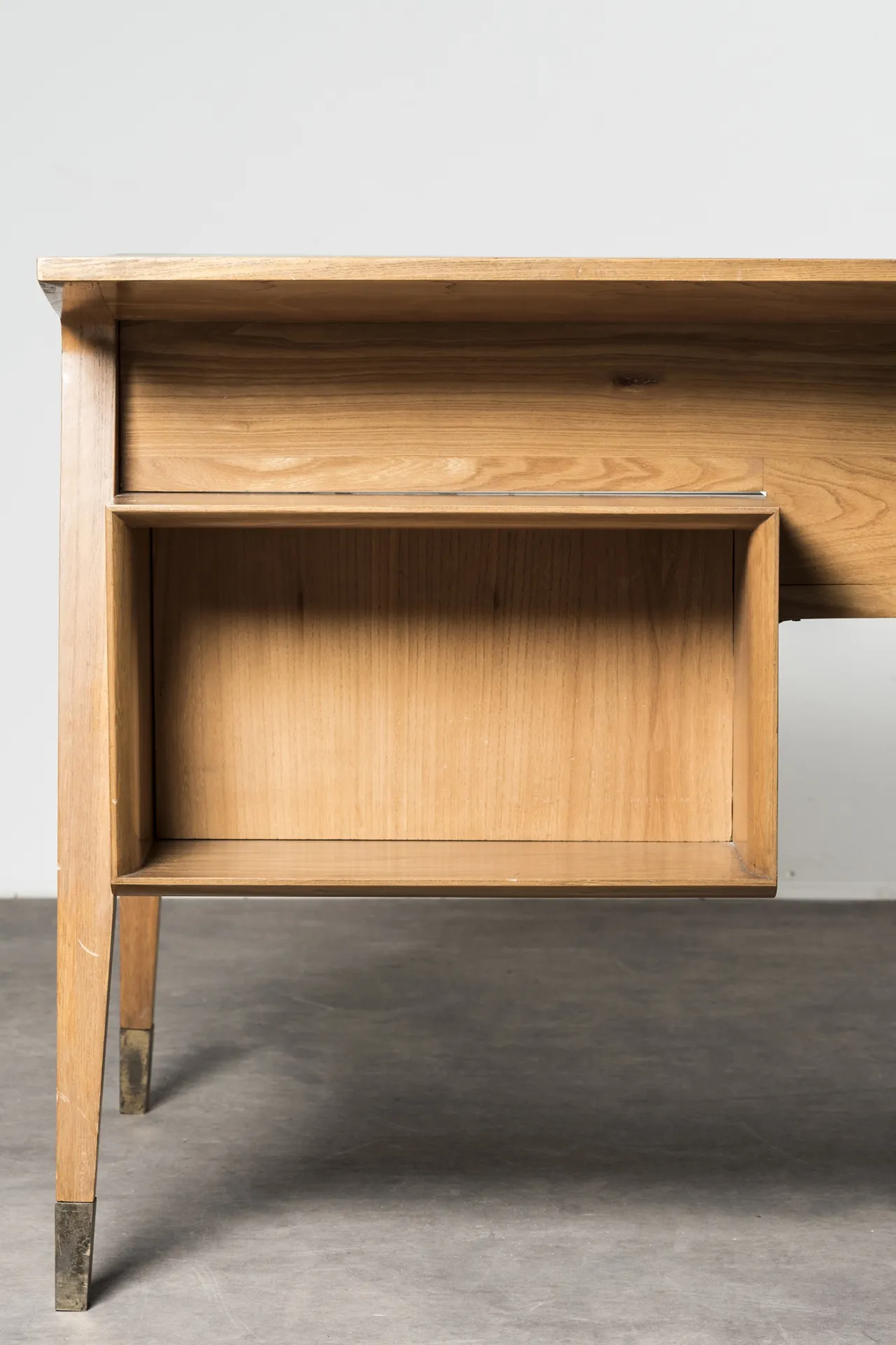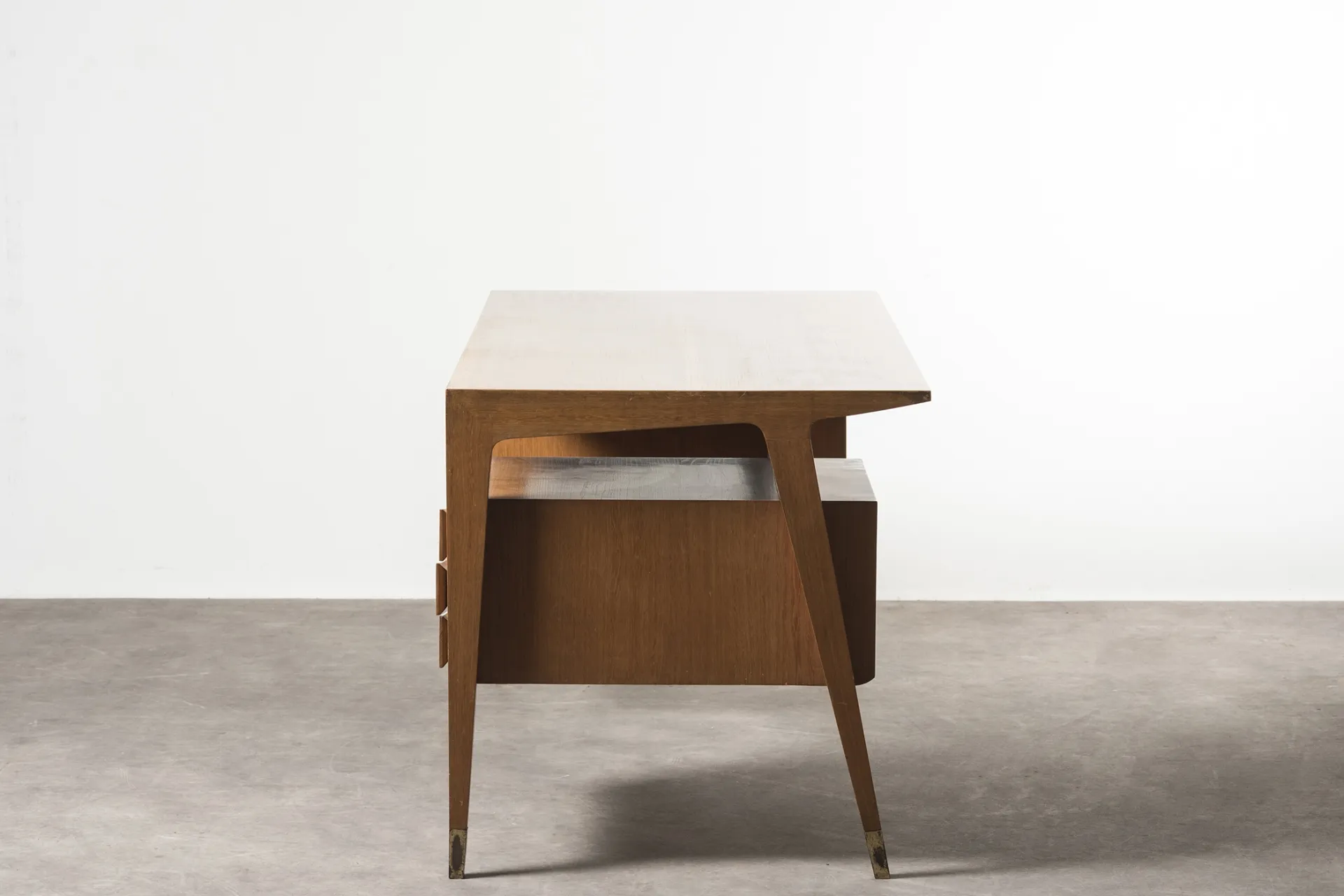 Manufactured by Cesare Cavalleroni between 1950 and 1955, this desk is a prime example of Gio Ponti’s extensive contributions to private interiors. Designed for the law studio of Mr. Luigi Licitra, its showcases distinctive wood motifs and a simple yet captivating form, standing as a timeless icon. Ponti believed that design transcended mere functionality, seeking to harmonize form, creativity, beauty and efficiency.
