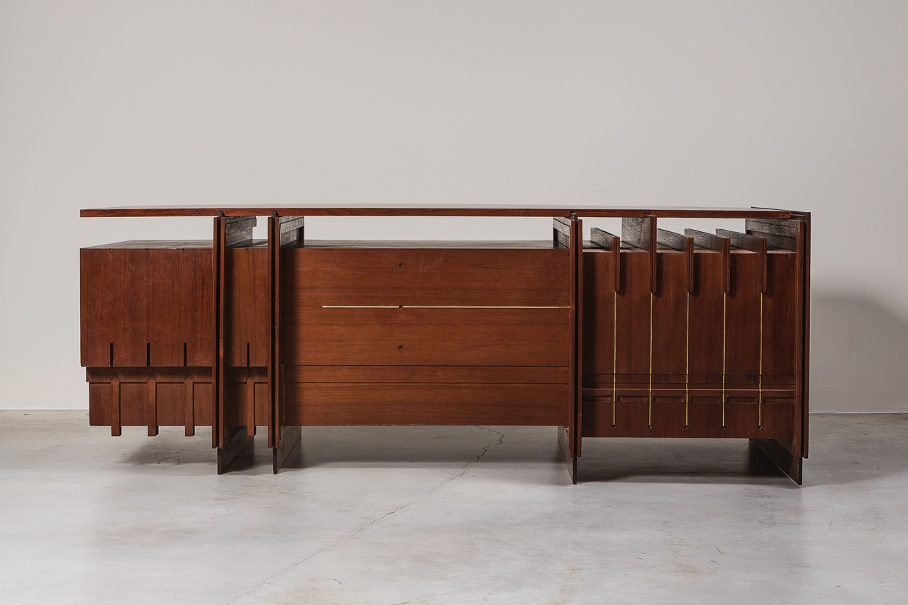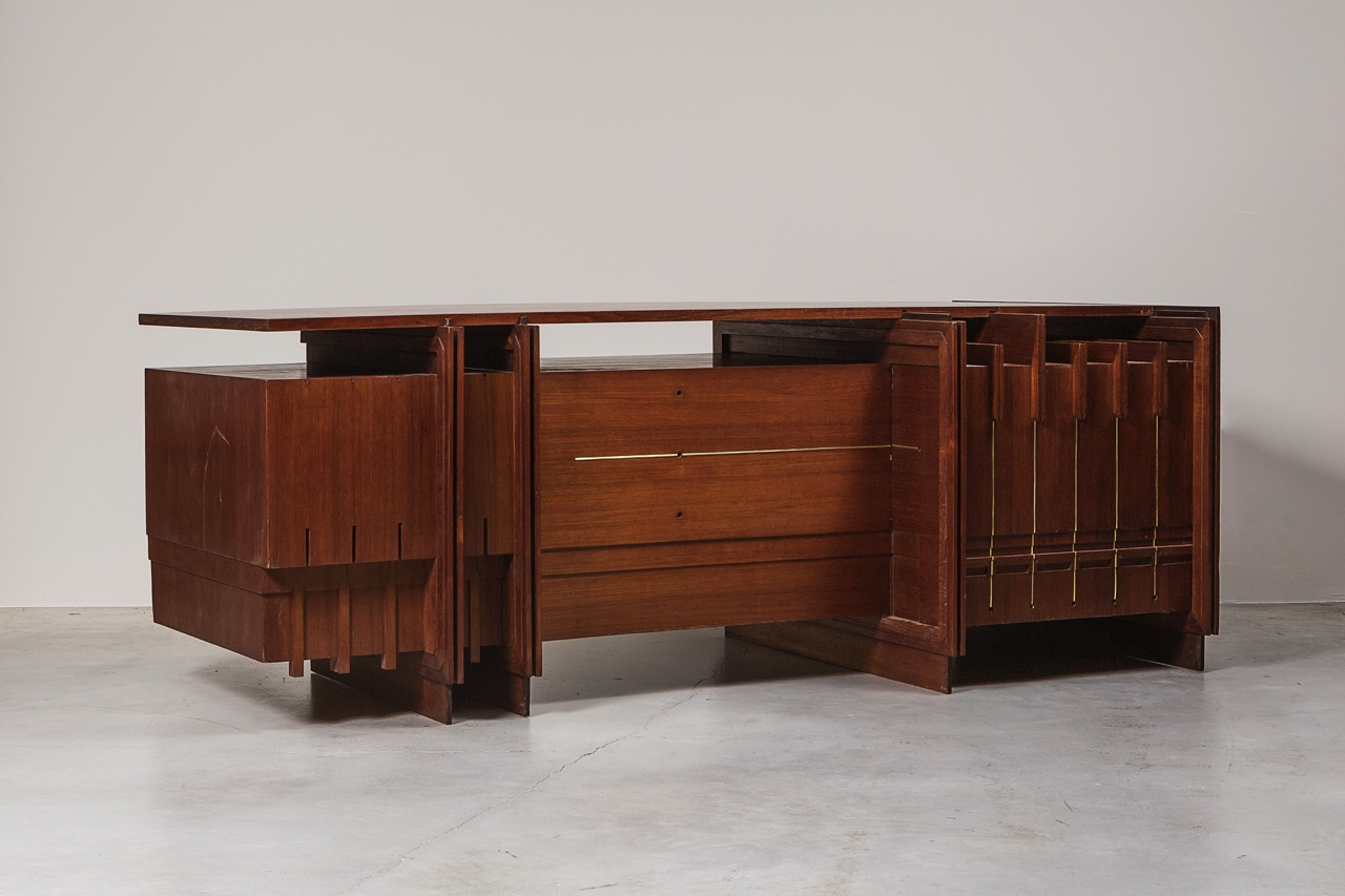 Manufactured in the 1950s, this desk was designed for the CEO of the Banco di San Geminiano e San Prospero in Modena. Giorgio Preti's design combines minimalist elegance with innovative technical solutions, resulting in pieces that are both visually striking and highly functional. The use of natural materials adds depth and refinement to the design, enhancing its sophisticated and timeless style.