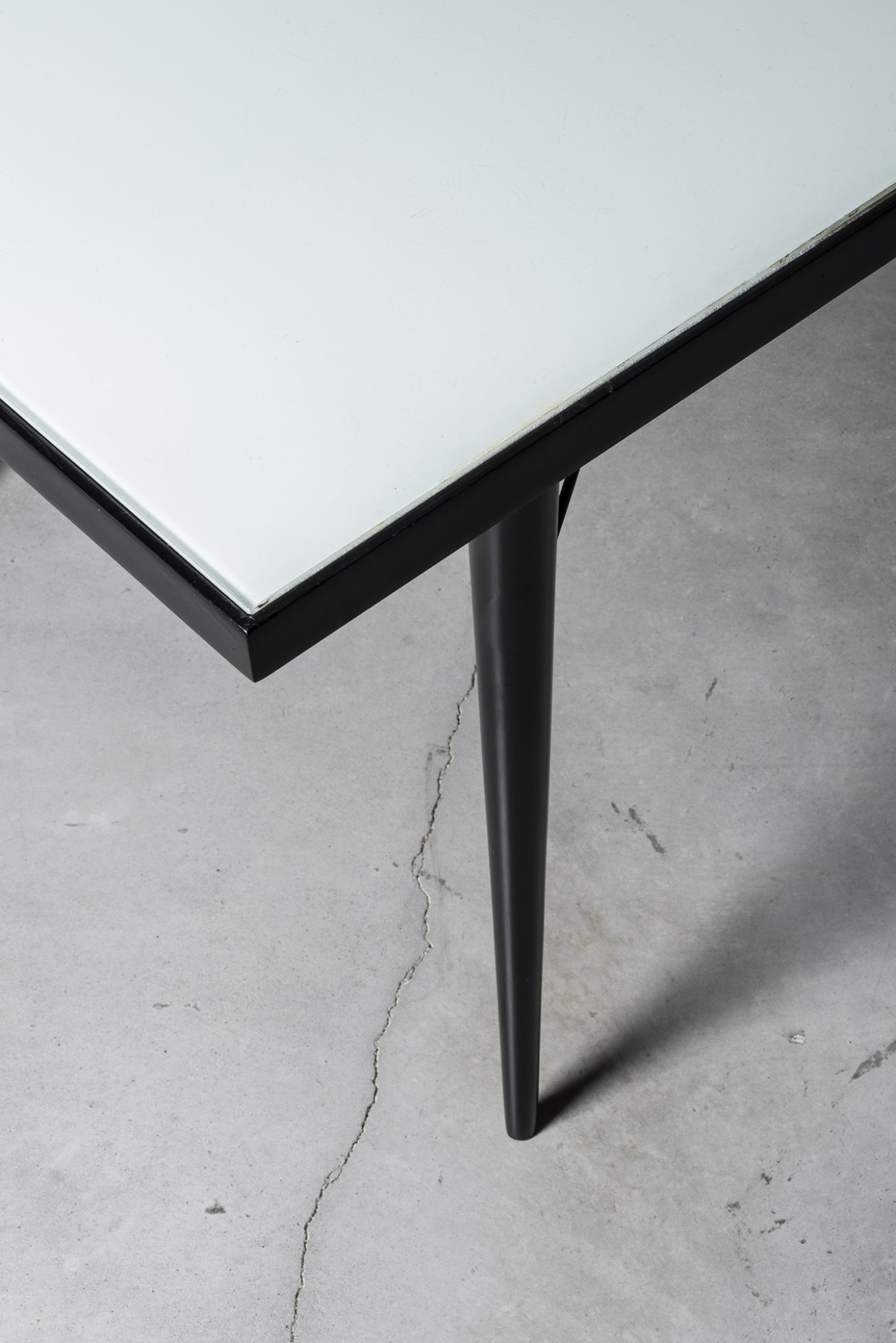 Ebonized jacarand? wood, iron, painted glass top