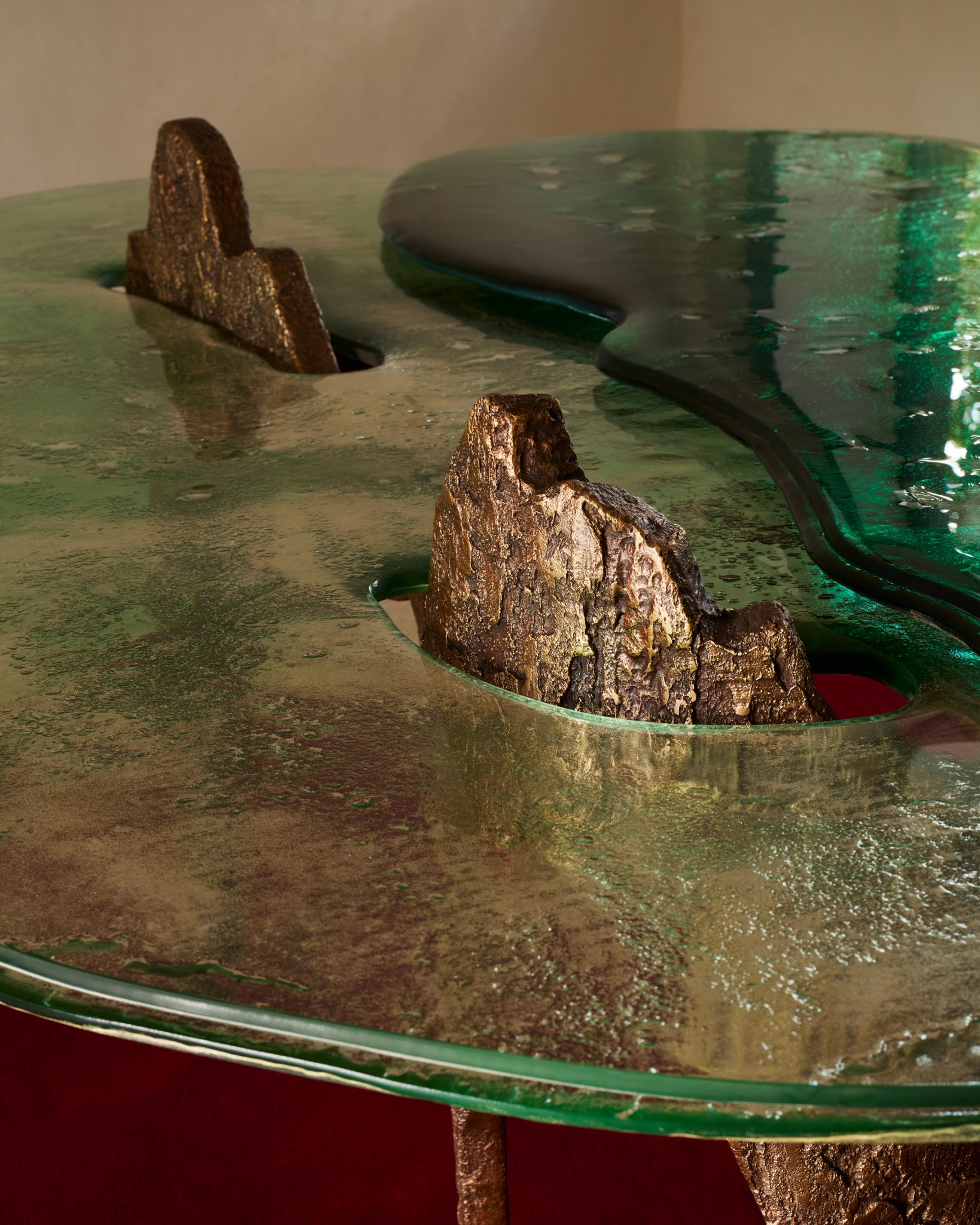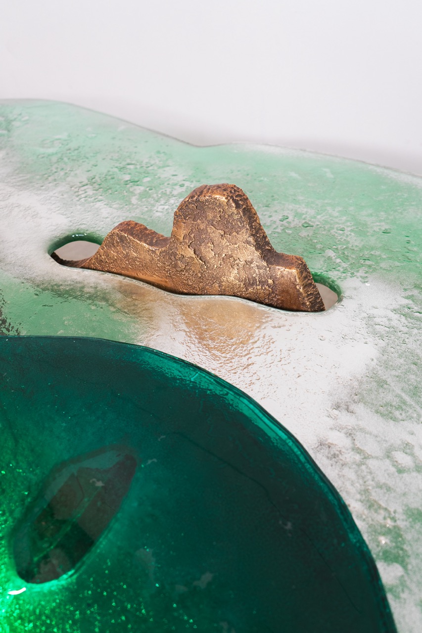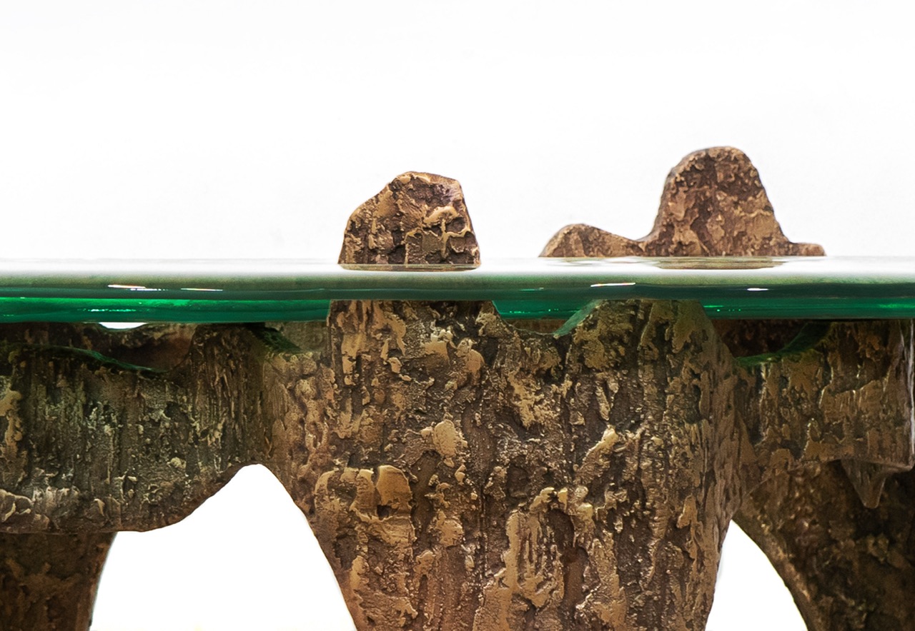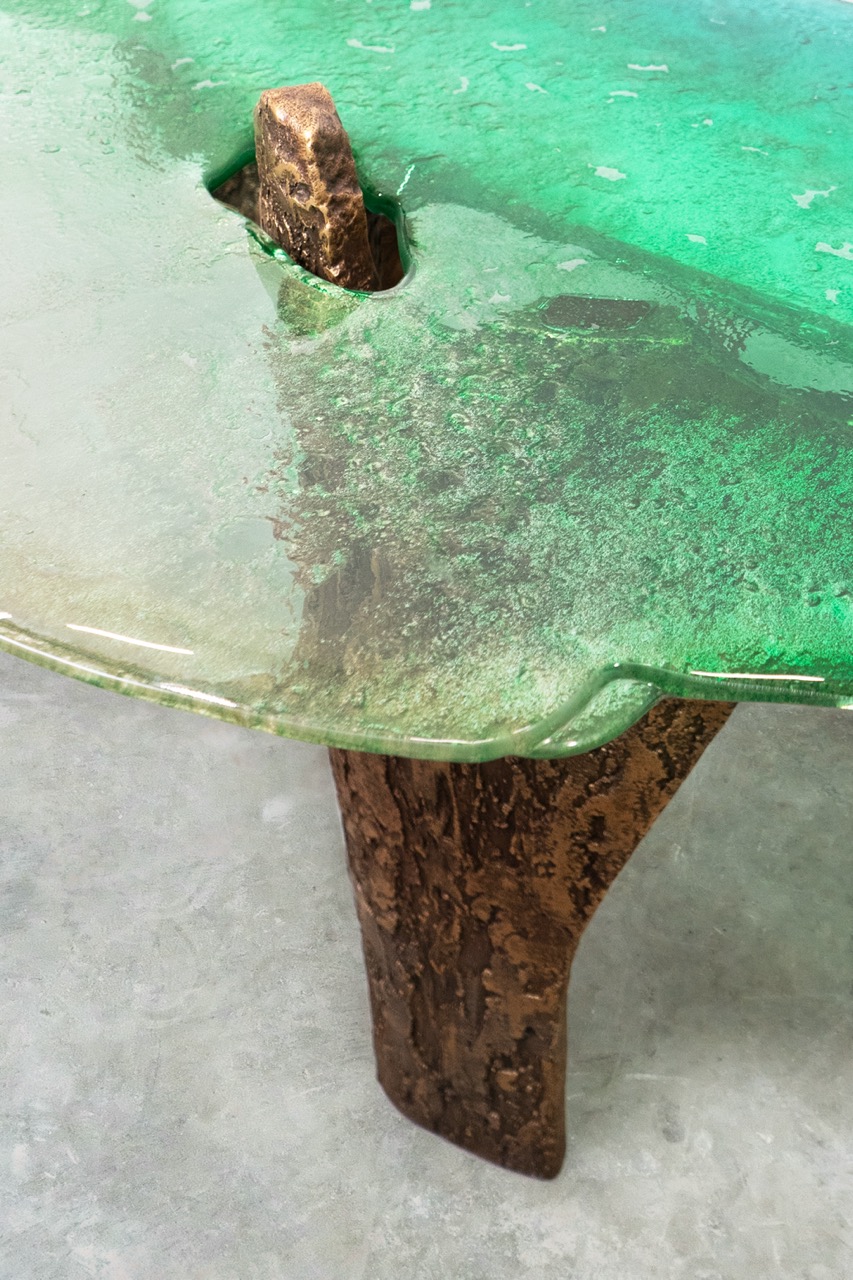 Named after Capri's famous coastal rock formations, the Faraglioni Collection translates their beauty and majesty into distinctive forms and precious materials, merging art and design in perfect symbiosis. Each piece tells a story of contrasts and harmonies. Sturdy legs of cast bronze, with shapes reminiscent of rocky concretions, support fused glass tops that spread out like sea waves.