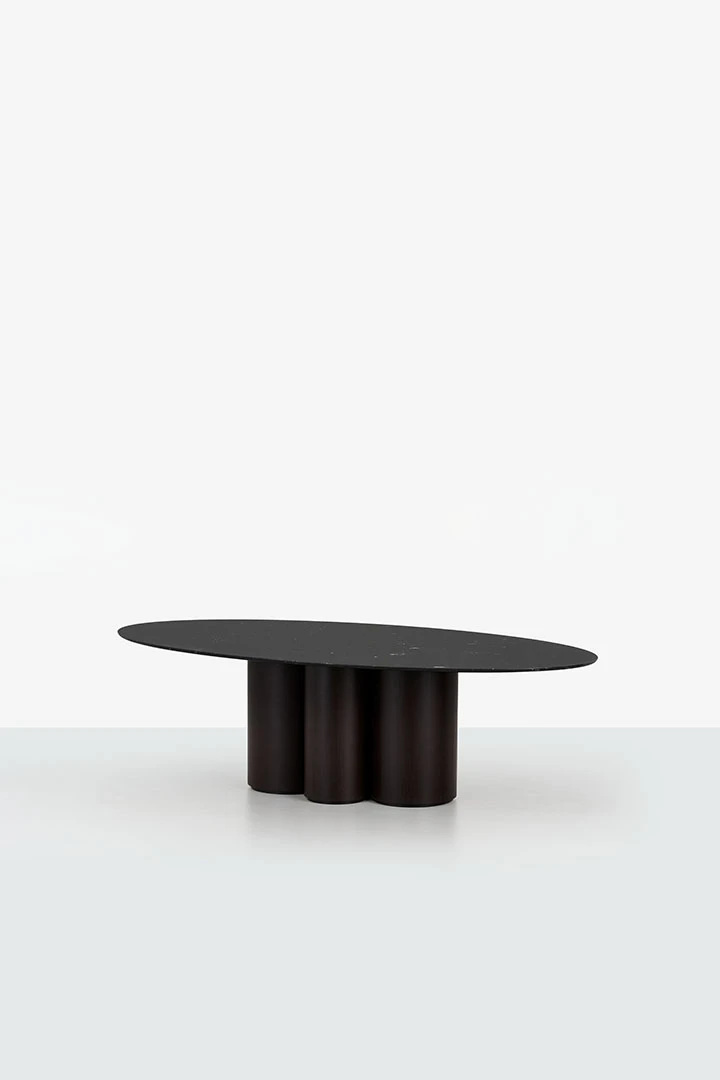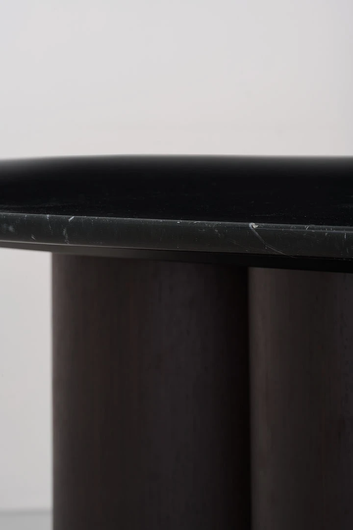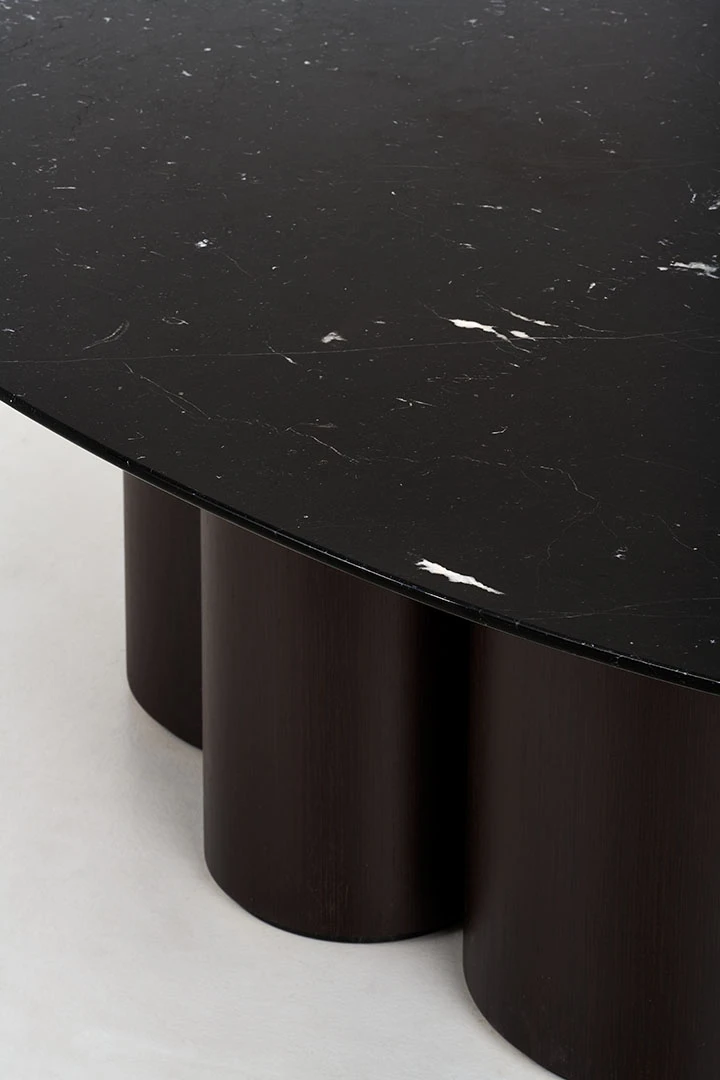 dark wood structure, nero marquina marble top