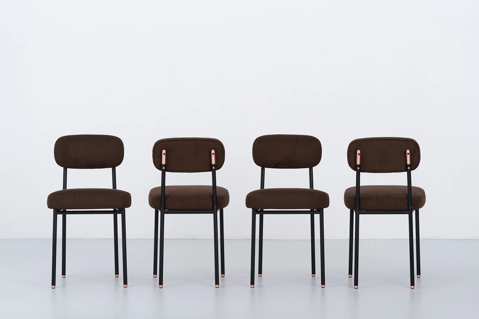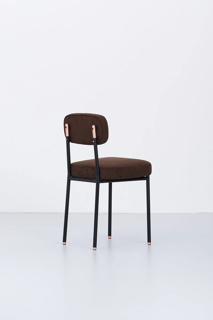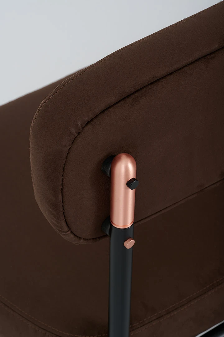 Metal structure, black laquered with copper details, coffee Suede upholstery