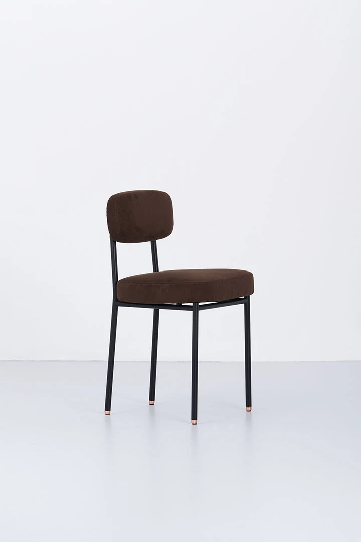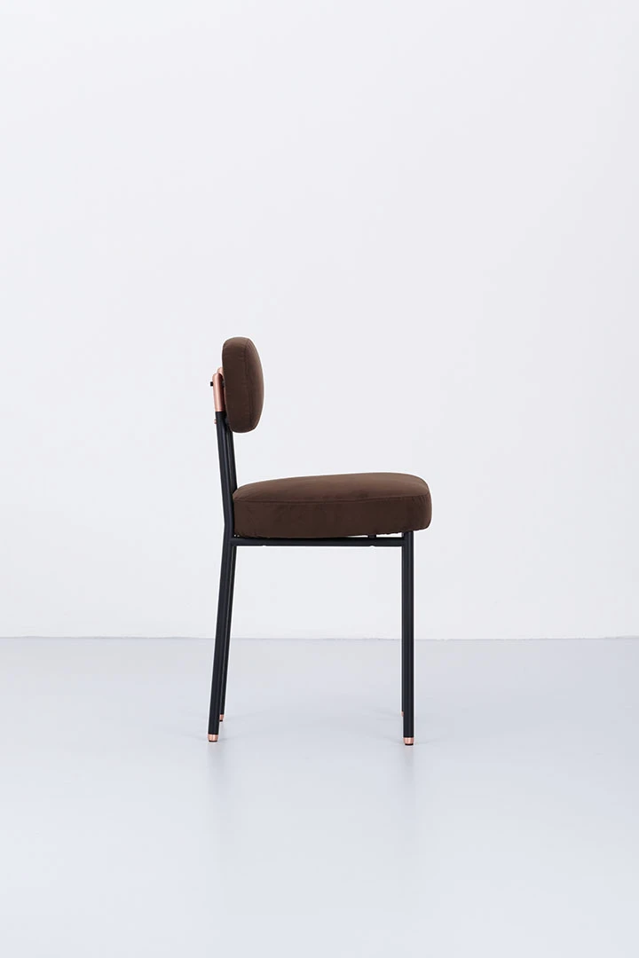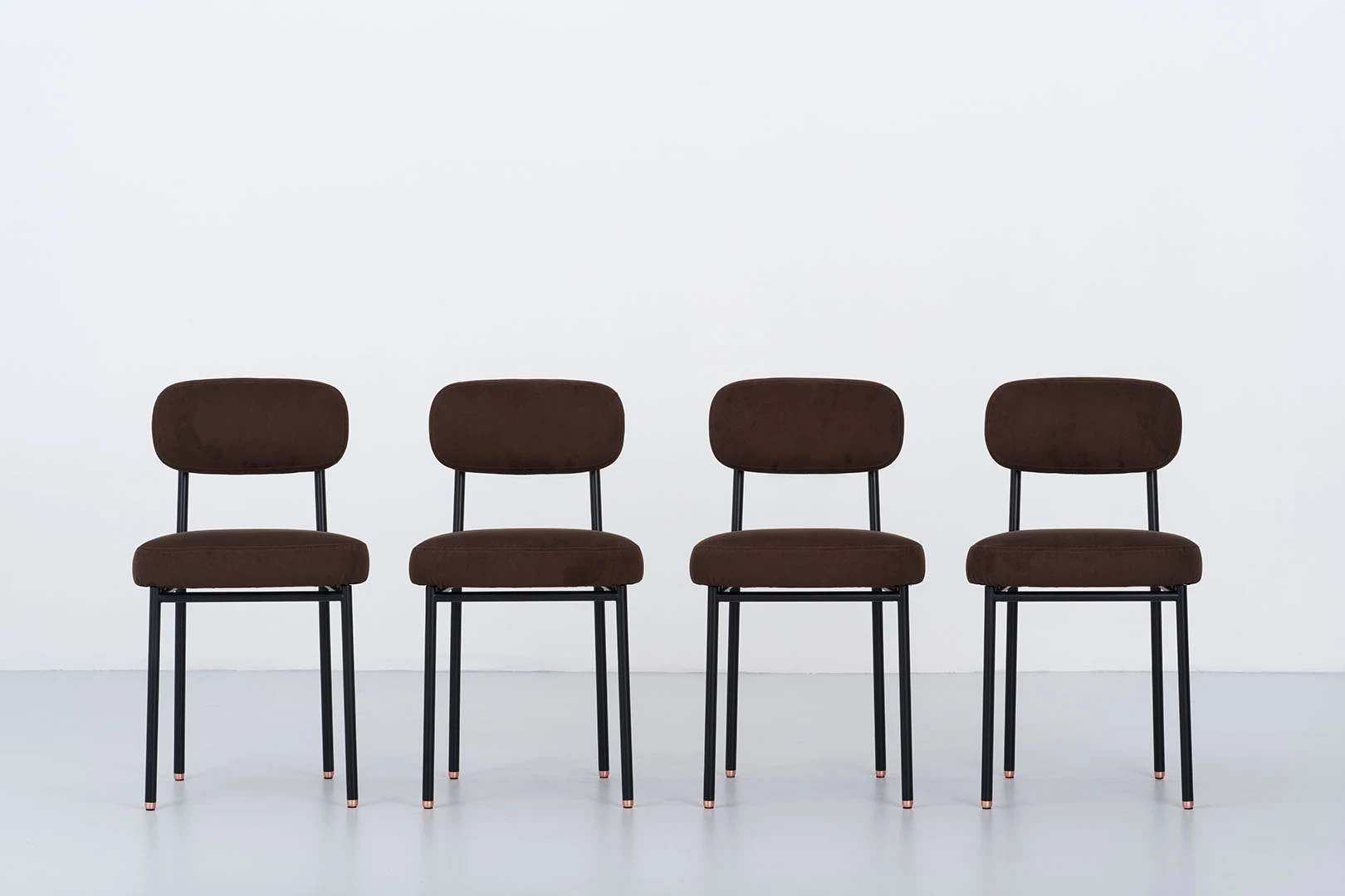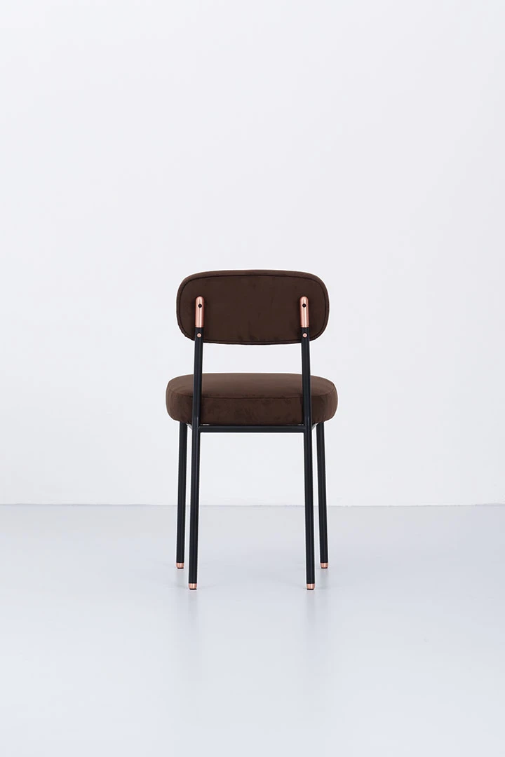 Metal structure, black laquered with copper details, coffee Suede upholstery