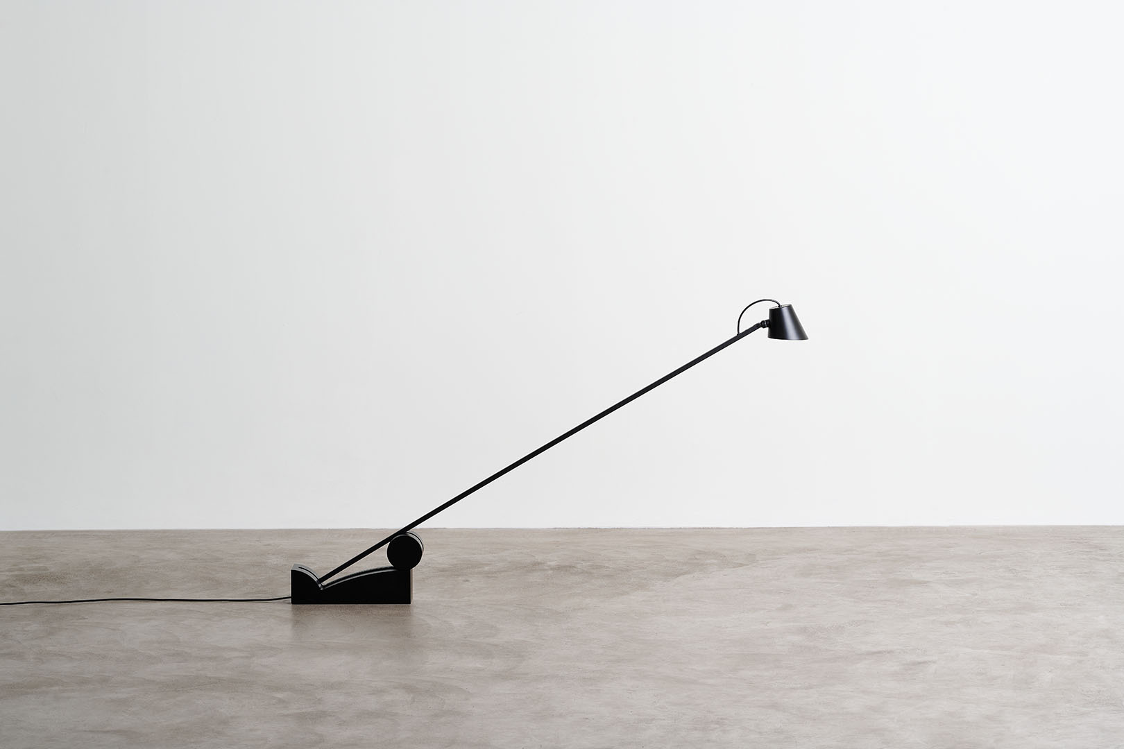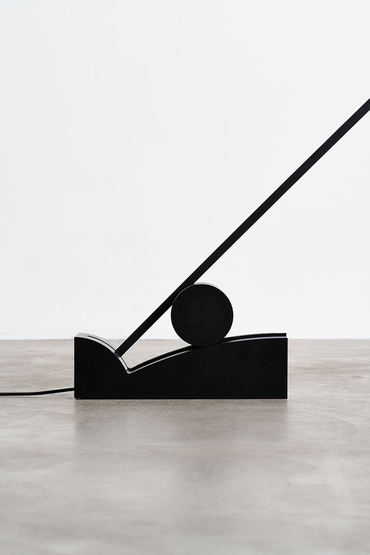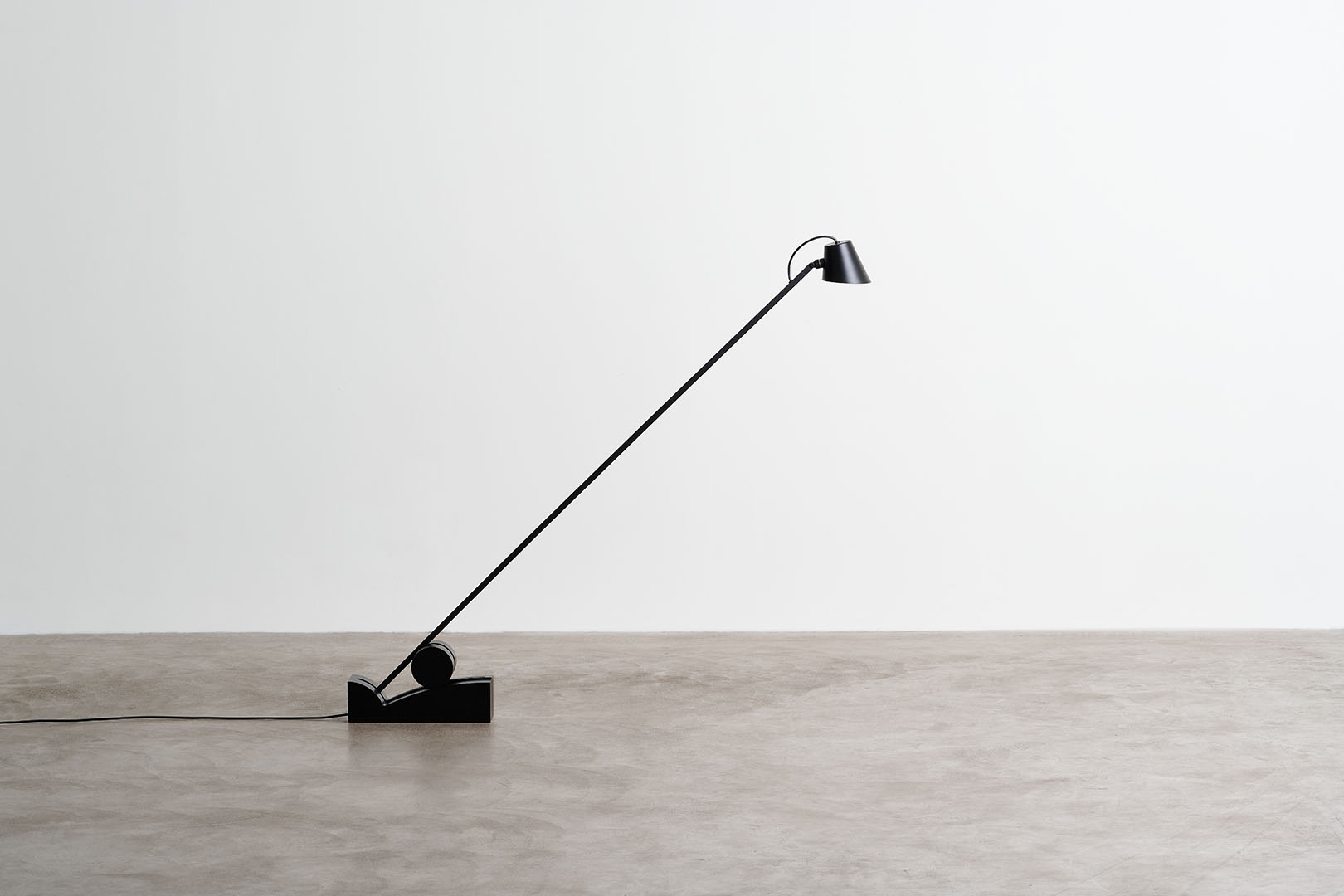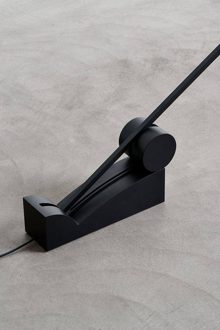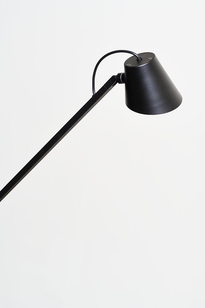 Beauty is distilled into essential, refined diagonal line that creates the structure for a cantilevered floor lamp. Pivoting on a minimalist base, the pitch-black silhouette elegantly cuts through space allowing the light source to slide in different positions.