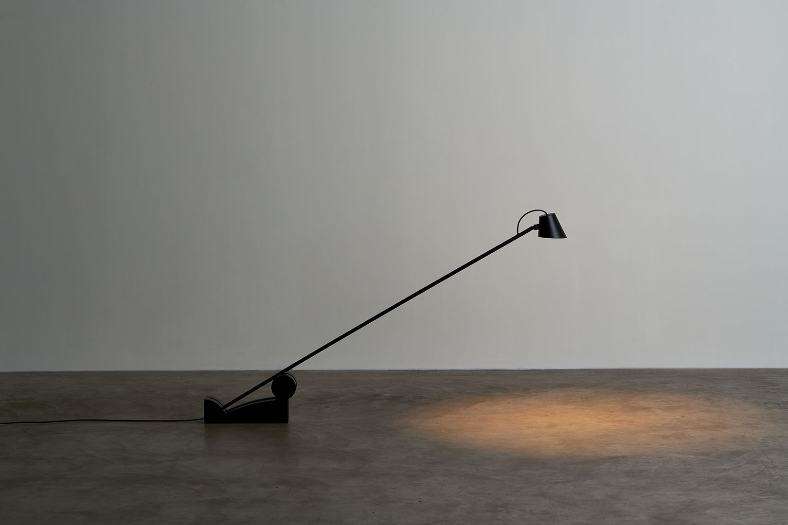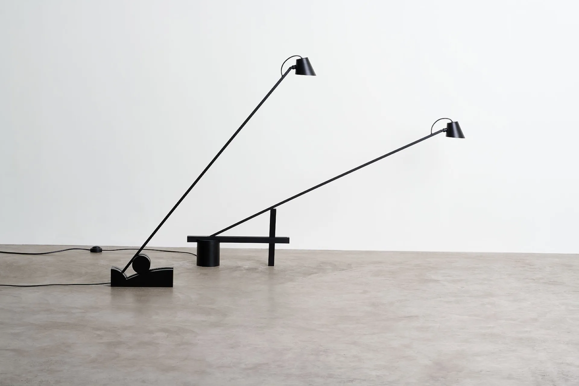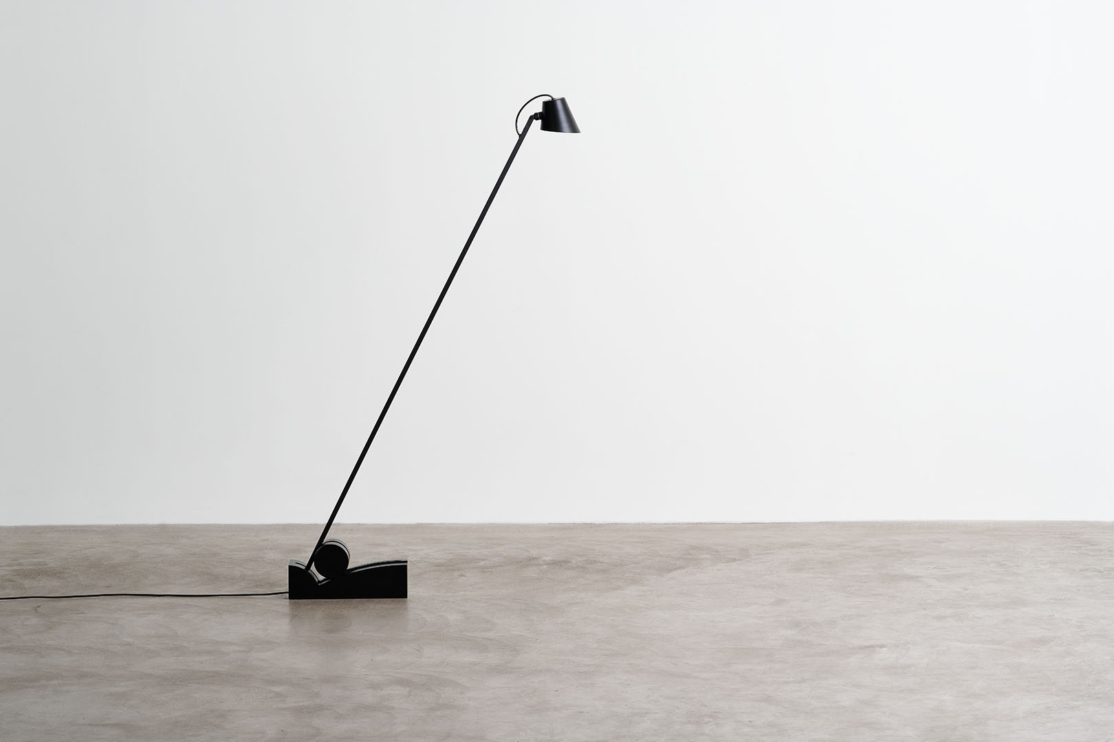 Beauty is distilled into essential, refined diagonal line that creates the structure for a cantilevered floor lamp. Pivoting on a minimalist base, the pitch-black silhouette elegantly cuts through space allowing the light source to slide in different positions.