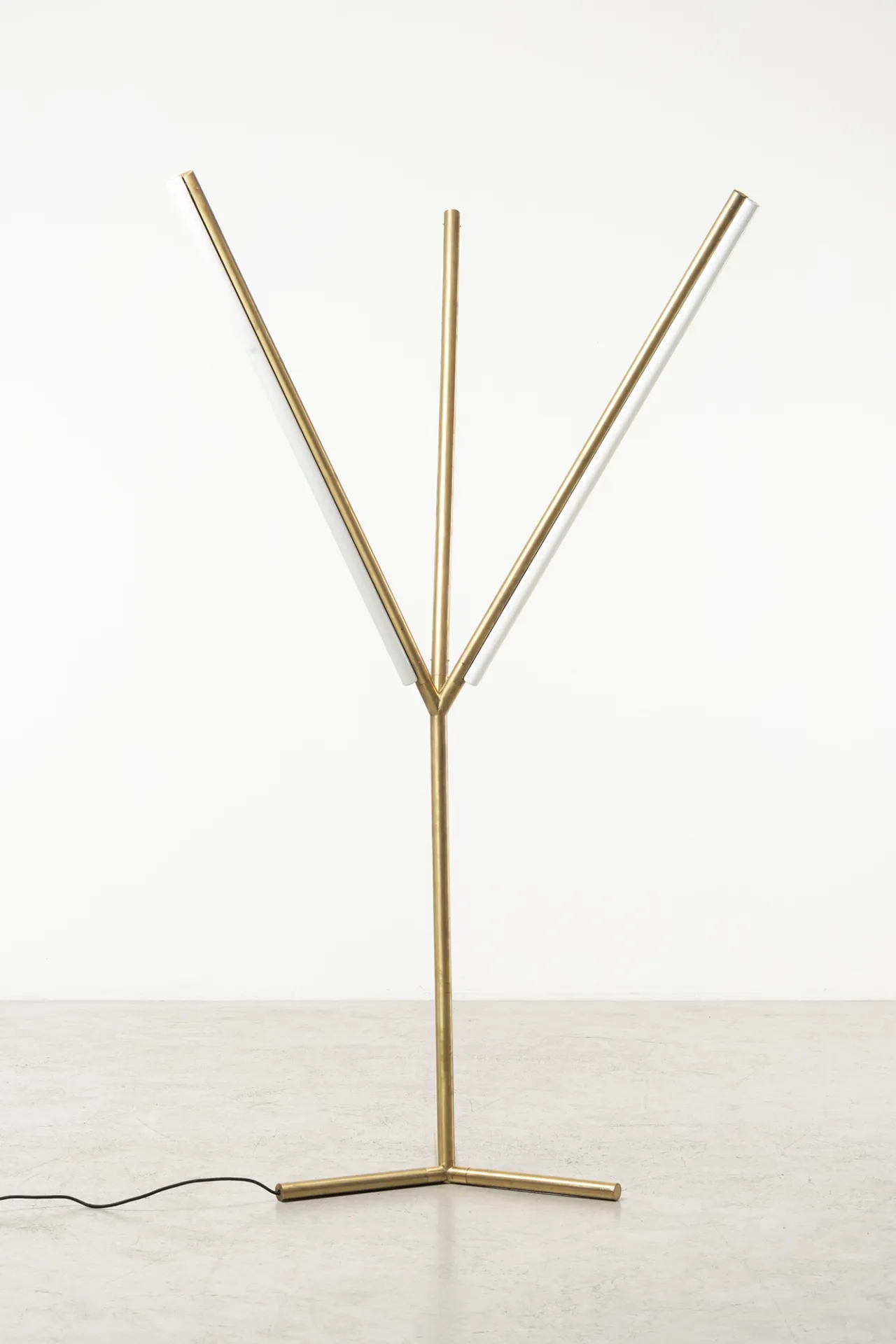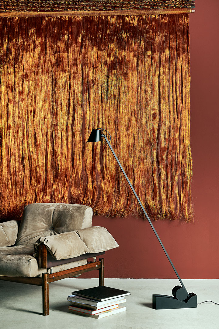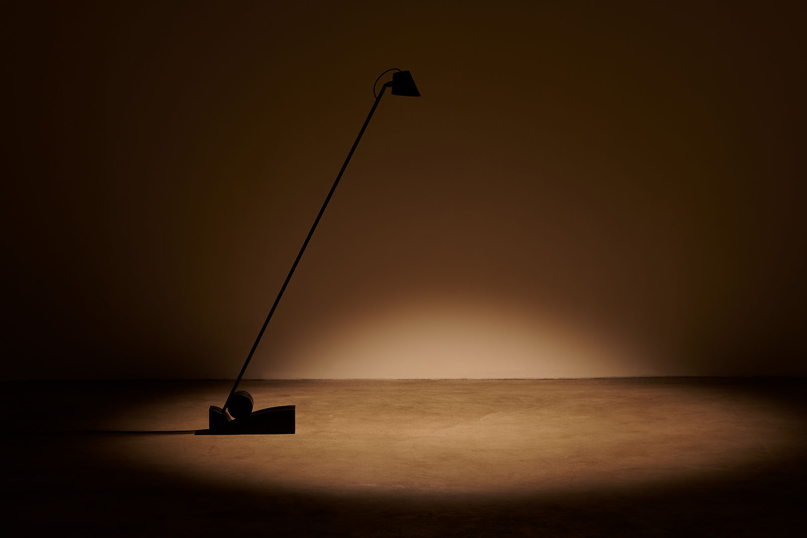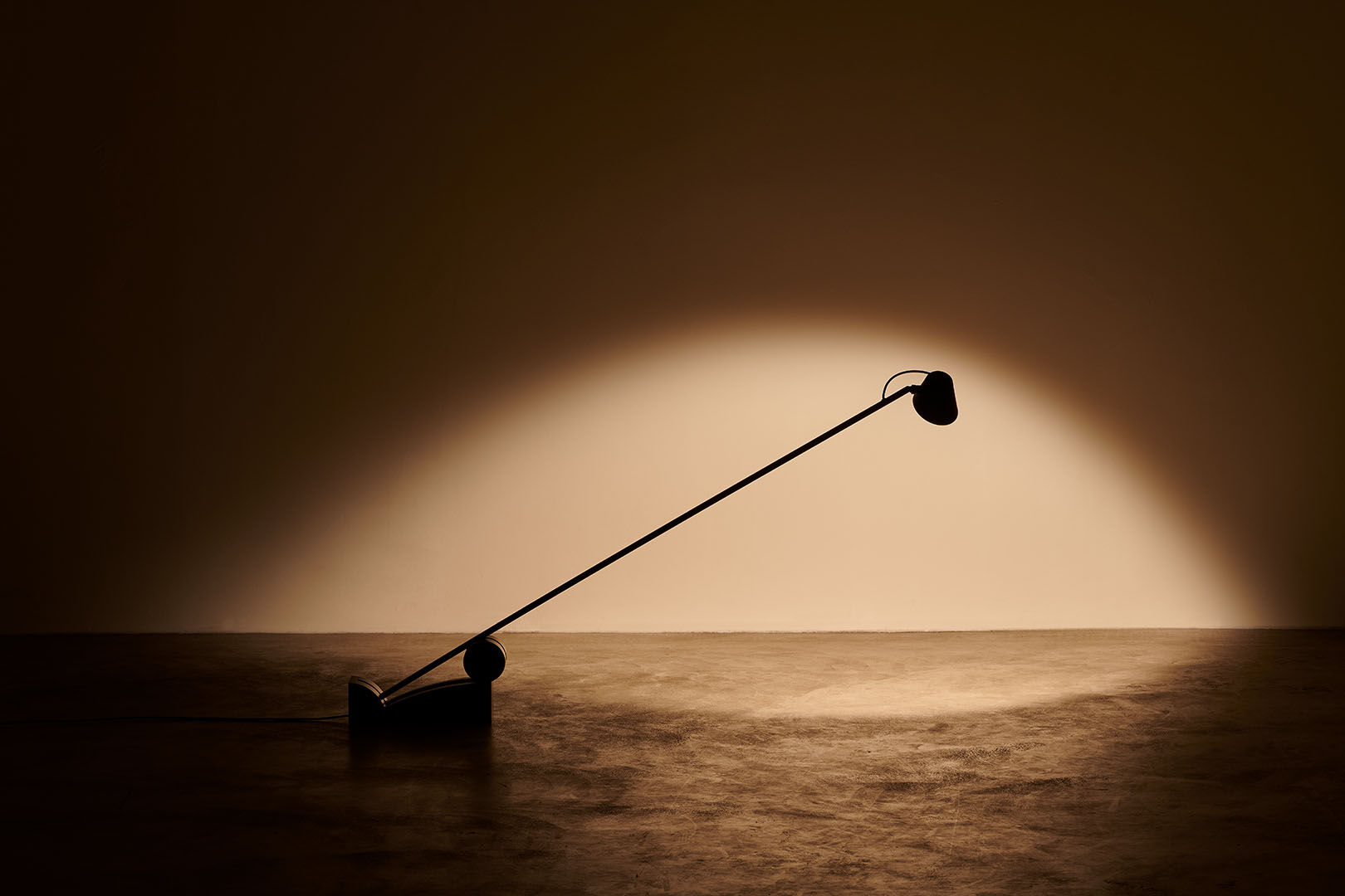 Beauty is distilled into essential, refined diagonal line that creates the structure for a cantilevered floor lamp. Pivoting on a minimalist base, the pitch-black silhouette elegantly cuts through space allowing the light source to slide in different positions.