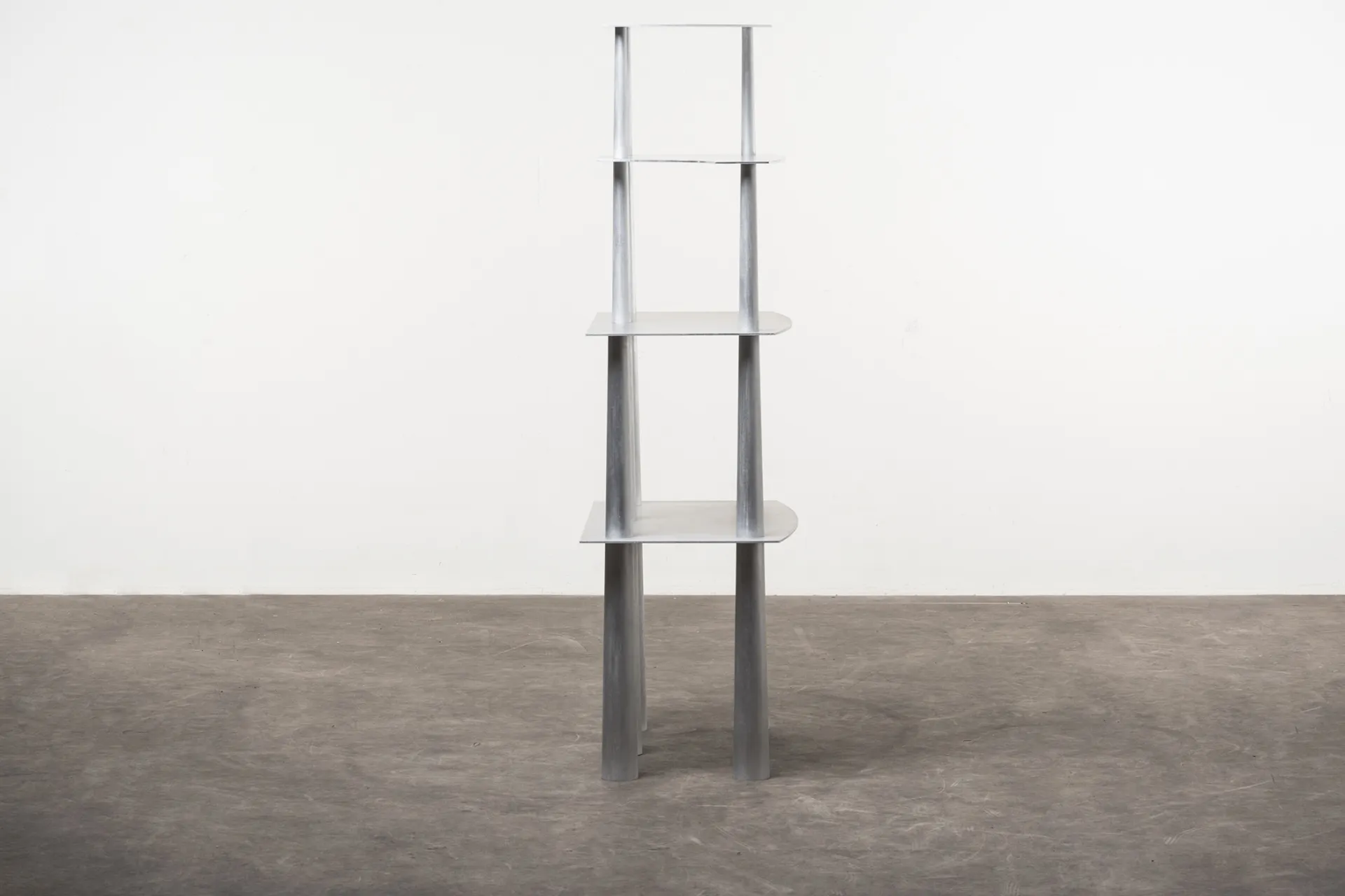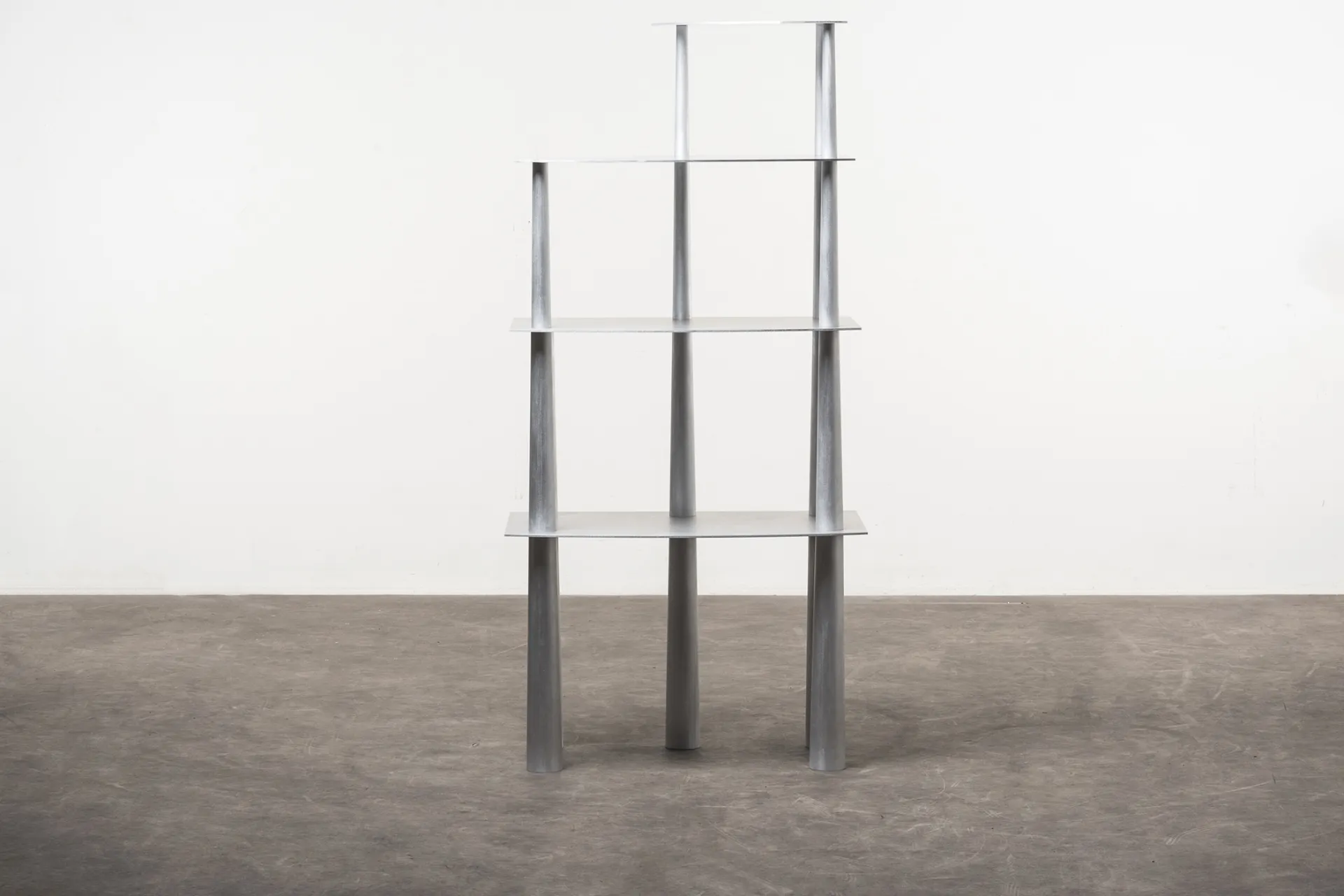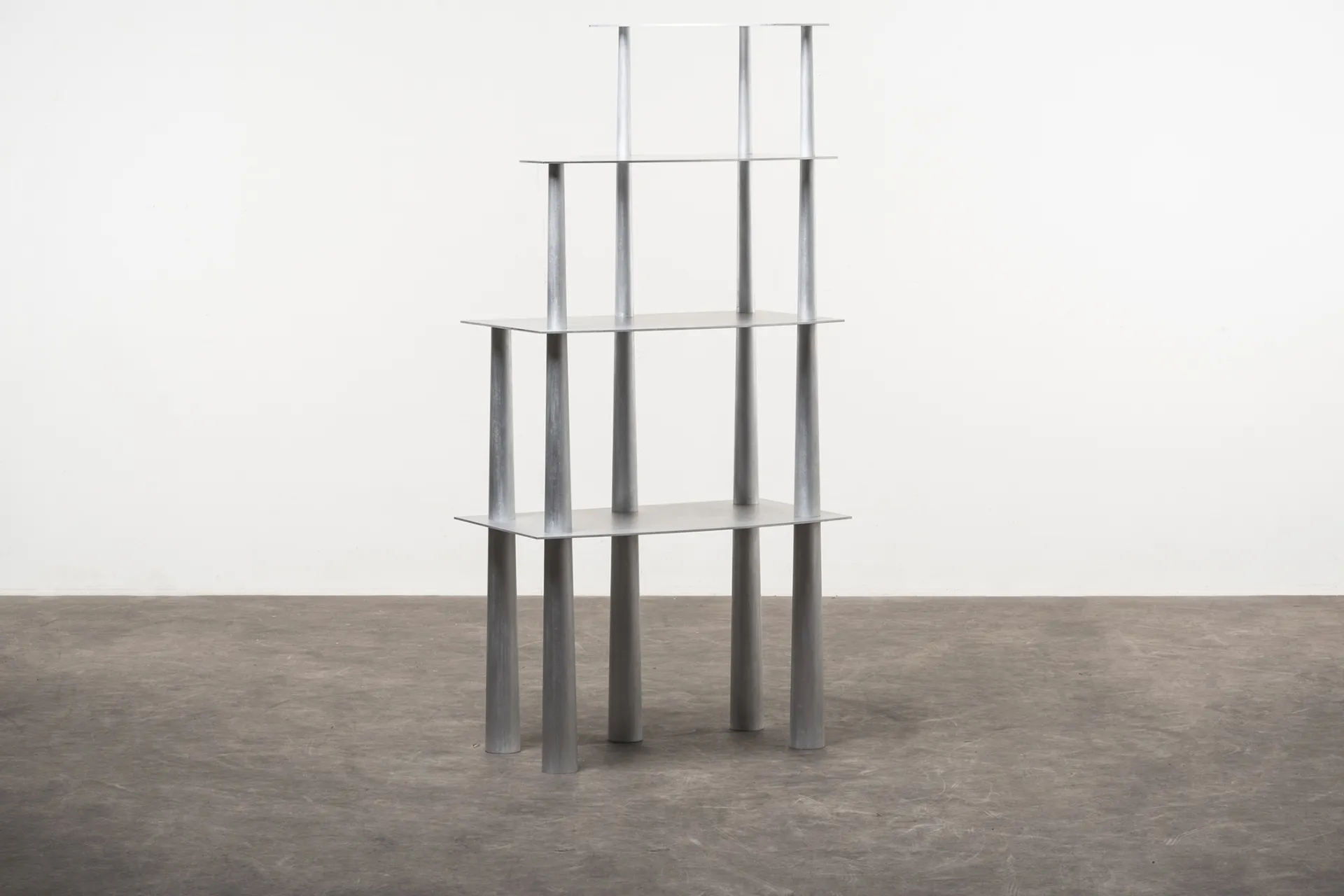 Designed by Destroyers / Builders, the High Section bookshelf was created as a limited edition for Nilufar. Featuring an open shelving system and conical legs, this piece reimagines the structure of the environment, deconstructing and reinterpreting past traditions while envisioning future possibilities. At its core, the design reflects a deep interest in rediscovering the fundamental forms rooted in the Anthropocene, on which human layers are added, shaping both the object and its narrative over time.