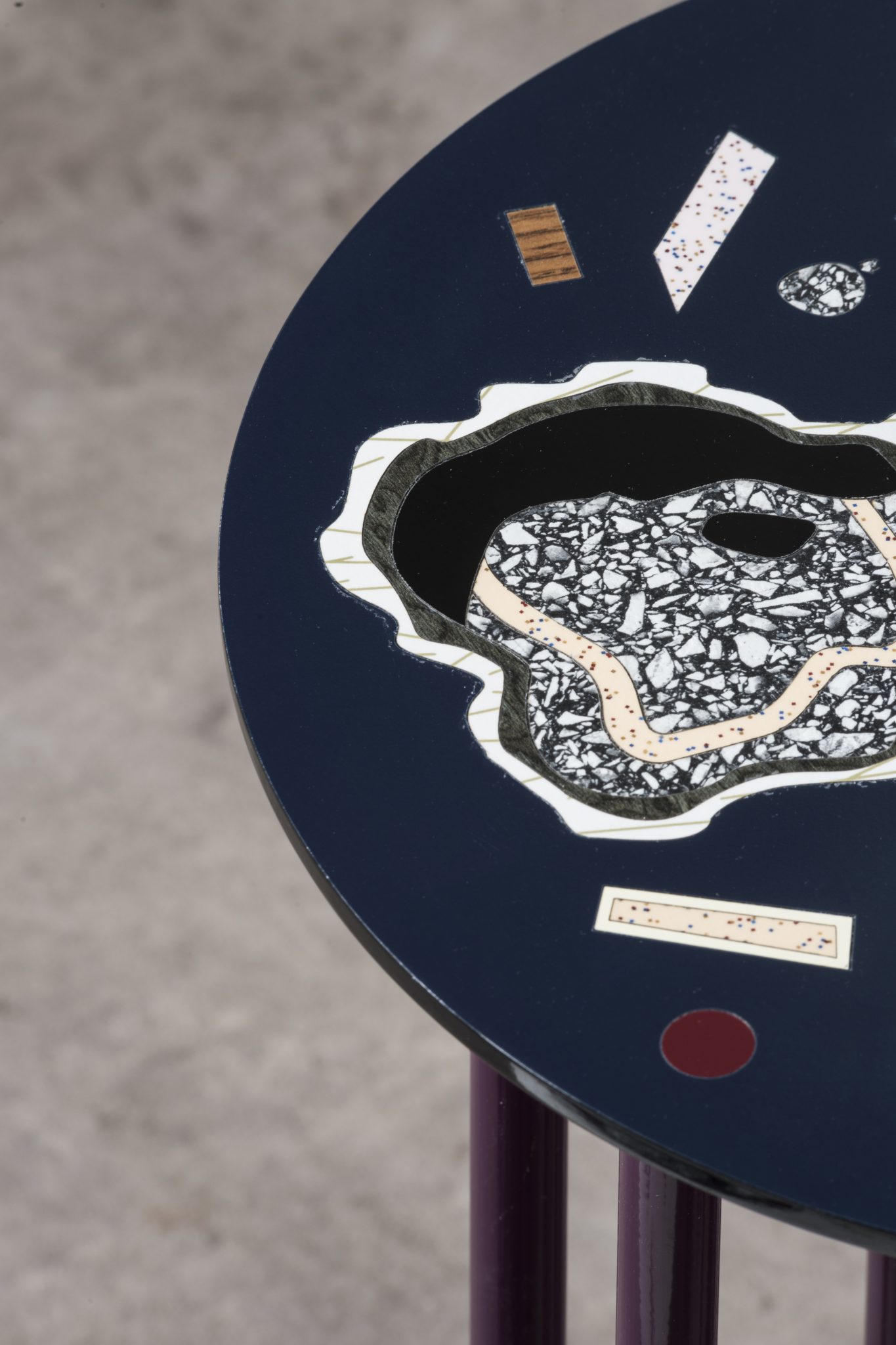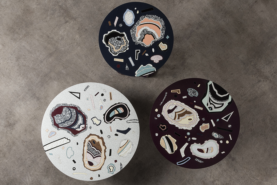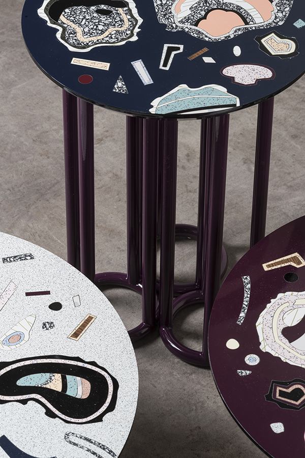An extension of the Super Fake Project, Hot Rocks is a series of furniture inspired by the heat and drama of volcanic explosions. Bethan reinterprets her classic lunar patterns in warmer, darker colours. Exclusively crafted for Nilufar in collaboration with Abet Laminati, the collection uses a marquetry technique to celebrate the qualities of laminates, treating each one like a rare wood veneers rather than a cheap substitute.